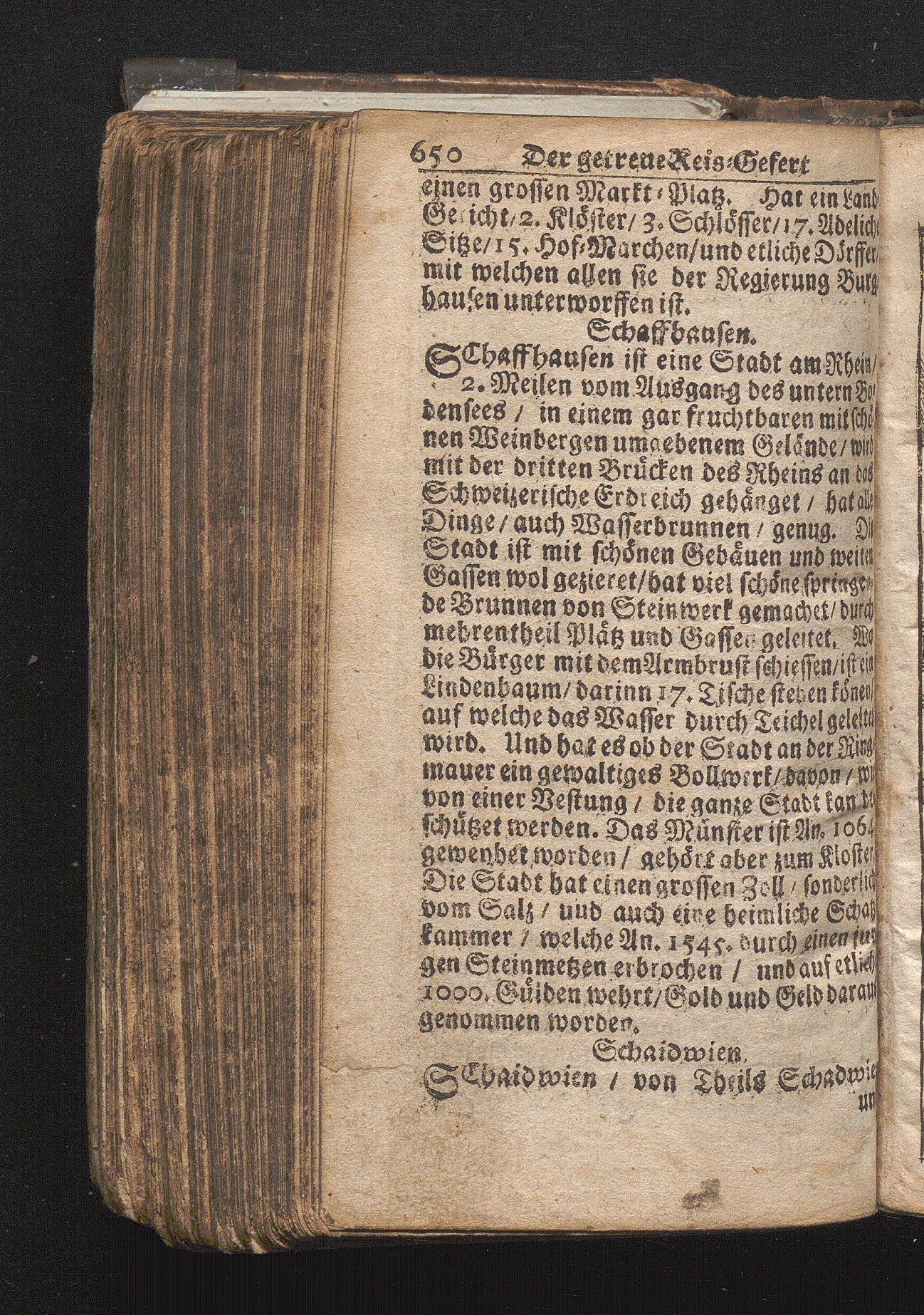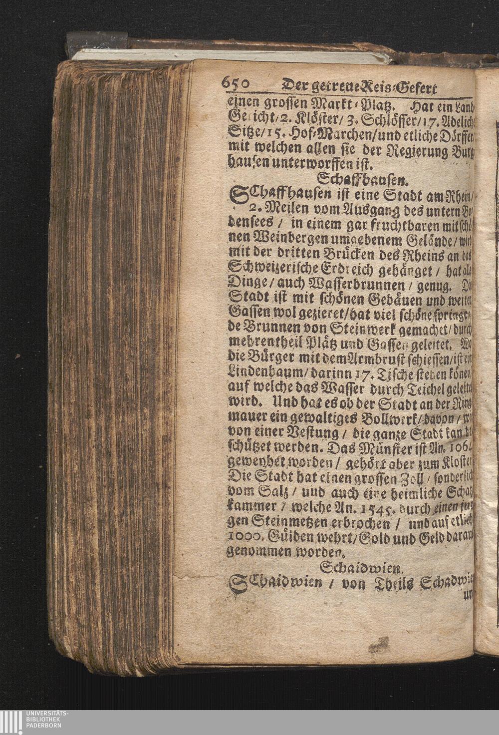 Der getreue Reiß-Gefert durch Ober- und Nieder-Teutschland : Das ist: Grundrichtige und ausführliche Abhandlung derer jenigen Residenzien/ Städte/ Schlösser/ Vestungen/ Städtlein und nahmhafften Markflecken/ welche so wol in Ober- als Nieder-Teutschland/ einem Reisenden sich hin und wieder vorstellig machen und zwar solcher Gestalt/ daß darinn derer Ursprung/ Aufnahm/ Fortification/ Raritäten/ herrliche Gebäue/ und Glück- und Unglücks-Fälle bis auf gegenwärtige Zeit fortgesetzt enthalten. Dabey auch noch über das ein absonderlicher kurz-gefasster Weegweiser angehänget zu finden/ worinnen klärlich zu sehen, wie viel Meilen ein Ort von dem andern entlegen. Alles aus denen bewährtesten Scribenten hervorgesuchet/ zum Nutz-Ergötzen mitgetheilet ...