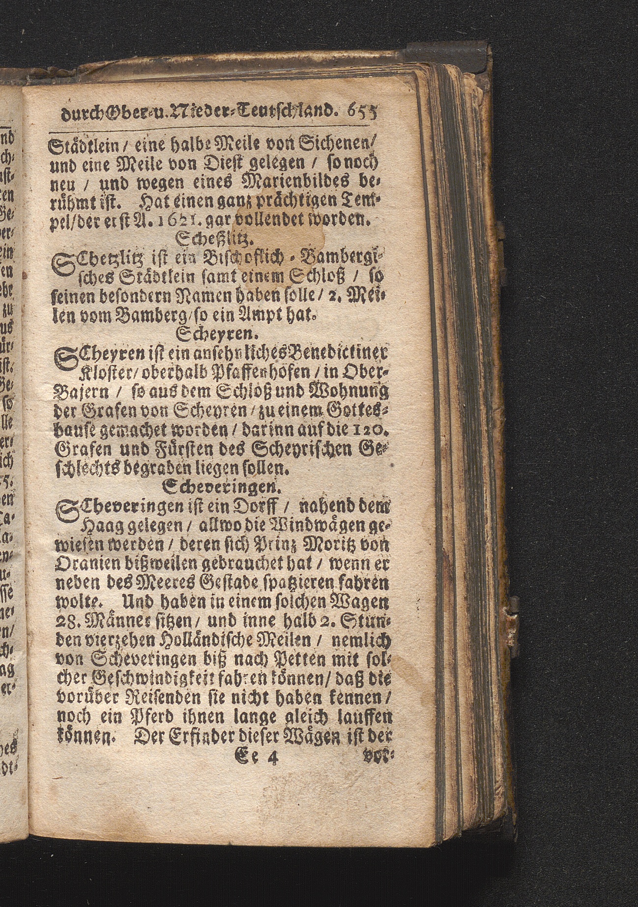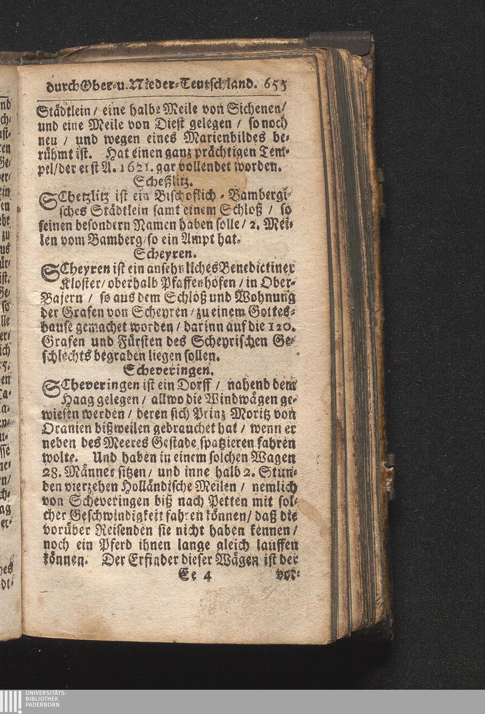 Der getreue Reiß-Gefert durch Ober- und Nieder-Teutschland : Das ist: Grundrichtige und ausführliche Abhandlung derer jenigen Residenzien/ Städte/ Schlösser/ Vestungen/ Städtlein und nahmhafften Markflecken/ welche so wol in Ober- als Nieder-Teutschland/ einem Reisenden sich hin und wieder vorstellig machen und zwar solcher Gestalt/ daß darinn derer Ursprung/ Aufnahm/ Fortification/ Raritäten/ herrliche Gebäue/ und Glück- und Unglücks-Fälle bis auf gegenwärtige Zeit fortgesetzt enthalten. Dabey auch noch über das ein absonderlicher kurz-gefasster Weegweiser angehänget zu finden/ worinnen klärlich zu sehen, wie viel Meilen ein Ort von dem andern entlegen. Alles aus denen bewährtesten Scribenten hervorgesuchet/ zum Nutz-Ergötzen mitgetheilet ...