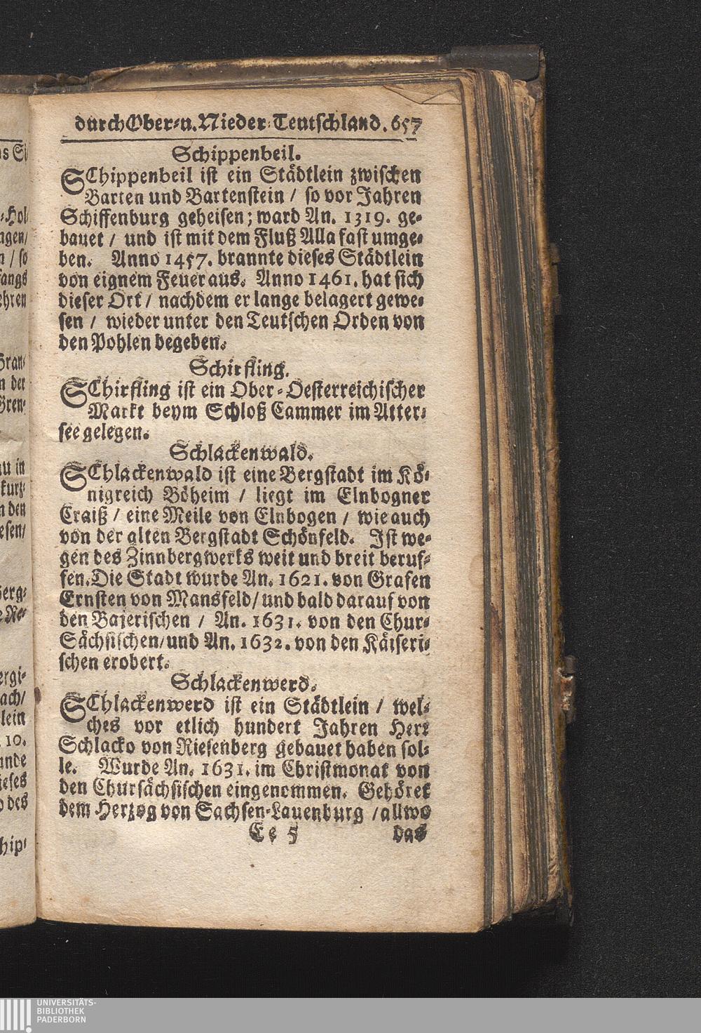 Der getreue Reiß-Gefert durch Ober- und Nieder-Teutschland : Das ist: Grundrichtige und ausführliche Abhandlung derer jenigen Residenzien/ Städte/ Schlösser/ Vestungen/ Städtlein und nahmhafften Markflecken/ welche so wol in Ober- als Nieder-Teutschland/ einem Reisenden sich hin und wieder vorstellig machen und zwar solcher Gestalt/ daß darinn derer Ursprung/ Aufnahm/ Fortification/ Raritäten/ herrliche Gebäue/ und Glück- und Unglücks-Fälle bis auf gegenwärtige Zeit fortgesetzt enthalten. Dabey auch noch über das ein absonderlicher kurz-gefasster Weegweiser angehänget zu finden/ worinnen klärlich zu sehen, wie viel Meilen ein Ort von dem andern entlegen. Alles aus denen bewährtesten Scribenten hervorgesuchet/ zum Nutz-Ergötzen mitgetheilet ...