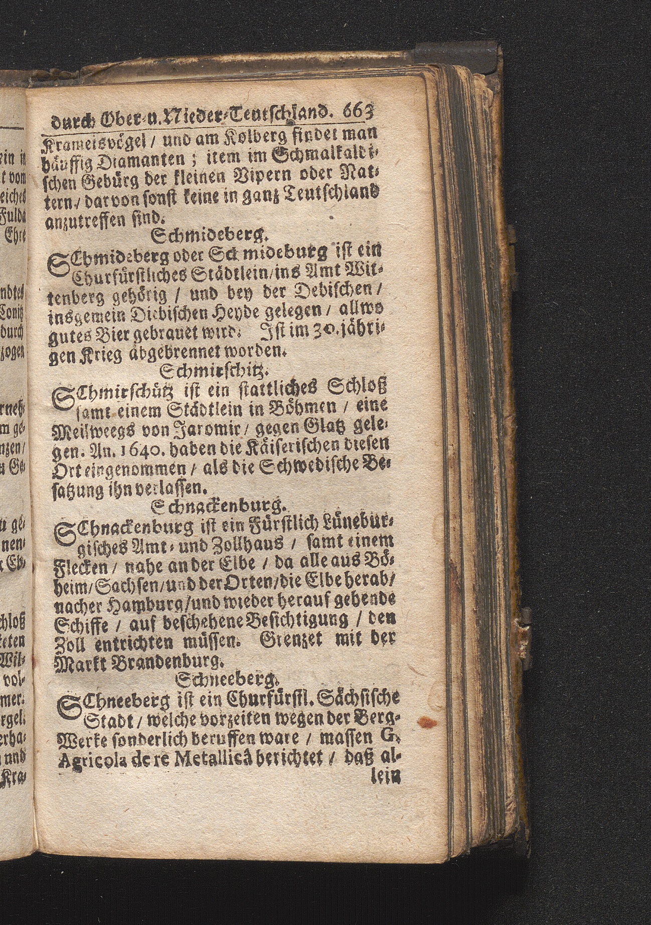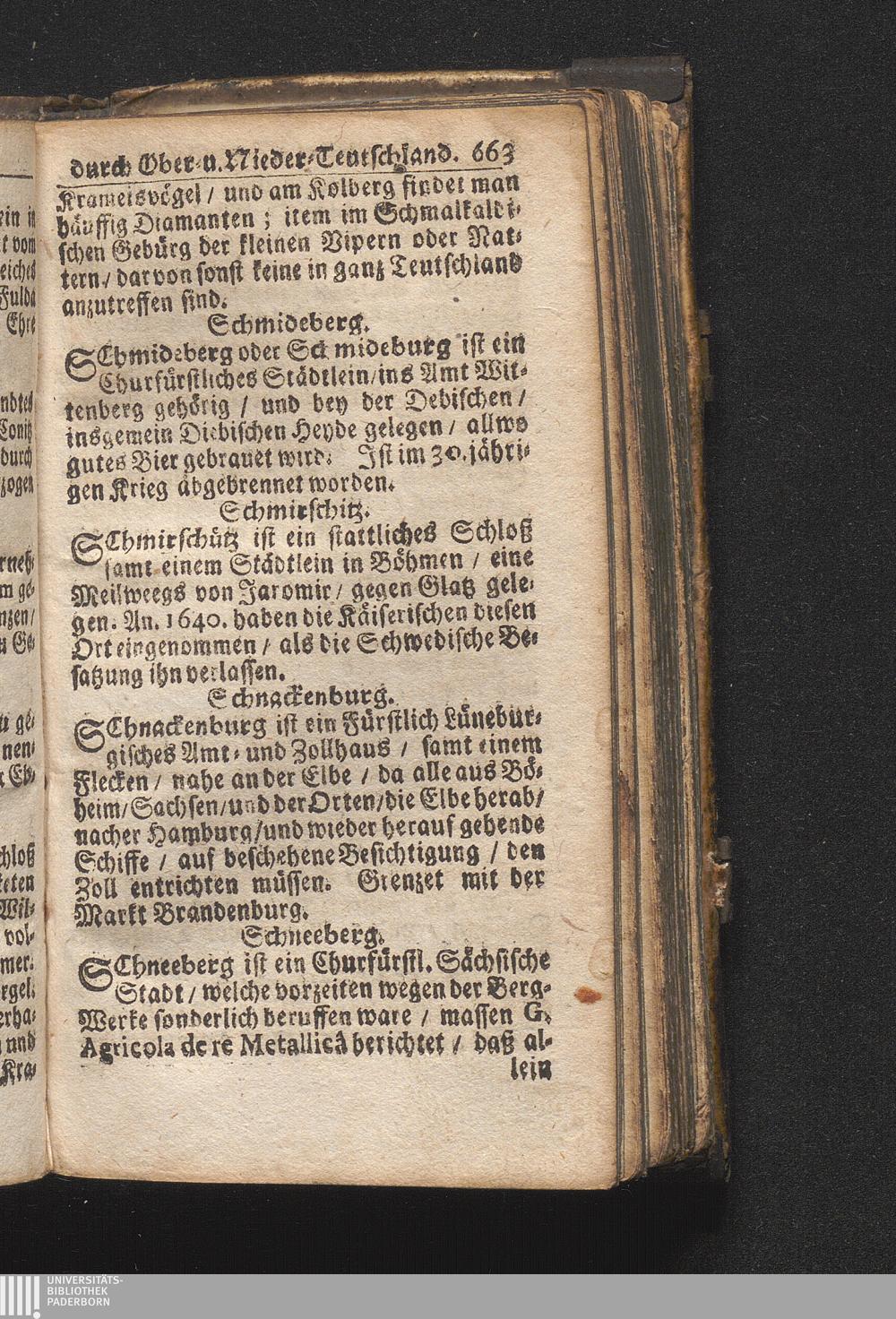 Der getreue Reiß-Gefert durch Ober- und Nieder-Teutschland : Das ist: Grundrichtige und ausführliche Abhandlung derer jenigen Residenzien/ Städte/ Schlösser/ Vestungen/ Städtlein und nahmhafften Markflecken/ welche so wol in Ober- als Nieder-Teutschland/ einem Reisenden sich hin und wieder vorstellig machen und zwar solcher Gestalt/ daß darinn derer Ursprung/ Aufnahm/ Fortification/ Raritäten/ herrliche Gebäue/ und Glück- und Unglücks-Fälle bis auf gegenwärtige Zeit fortgesetzt enthalten. Dabey auch noch über das ein absonderlicher kurz-gefasster Weegweiser angehänget zu finden/ worinnen klärlich zu sehen, wie viel Meilen ein Ort von dem andern entlegen. Alles aus denen bewährtesten Scribenten hervorgesuchet/ zum Nutz-Ergötzen mitgetheilet ...