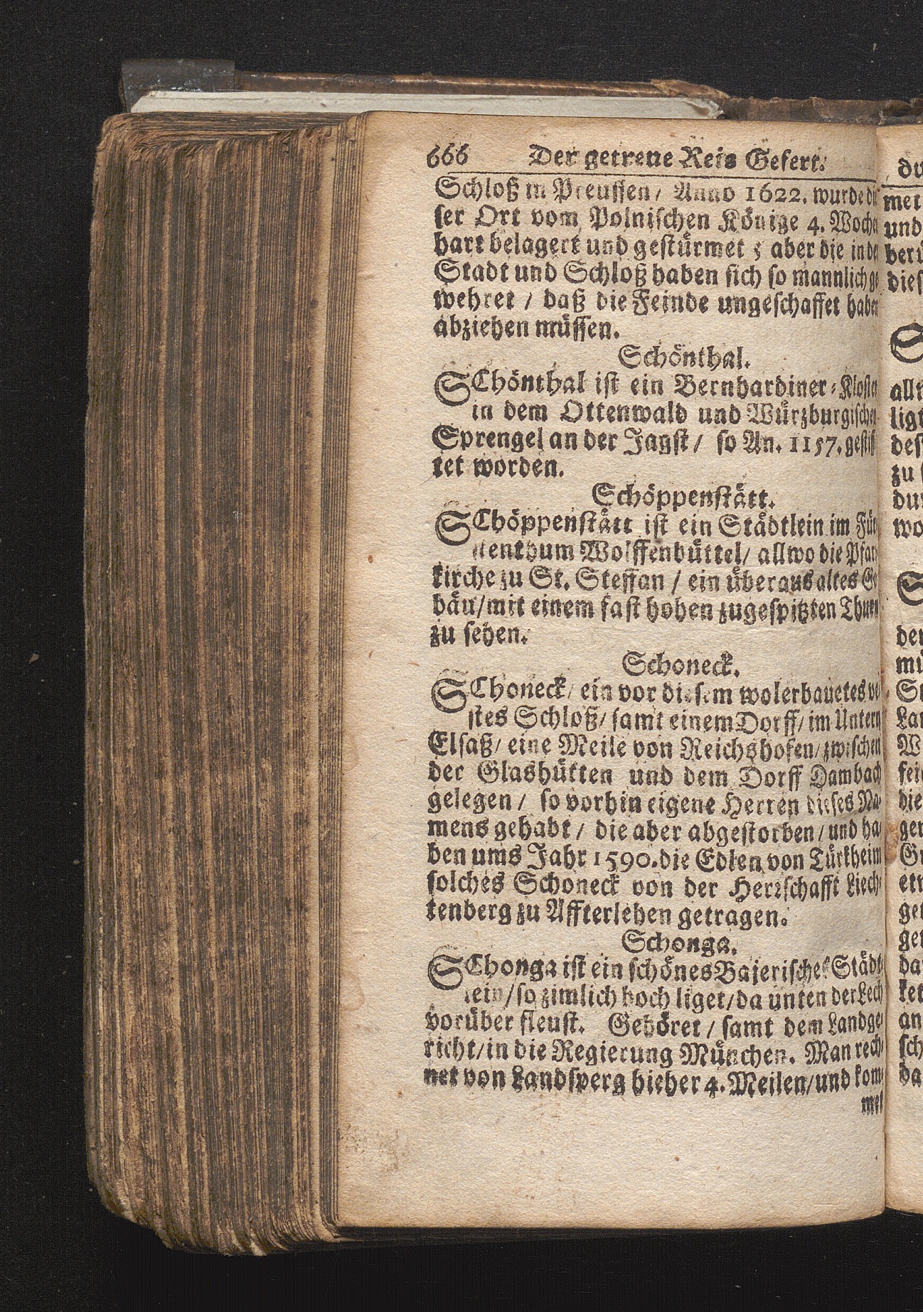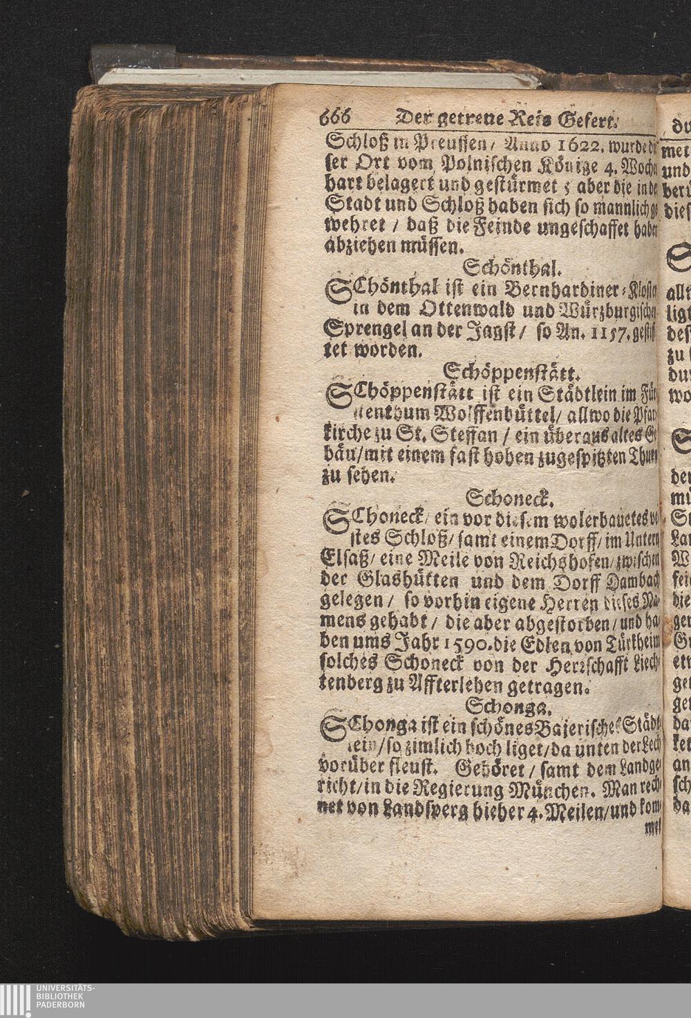 Der getreue Reiß-Gefert durch Ober- und Nieder-Teutschland : Das ist: Grundrichtige und ausführliche Abhandlung derer jenigen Residenzien/ Städte/ Schlösser/ Vestungen/ Städtlein und nahmhafften Markflecken/ welche so wol in Ober- als Nieder-Teutschland/ einem Reisenden sich hin und wieder vorstellig machen und zwar solcher Gestalt/ daß darinn derer Ursprung/ Aufnahm/ Fortification/ Raritäten/ herrliche Gebäue/ und Glück- und Unglücks-Fälle bis auf gegenwärtige Zeit fortgesetzt enthalten. Dabey auch noch über das ein absonderlicher kurz-gefasster Weegweiser angehänget zu finden/ worinnen klärlich zu sehen, wie viel Meilen ein Ort von dem andern entlegen. Alles aus denen bewährtesten Scribenten hervorgesuchet/ zum Nutz-Ergötzen mitgetheilet ...