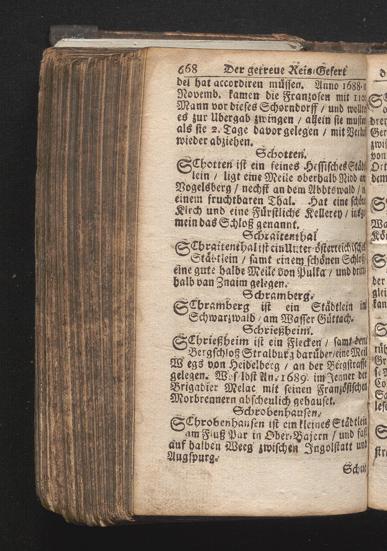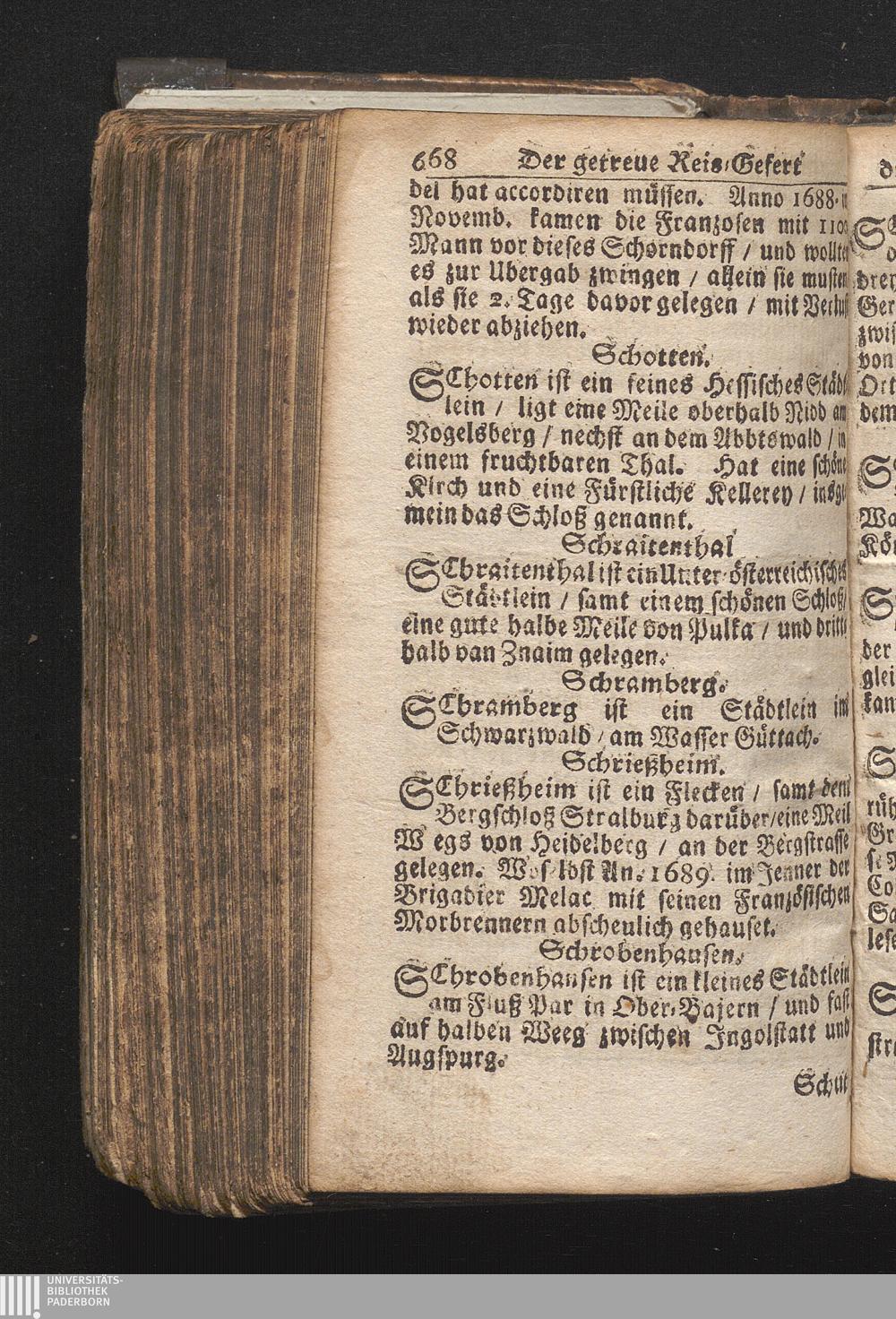 Der getreue Reiß-Gefert durch Ober- und Nieder-Teutschland : Das ist: Grundrichtige und ausführliche Abhandlung derer jenigen Residenzien/ Städte/ Schlösser/ Vestungen/ Städtlein und nahmhafften Markflecken/ welche so wol in Ober- als Nieder-Teutschland/ einem Reisenden sich hin und wieder vorstellig machen und zwar solcher Gestalt/ daß darinn derer Ursprung/ Aufnahm/ Fortification/ Raritäten/ herrliche Gebäue/ und Glück- und Unglücks-Fälle bis auf gegenwärtige Zeit fortgesetzt enthalten. Dabey auch noch über das ein absonderlicher kurz-gefasster Weegweiser angehänget zu finden/ worinnen klärlich zu sehen, wie viel Meilen ein Ort von dem andern entlegen. Alles aus denen bewährtesten Scribenten hervorgesuchet/ zum Nutz-Ergötzen mitgetheilet ...