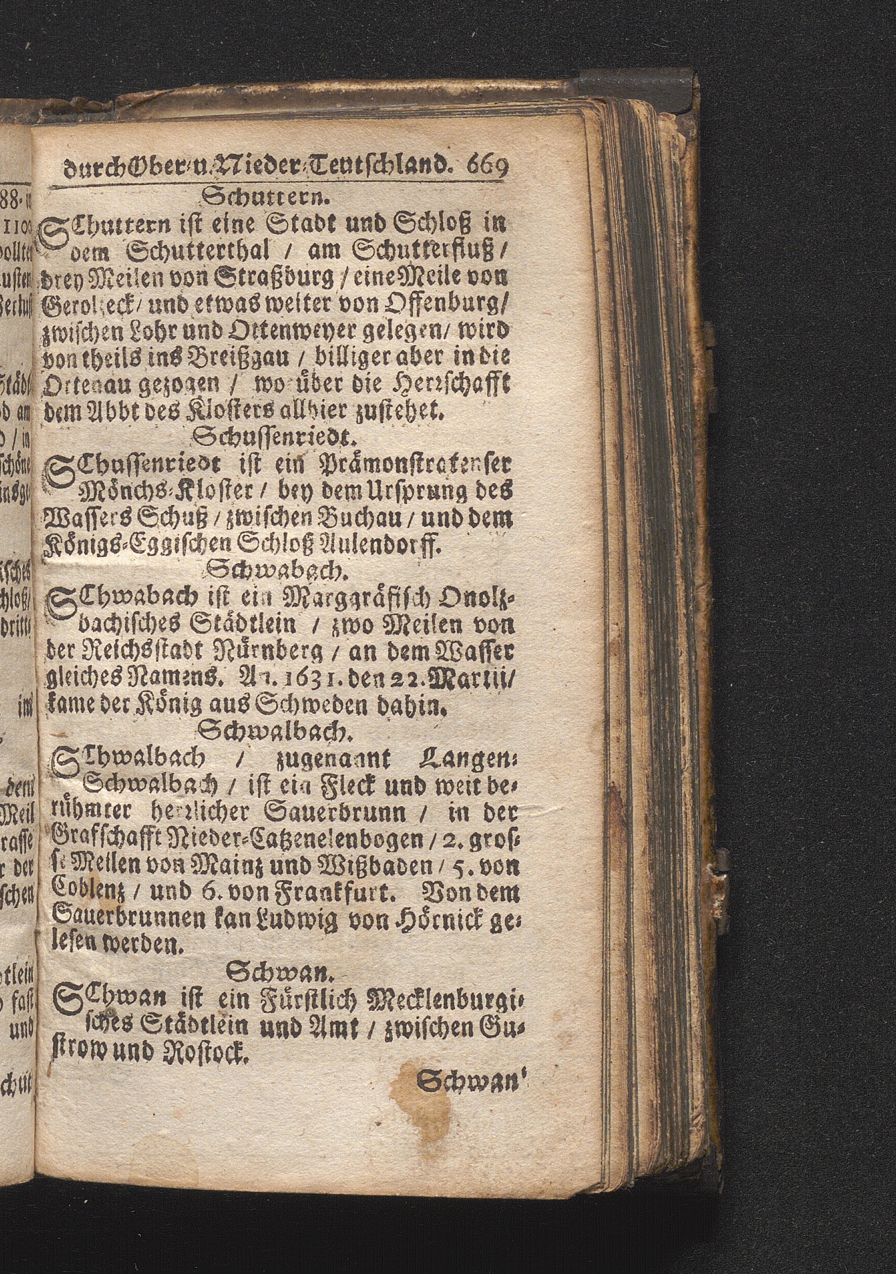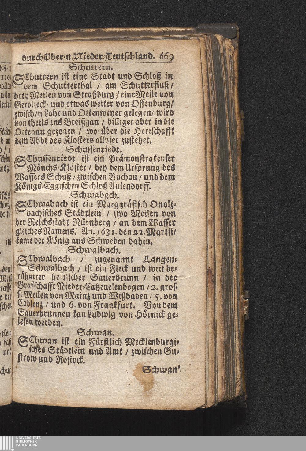 Der getreue Reiß-Gefert durch Ober- und Nieder-Teutschland : Das ist: Grundrichtige und ausführliche Abhandlung derer jenigen Residenzien/ Städte/ Schlösser/ Vestungen/ Städtlein und nahmhafften Markflecken/ welche so wol in Ober- als Nieder-Teutschland/ einem Reisenden sich hin und wieder vorstellig machen und zwar solcher Gestalt/ daß darinn derer Ursprung/ Aufnahm/ Fortification/ Raritäten/ herrliche Gebäue/ und Glück- und Unglücks-Fälle bis auf gegenwärtige Zeit fortgesetzt enthalten. Dabey auch noch über das ein absonderlicher kurz-gefasster Weegweiser angehänget zu finden/ worinnen klärlich zu sehen, wie viel Meilen ein Ort von dem andern entlegen. Alles aus denen bewährtesten Scribenten hervorgesuchet/ zum Nutz-Ergötzen mitgetheilet ...