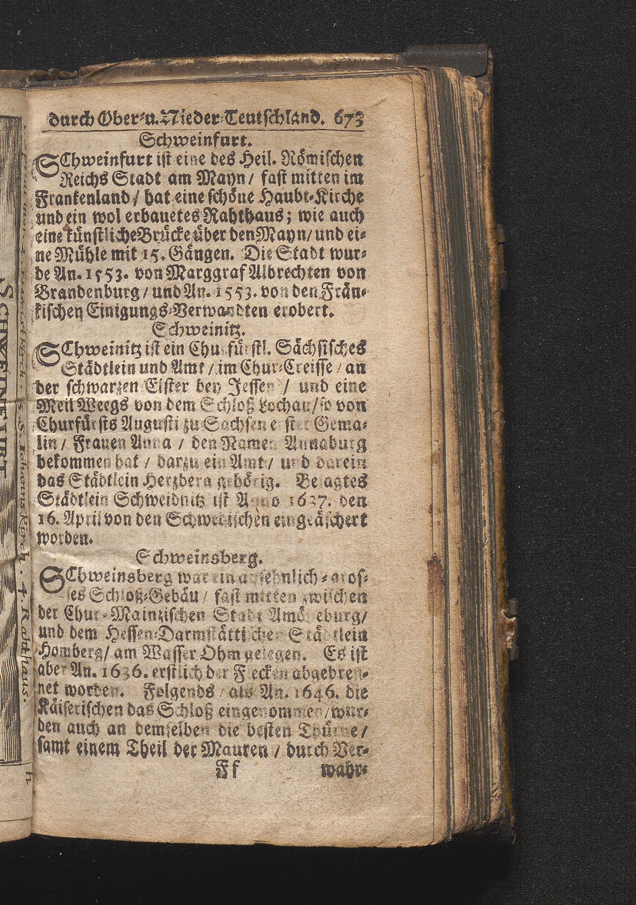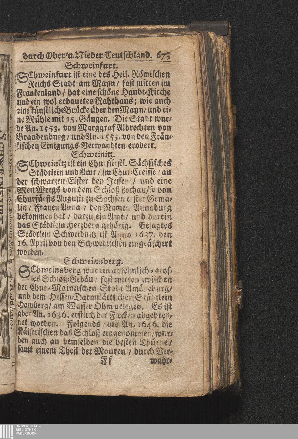 Der getreue Reiß-Gefert durch Ober- und Nieder-Teutschland : Das ist: Grundrichtige und ausführliche Abhandlung derer jenigen Residenzien/ Städte/ Schlösser/ Vestungen/ Städtlein und nahmhafften Markflecken/ welche so wol in Ober- als Nieder-Teutschland/ einem Reisenden sich hin und wieder vorstellig machen und zwar solcher Gestalt/ daß darinn derer Ursprung/ Aufnahm/ Fortification/ Raritäten/ herrliche Gebäue/ und Glück- und Unglücks-Fälle bis auf gegenwärtige Zeit fortgesetzt enthalten. Dabey auch noch über das ein absonderlicher kurz-gefasster Weegweiser angehänget zu finden/ worinnen klärlich zu sehen, wie viel Meilen ein Ort von dem andern entlegen. Alles aus denen bewährtesten Scribenten hervorgesuchet/ zum Nutz-Ergötzen mitgetheilet ...