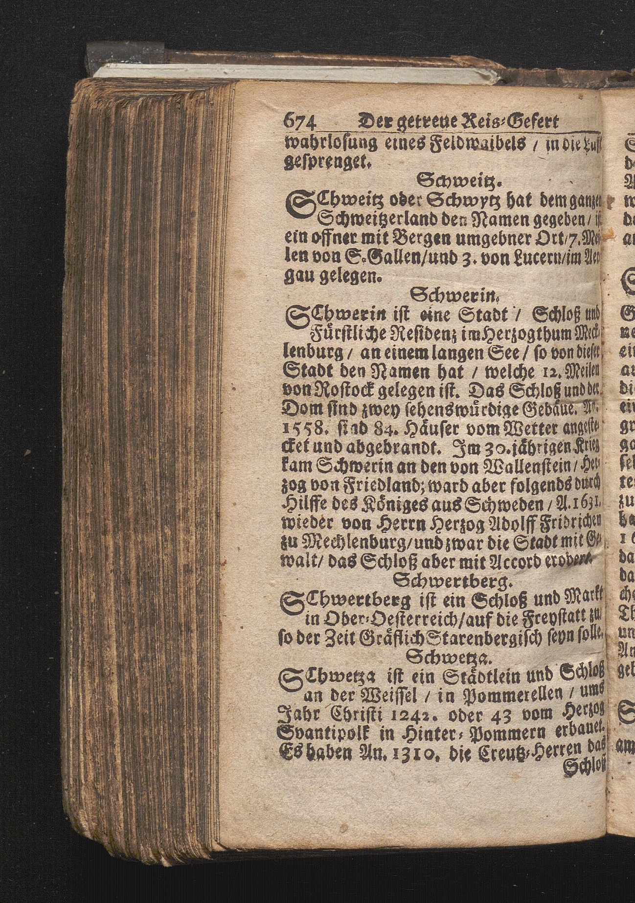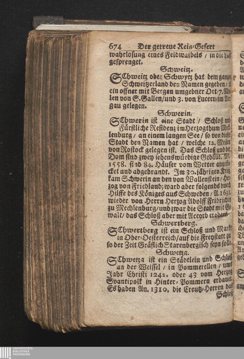 Der getreue Reiß-Gefert durch Ober- und Nieder-Teutschland : Das ist: Grundrichtige und ausführliche Abhandlung derer jenigen Residenzien/ Städte/ Schlösser/ Vestungen/ Städtlein und nahmhafften Markflecken/ welche so wol in Ober- als Nieder-Teutschland/ einem Reisenden sich hin und wieder vorstellig machen und zwar solcher Gestalt/ daß darinn derer Ursprung/ Aufnahm/ Fortification/ Raritäten/ herrliche Gebäue/ und Glück- und Unglücks-Fälle bis auf gegenwärtige Zeit fortgesetzt enthalten. Dabey auch noch über das ein absonderlicher kurz-gefasster Weegweiser angehänget zu finden/ worinnen klärlich zu sehen, wie viel Meilen ein Ort von dem andern entlegen. Alles aus denen bewährtesten Scribenten hervorgesuchet/ zum Nutz-Ergötzen mitgetheilet ...