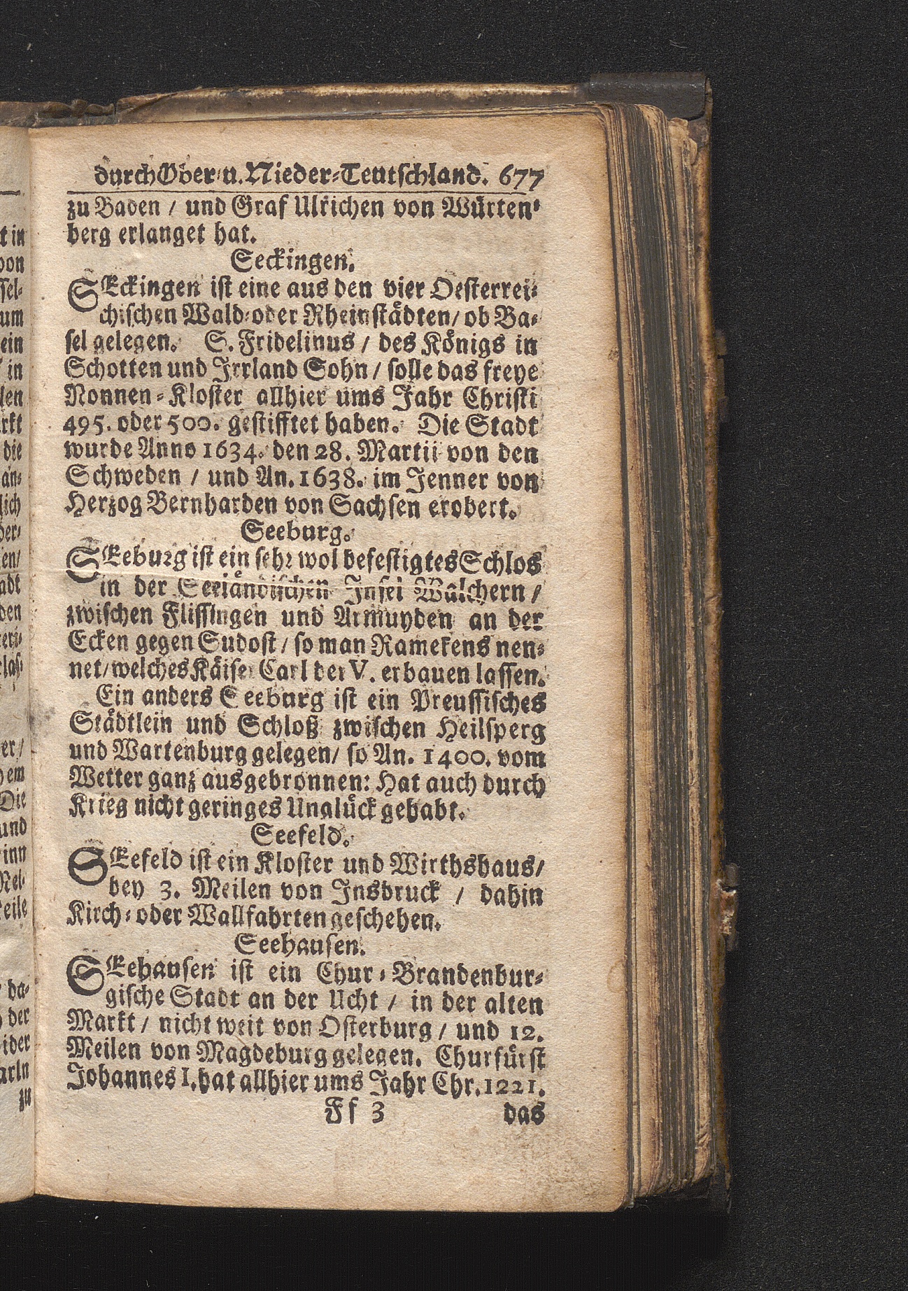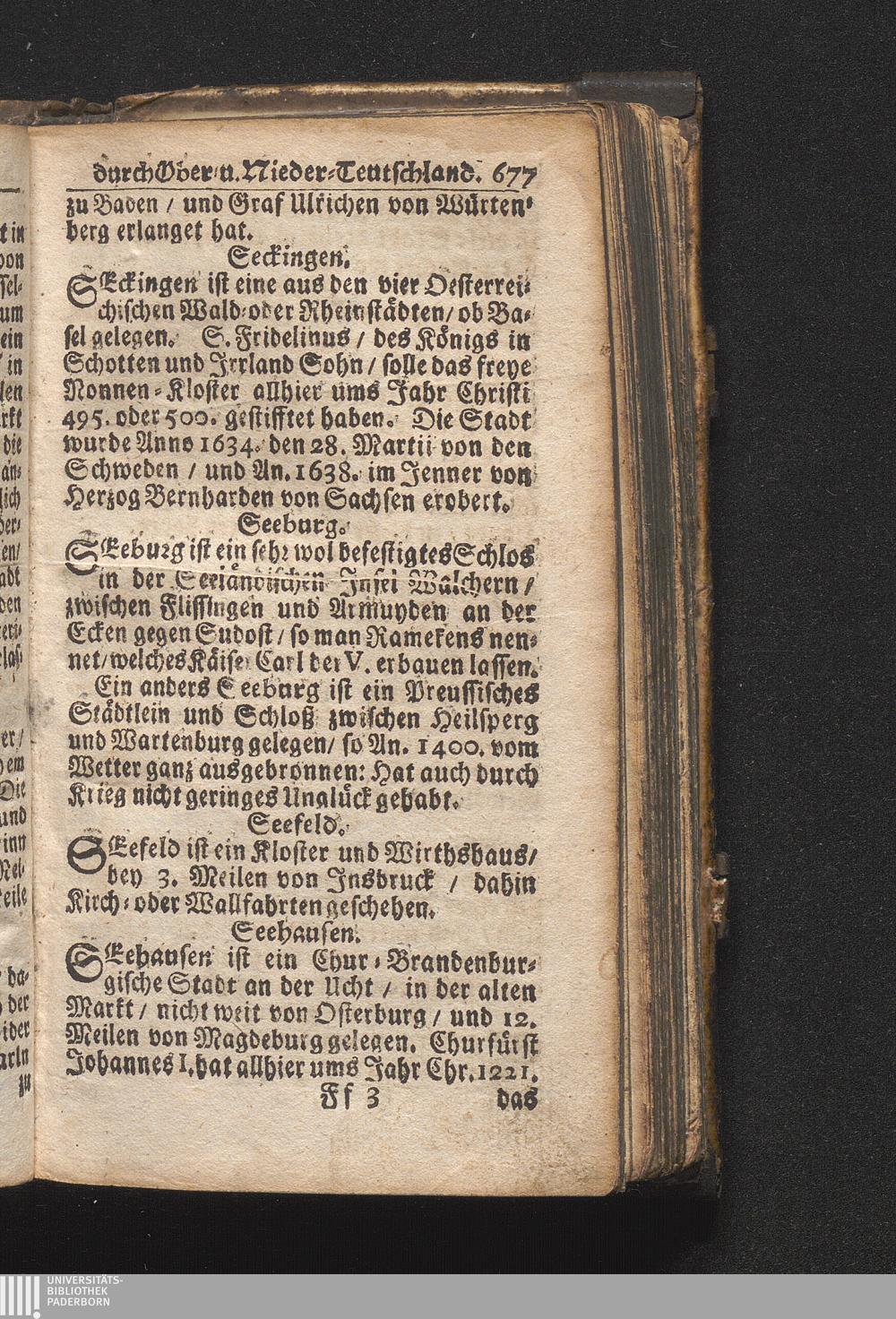 Der getreue Reiß-Gefert durch Ober- und Nieder-Teutschland : Das ist: Grundrichtige und ausführliche Abhandlung derer jenigen Residenzien/ Städte/ Schlösser/ Vestungen/ Städtlein und nahmhafften Markflecken/ welche so wol in Ober- als Nieder-Teutschland/ einem Reisenden sich hin und wieder vorstellig machen und zwar solcher Gestalt/ daß darinn derer Ursprung/ Aufnahm/ Fortification/ Raritäten/ herrliche Gebäue/ und Glück- und Unglücks-Fälle bis auf gegenwärtige Zeit fortgesetzt enthalten. Dabey auch noch über das ein absonderlicher kurz-gefasster Weegweiser angehänget zu finden/ worinnen klärlich zu sehen, wie viel Meilen ein Ort von dem andern entlegen. Alles aus denen bewährtesten Scribenten hervorgesuchet/ zum Nutz-Ergötzen mitgetheilet ...