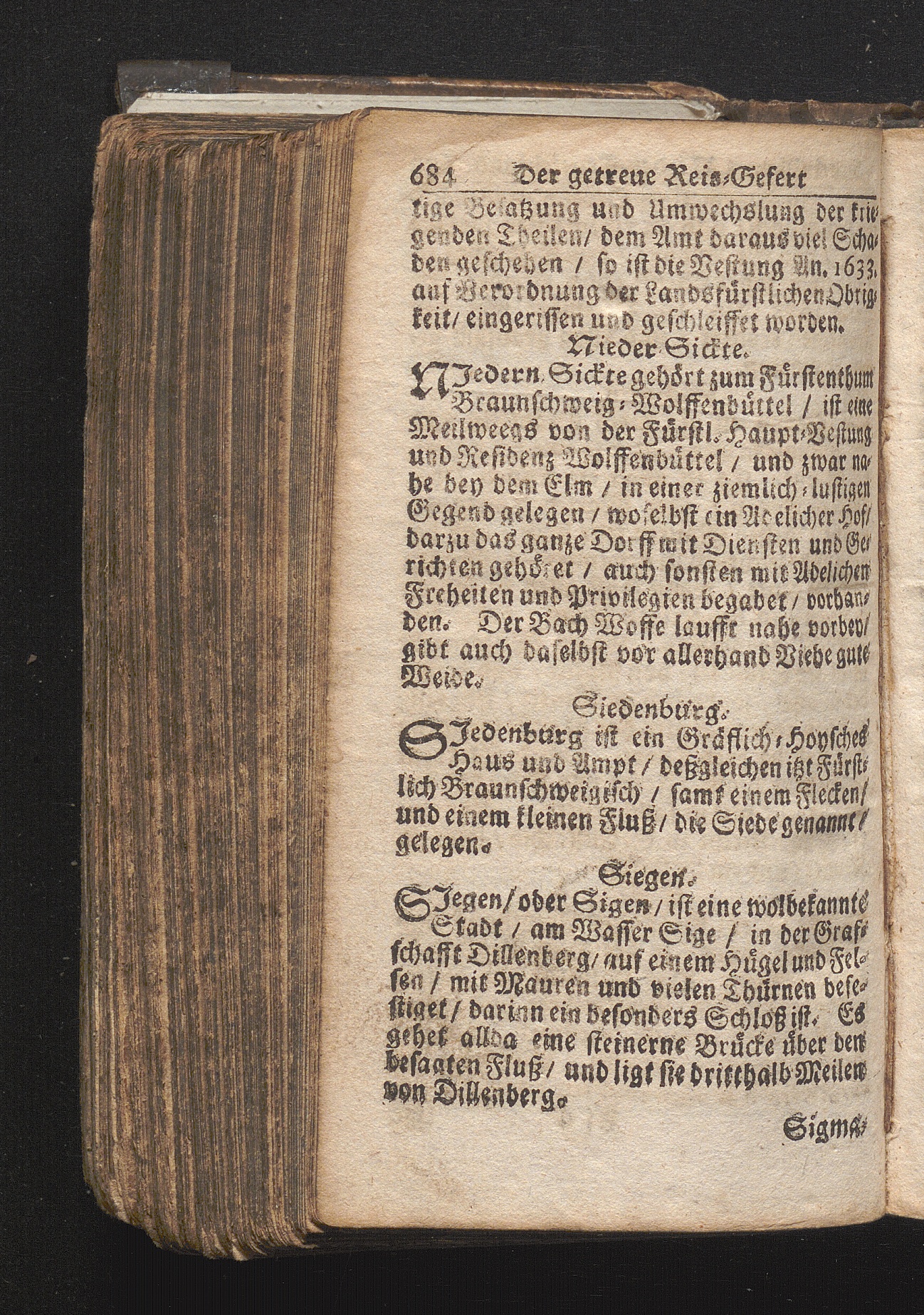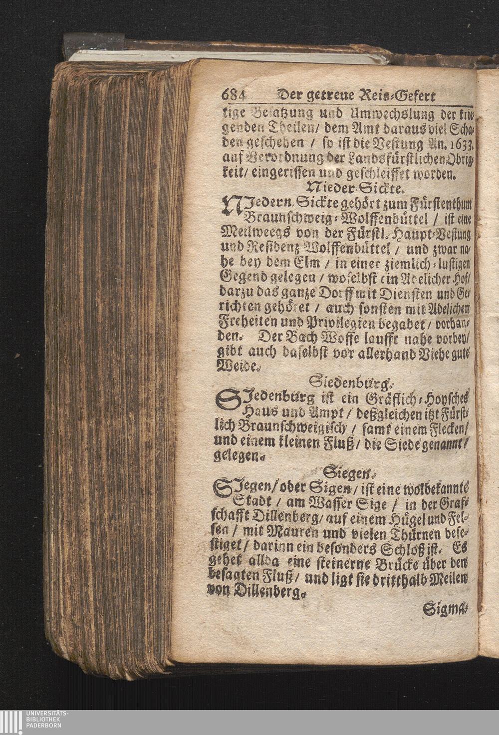 Der getreue Reiß-Gefert durch Ober- und Nieder-Teutschland : Das ist: Grundrichtige und ausführliche Abhandlung derer jenigen Residenzien/ Städte/ Schlösser/ Vestungen/ Städtlein und nahmhafften Markflecken/ welche so wol in Ober- als Nieder-Teutschland/ einem Reisenden sich hin und wieder vorstellig machen und zwar solcher Gestalt/ daß darinn derer Ursprung/ Aufnahm/ Fortification/ Raritäten/ herrliche Gebäue/ und Glück- und Unglücks-Fälle bis auf gegenwärtige Zeit fortgesetzt enthalten. Dabey auch noch über das ein absonderlicher kurz-gefasster Weegweiser angehänget zu finden/ worinnen klärlich zu sehen, wie viel Meilen ein Ort von dem andern entlegen. Alles aus denen bewährtesten Scribenten hervorgesuchet/ zum Nutz-Ergötzen mitgetheilet ...