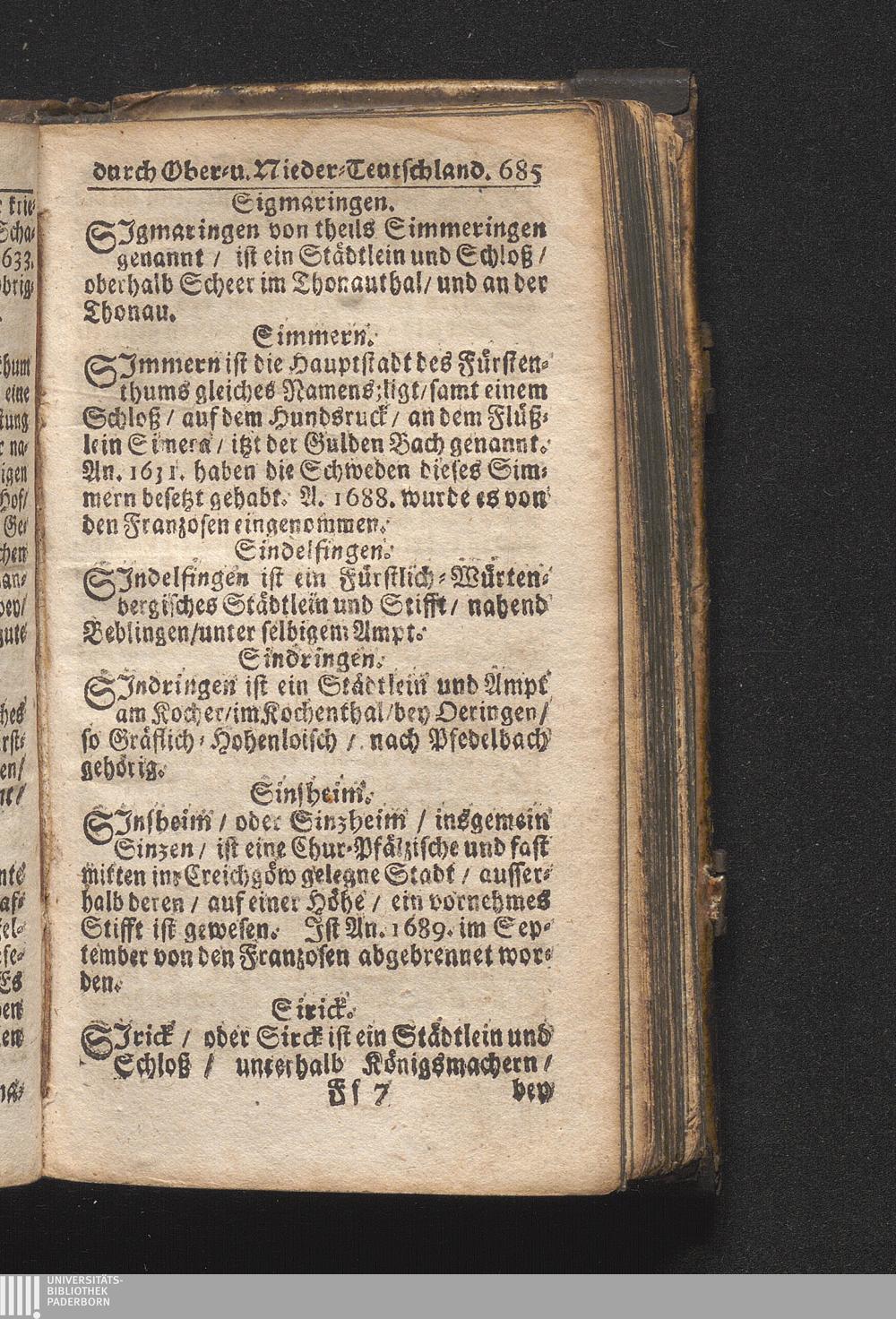 Der getreue Reiß-Gefert durch Ober- und Nieder-Teutschland : Das ist: Grundrichtige und ausführliche Abhandlung derer jenigen Residenzien/ Städte/ Schlösser/ Vestungen/ Städtlein und nahmhafften Markflecken/ welche so wol in Ober- als Nieder-Teutschland/ einem Reisenden sich hin und wieder vorstellig machen und zwar solcher Gestalt/ daß darinn derer Ursprung/ Aufnahm/ Fortification/ Raritäten/ herrliche Gebäue/ und Glück- und Unglücks-Fälle bis auf gegenwärtige Zeit fortgesetzt enthalten. Dabey auch noch über das ein absonderlicher kurz-gefasster Weegweiser angehänget zu finden/ worinnen klärlich zu sehen, wie viel Meilen ein Ort von dem andern entlegen. Alles aus denen bewährtesten Scribenten hervorgesuchet/ zum Nutz-Ergötzen mitgetheilet ...