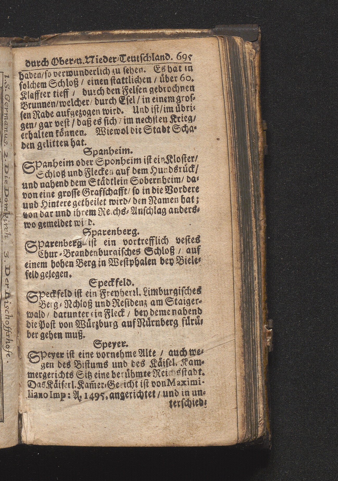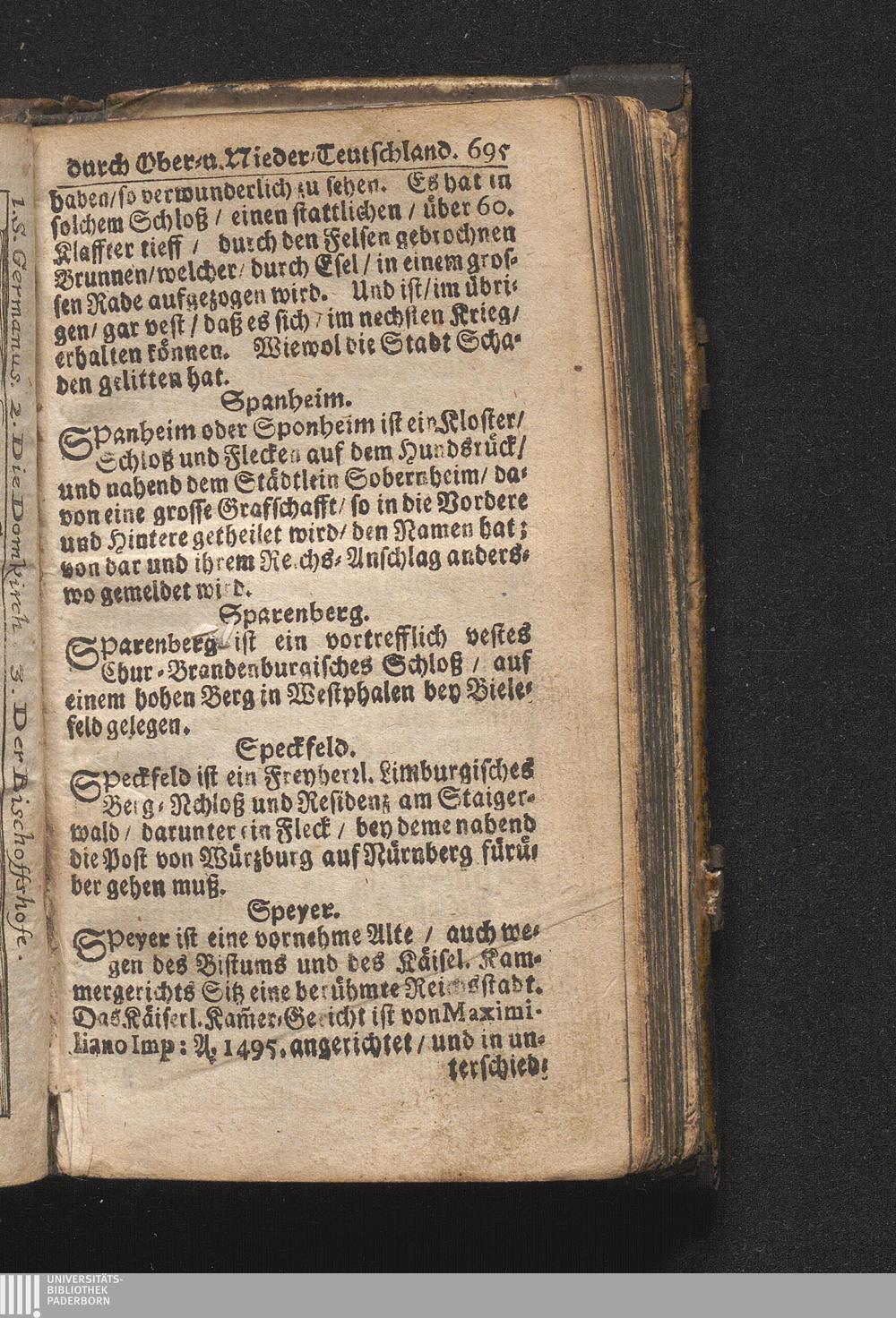 Der getreue Reiß-Gefert durch Ober- und Nieder-Teutschland : Das ist: Grundrichtige und ausführliche Abhandlung derer jenigen Residenzien/ Städte/ Schlösser/ Vestungen/ Städtlein und nahmhafften Markflecken/ welche so wol in Ober- als Nieder-Teutschland/ einem Reisenden sich hin und wieder vorstellig machen und zwar solcher Gestalt/ daß darinn derer Ursprung/ Aufnahm/ Fortification/ Raritäten/ herrliche Gebäue/ und Glück- und Unglücks-Fälle bis auf gegenwärtige Zeit fortgesetzt enthalten. Dabey auch noch über das ein absonderlicher kurz-gefasster Weegweiser angehänget zu finden/ worinnen klärlich zu sehen, wie viel Meilen ein Ort von dem andern entlegen. Alles aus denen bewährtesten Scribenten hervorgesuchet/ zum Nutz-Ergötzen mitgetheilet ...