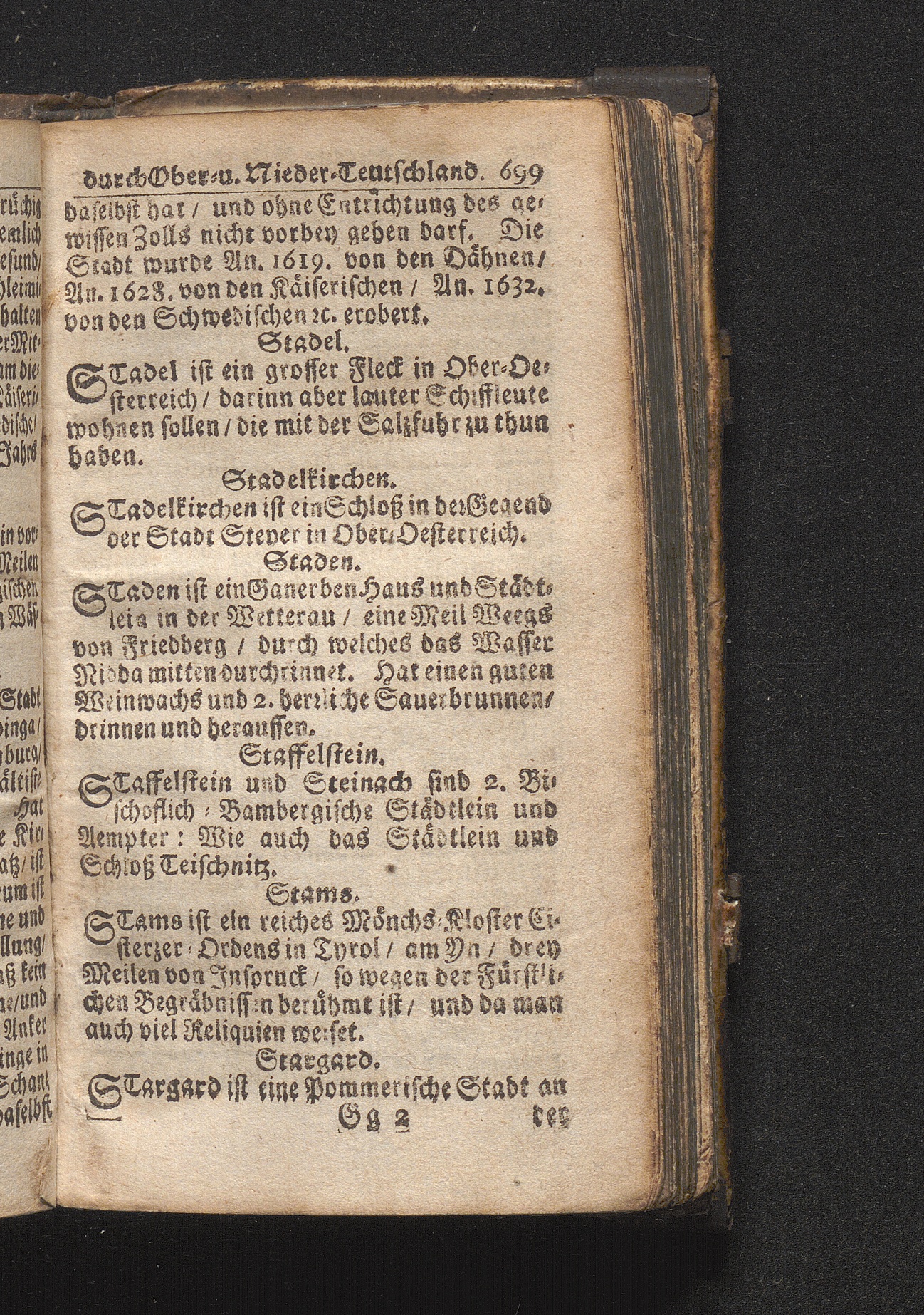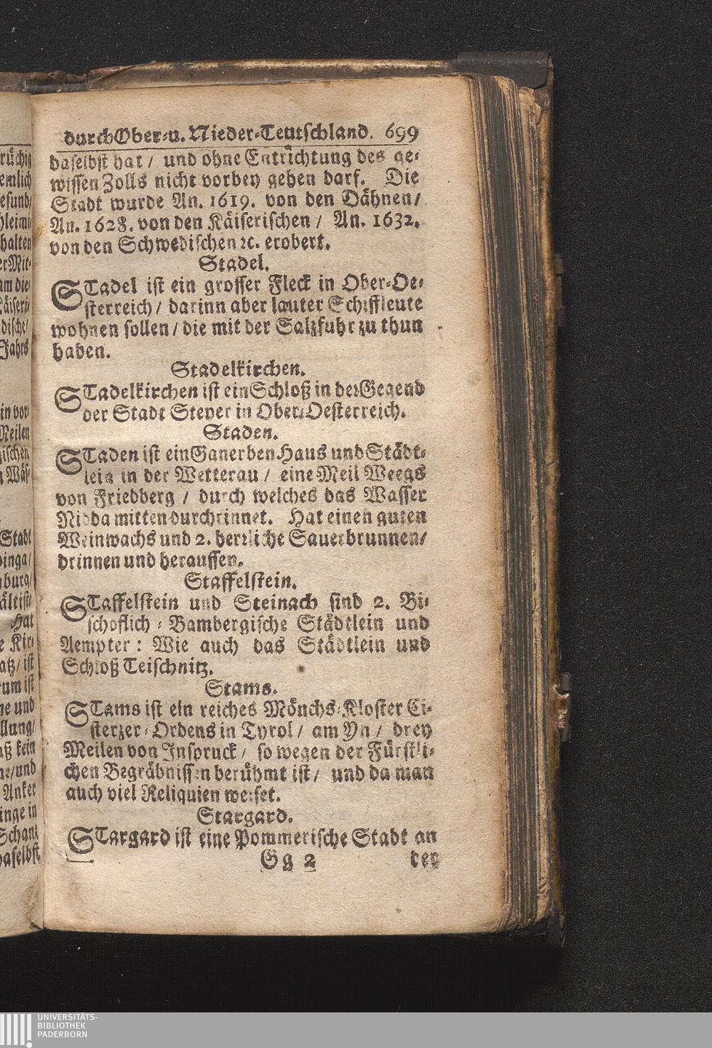 Der getreue Reiß-Gefert durch Ober- und Nieder-Teutschland : Das ist: Grundrichtige und ausführliche Abhandlung derer jenigen Residenzien/ Städte/ Schlösser/ Vestungen/ Städtlein und nahmhafften Markflecken/ welche so wol in Ober- als Nieder-Teutschland/ einem Reisenden sich hin und wieder vorstellig machen und zwar solcher Gestalt/ daß darinn derer Ursprung/ Aufnahm/ Fortification/ Raritäten/ herrliche Gebäue/ und Glück- und Unglücks-Fälle bis auf gegenwärtige Zeit fortgesetzt enthalten. Dabey auch noch über das ein absonderlicher kurz-gefasster Weegweiser angehänget zu finden/ worinnen klärlich zu sehen, wie viel Meilen ein Ort von dem andern entlegen. Alles aus denen bewährtesten Scribenten hervorgesuchet/ zum Nutz-Ergötzen mitgetheilet ...