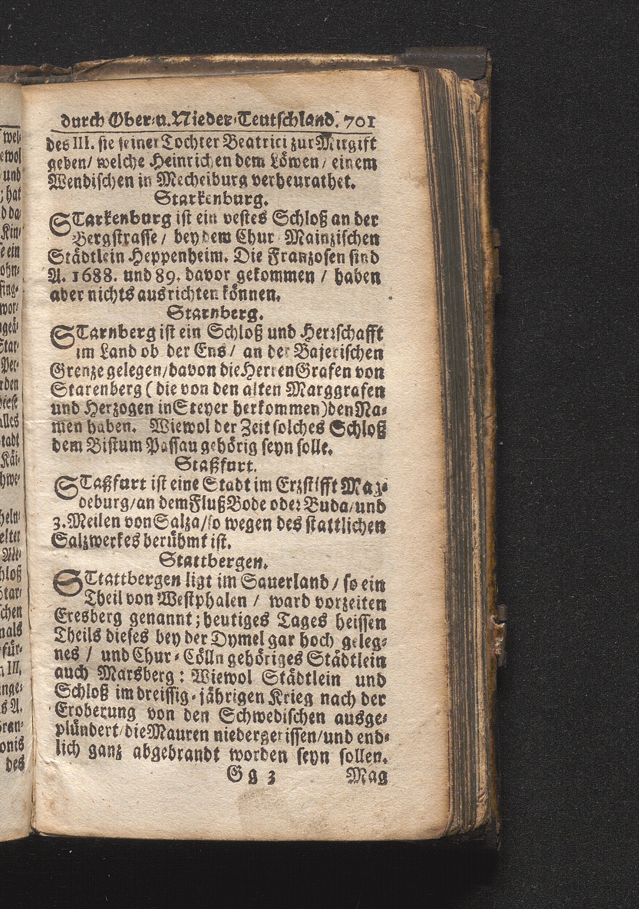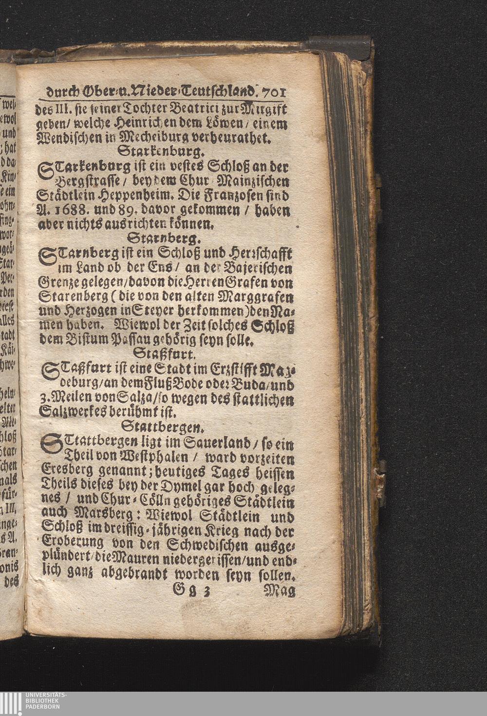 Der getreue Reiß-Gefert durch Ober- und Nieder-Teutschland : Das ist: Grundrichtige und ausführliche Abhandlung derer jenigen Residenzien/ Städte/ Schlösser/ Vestungen/ Städtlein und nahmhafften Markflecken/ welche so wol in Ober- als Nieder-Teutschland/ einem Reisenden sich hin und wieder vorstellig machen und zwar solcher Gestalt/ daß darinn derer Ursprung/ Aufnahm/ Fortification/ Raritäten/ herrliche Gebäue/ und Glück- und Unglücks-Fälle bis auf gegenwärtige Zeit fortgesetzt enthalten. Dabey auch noch über das ein absonderlicher kurz-gefasster Weegweiser angehänget zu finden/ worinnen klärlich zu sehen, wie viel Meilen ein Ort von dem andern entlegen. Alles aus denen bewährtesten Scribenten hervorgesuchet/ zum Nutz-Ergötzen mitgetheilet ...