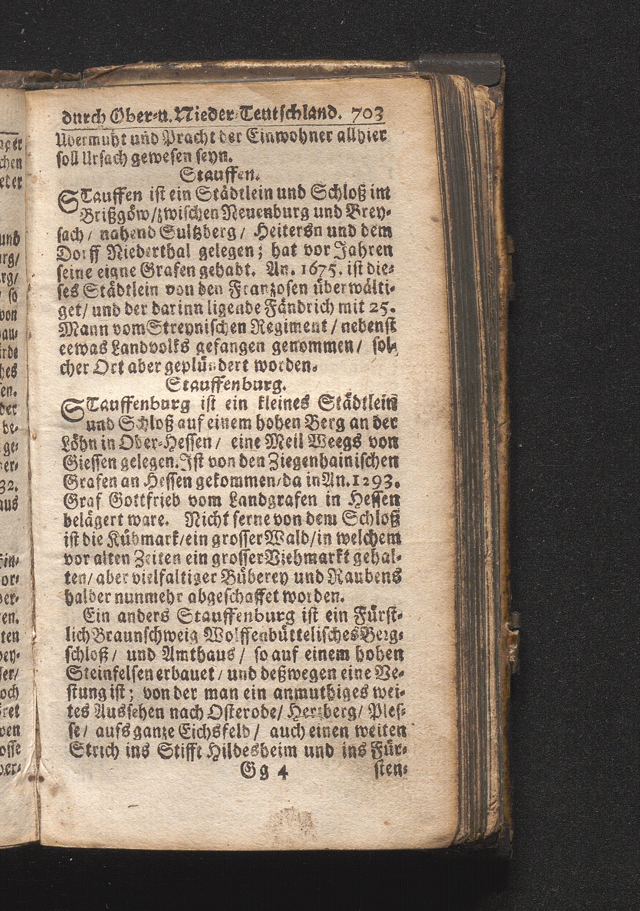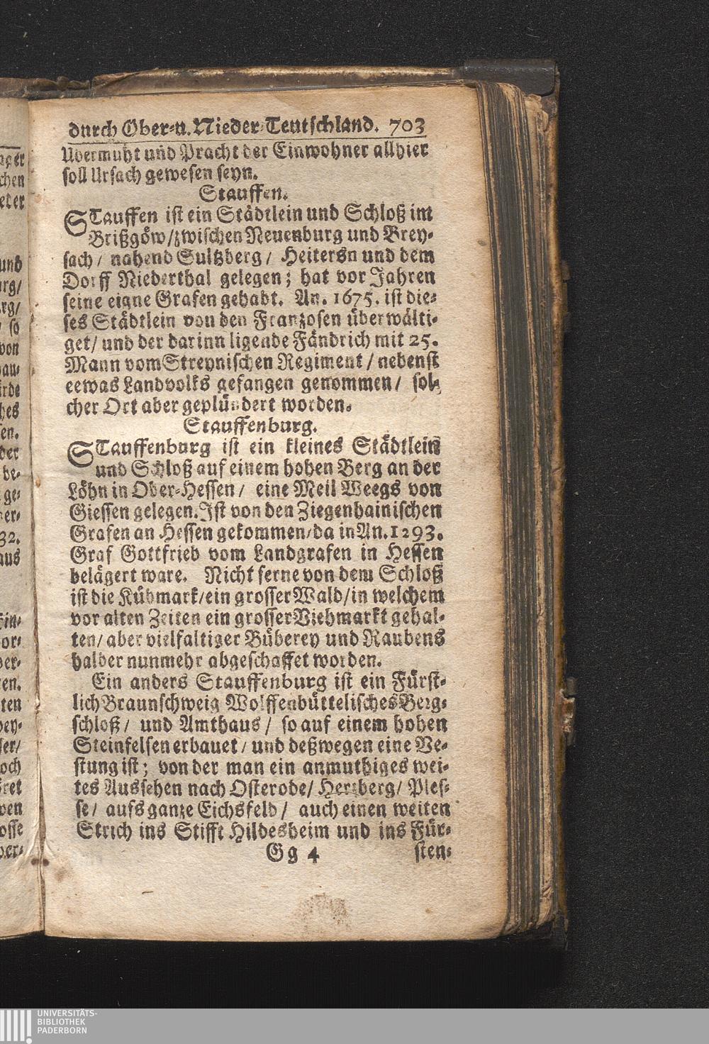Der getreue Reiß-Gefert durch Ober- und Nieder-Teutschland : Das ist: Grundrichtige und ausführliche Abhandlung derer jenigen Residenzien/ Städte/ Schlösser/ Vestungen/ Städtlein und nahmhafften Markflecken/ welche so wol in Ober- als Nieder-Teutschland/ einem Reisenden sich hin und wieder vorstellig machen und zwar solcher Gestalt/ daß darinn derer Ursprung/ Aufnahm/ Fortification/ Raritäten/ herrliche Gebäue/ und Glück- und Unglücks-Fälle bis auf gegenwärtige Zeit fortgesetzt enthalten. Dabey auch noch über das ein absonderlicher kurz-gefasster Weegweiser angehänget zu finden/ worinnen klärlich zu sehen, wie viel Meilen ein Ort von dem andern entlegen. Alles aus denen bewährtesten Scribenten hervorgesuchet/ zum Nutz-Ergötzen mitgetheilet ...