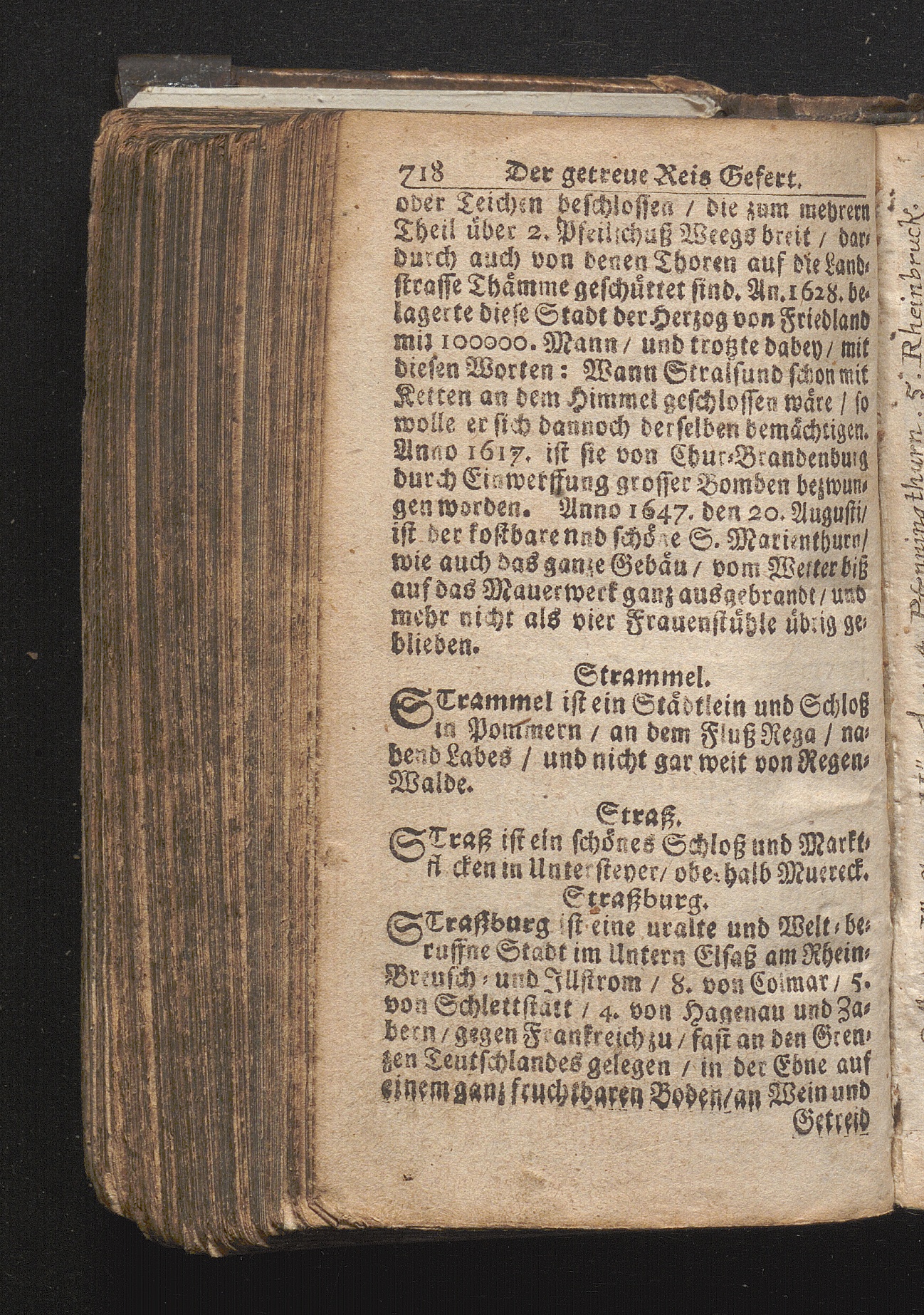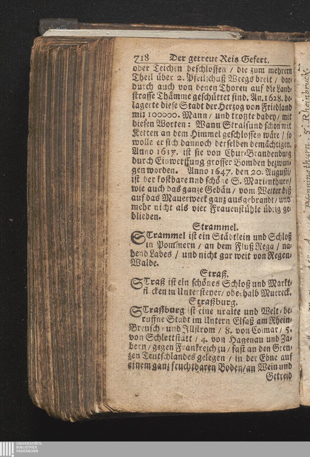 Der getreue Reiß-Gefert durch Ober- und Nieder-Teutschland : Das ist: Grundrichtige und ausführliche Abhandlung derer jenigen Residenzien/ Städte/ Schlösser/ Vestungen/ Städtlein und nahmhafften Markflecken/ welche so wol in Ober- als Nieder-Teutschland/ einem Reisenden sich hin und wieder vorstellig machen und zwar solcher Gestalt/ daß darinn derer Ursprung/ Aufnahm/ Fortification/ Raritäten/ herrliche Gebäue/ und Glück- und Unglücks-Fälle bis auf gegenwärtige Zeit fortgesetzt enthalten. Dabey auch noch über das ein absonderlicher kurz-gefasster Weegweiser angehänget zu finden/ worinnen klärlich zu sehen, wie viel Meilen ein Ort von dem andern entlegen. Alles aus denen bewährtesten Scribenten hervorgesuchet/ zum Nutz-Ergötzen mitgetheilet ...