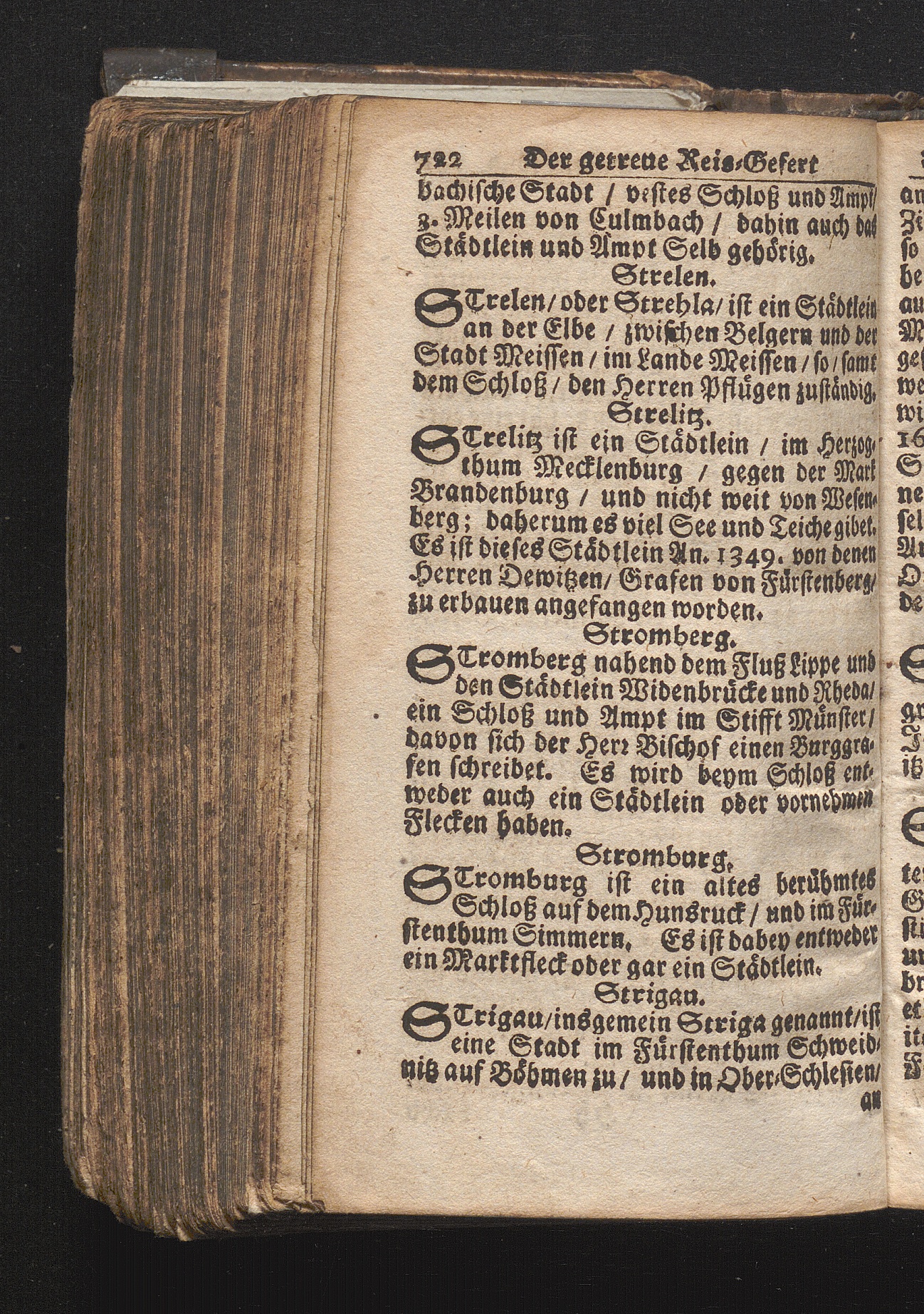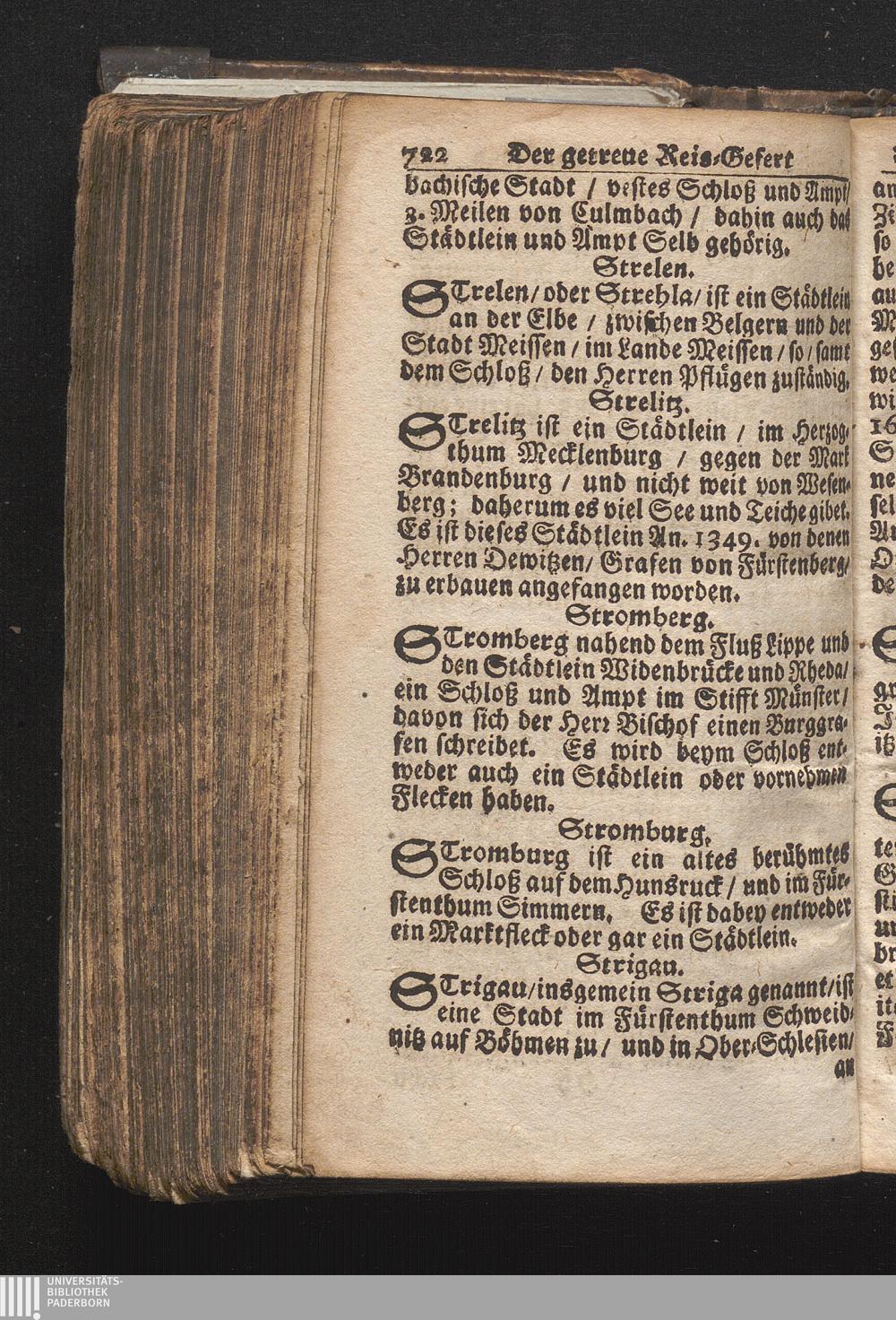 Der getreue Reiß-Gefert durch Ober- und Nieder-Teutschland : Das ist: Grundrichtige und ausführliche Abhandlung derer jenigen Residenzien/ Städte/ Schlösser/ Vestungen/ Städtlein und nahmhafften Markflecken/ welche so wol in Ober- als Nieder-Teutschland/ einem Reisenden sich hin und wieder vorstellig machen und zwar solcher Gestalt/ daß darinn derer Ursprung/ Aufnahm/ Fortification/ Raritäten/ herrliche Gebäue/ und Glück- und Unglücks-Fälle bis auf gegenwärtige Zeit fortgesetzt enthalten. Dabey auch noch über das ein absonderlicher kurz-gefasster Weegweiser angehänget zu finden/ worinnen klärlich zu sehen, wie viel Meilen ein Ort von dem andern entlegen. Alles aus denen bewährtesten Scribenten hervorgesuchet/ zum Nutz-Ergötzen mitgetheilet ...