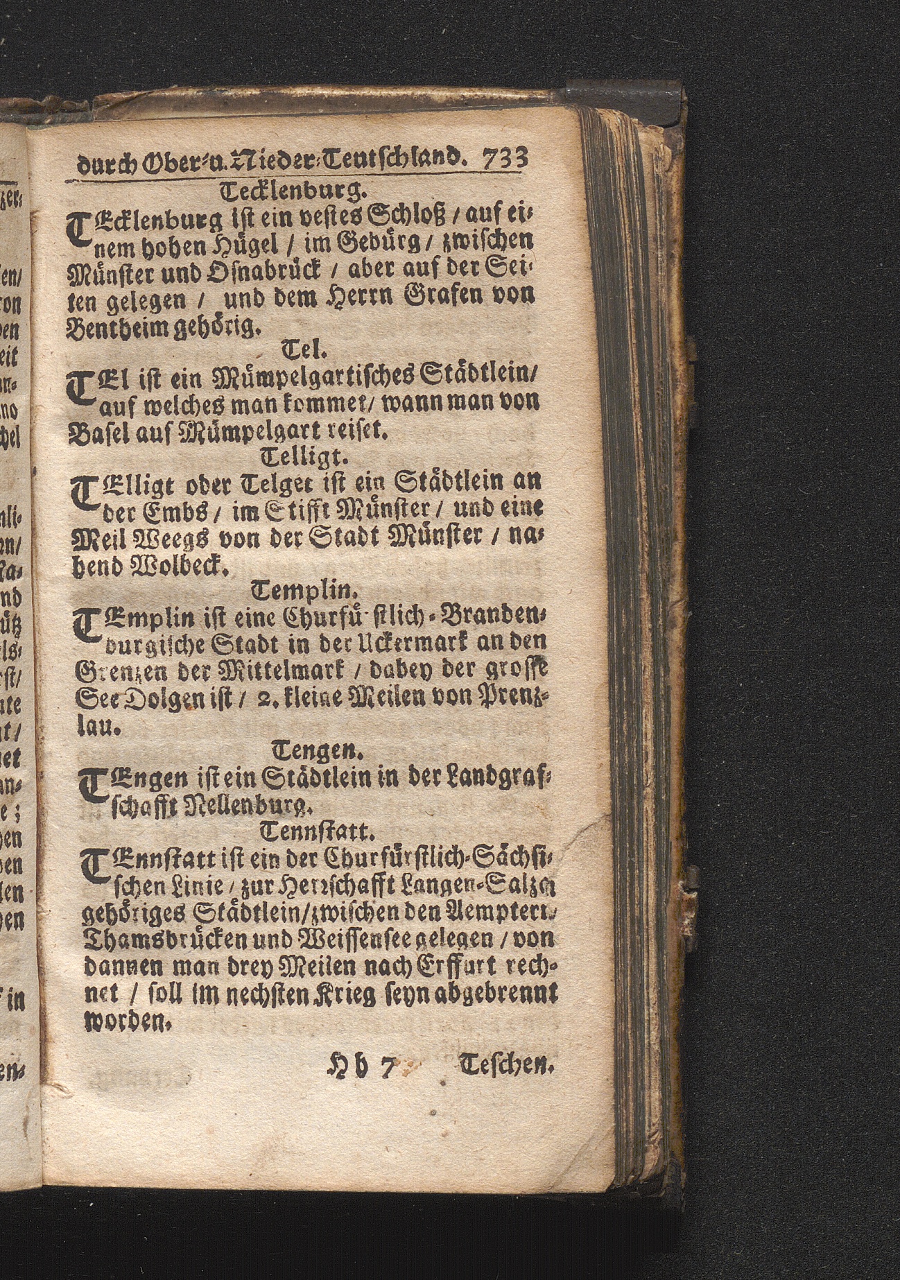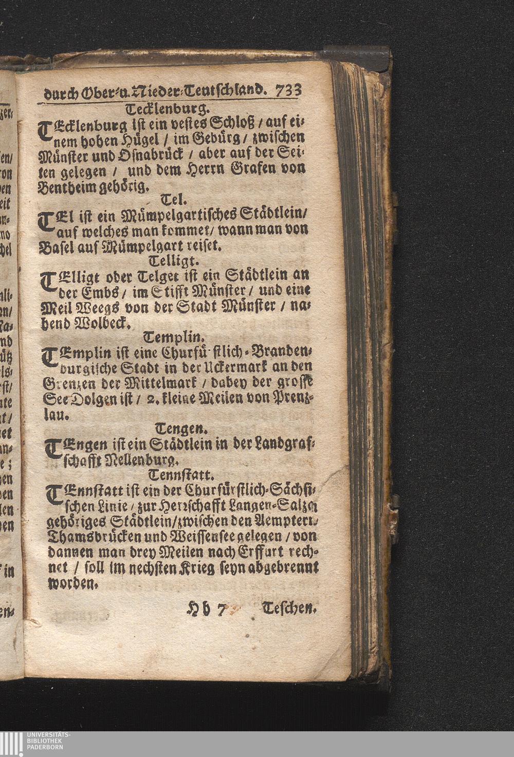 Der getreue Reiß-Gefert durch Ober- und Nieder-Teutschland : Das ist: Grundrichtige und ausführliche Abhandlung derer jenigen Residenzien/ Städte/ Schlösser/ Vestungen/ Städtlein und nahmhafften Markflecken/ welche so wol in Ober- als Nieder-Teutschland/ einem Reisenden sich hin und wieder vorstellig machen und zwar solcher Gestalt/ daß darinn derer Ursprung/ Aufnahm/ Fortification/ Raritäten/ herrliche Gebäue/ und Glück- und Unglücks-Fälle bis auf gegenwärtige Zeit fortgesetzt enthalten. Dabey auch noch über das ein absonderlicher kurz-gefasster Weegweiser angehänget zu finden/ worinnen klärlich zu sehen, wie viel Meilen ein Ort von dem andern entlegen. Alles aus denen bewährtesten Scribenten hervorgesuchet/ zum Nutz-Ergötzen mitgetheilet ...