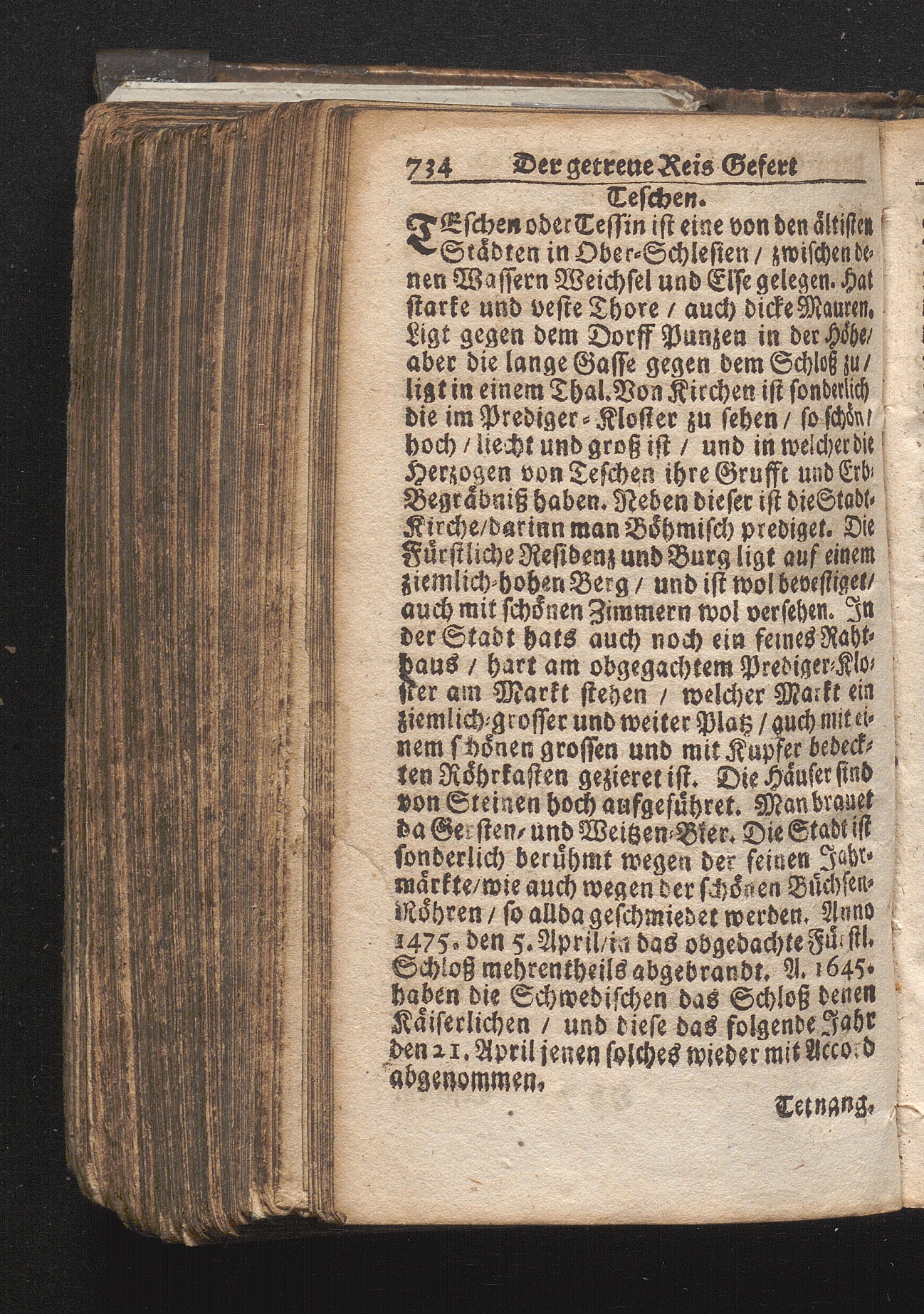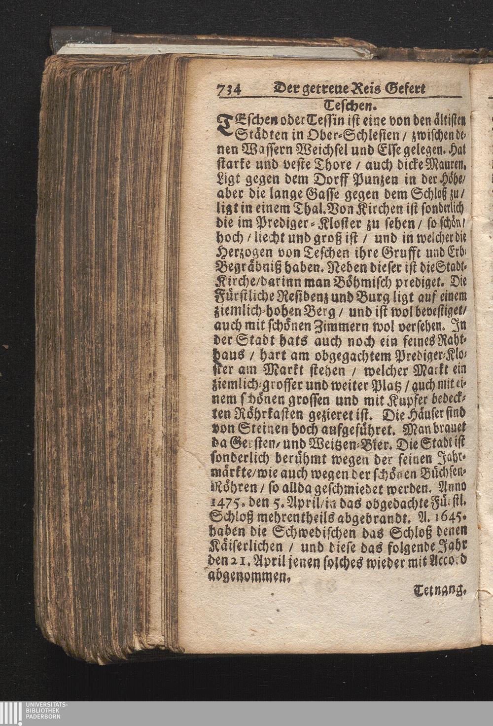 Der getreue Reiß-Gefert durch Ober- und Nieder-Teutschland : Das ist: Grundrichtige und ausführliche Abhandlung derer jenigen Residenzien/ Städte/ Schlösser/ Vestungen/ Städtlein und nahmhafften Markflecken/ welche so wol in Ober- als Nieder-Teutschland/ einem Reisenden sich hin und wieder vorstellig machen und zwar solcher Gestalt/ daß darinn derer Ursprung/ Aufnahm/ Fortification/ Raritäten/ herrliche Gebäue/ und Glück- und Unglücks-Fälle bis auf gegenwärtige Zeit fortgesetzt enthalten. Dabey auch noch über das ein absonderlicher kurz-gefasster Weegweiser angehänget zu finden/ worinnen klärlich zu sehen, wie viel Meilen ein Ort von dem andern entlegen. Alles aus denen bewährtesten Scribenten hervorgesuchet/ zum Nutz-Ergötzen mitgetheilet ...