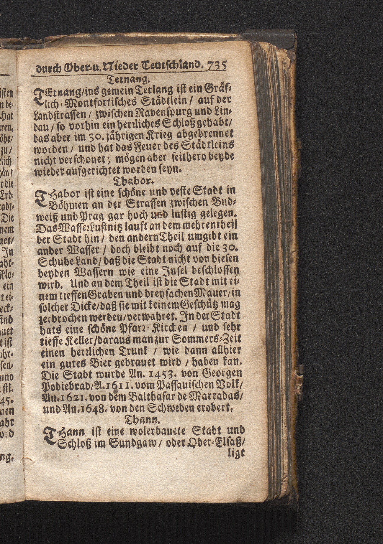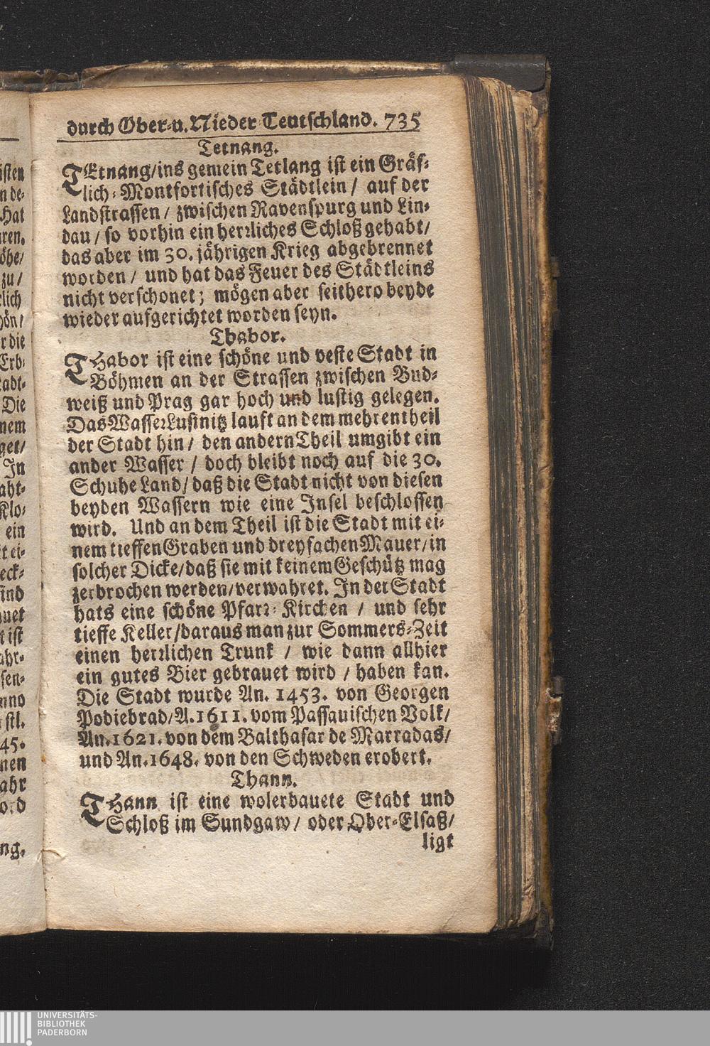 Der getreue Reiß-Gefert durch Ober- und Nieder-Teutschland : Das ist: Grundrichtige und ausführliche Abhandlung derer jenigen Residenzien/ Städte/ Schlösser/ Vestungen/ Städtlein und nahmhafften Markflecken/ welche so wol in Ober- als Nieder-Teutschland/ einem Reisenden sich hin und wieder vorstellig machen und zwar solcher Gestalt/ daß darinn derer Ursprung/ Aufnahm/ Fortification/ Raritäten/ herrliche Gebäue/ und Glück- und Unglücks-Fälle bis auf gegenwärtige Zeit fortgesetzt enthalten. Dabey auch noch über das ein absonderlicher kurz-gefasster Weegweiser angehänget zu finden/ worinnen klärlich zu sehen, wie viel Meilen ein Ort von dem andern entlegen. Alles aus denen bewährtesten Scribenten hervorgesuchet/ zum Nutz-Ergötzen mitgetheilet ...