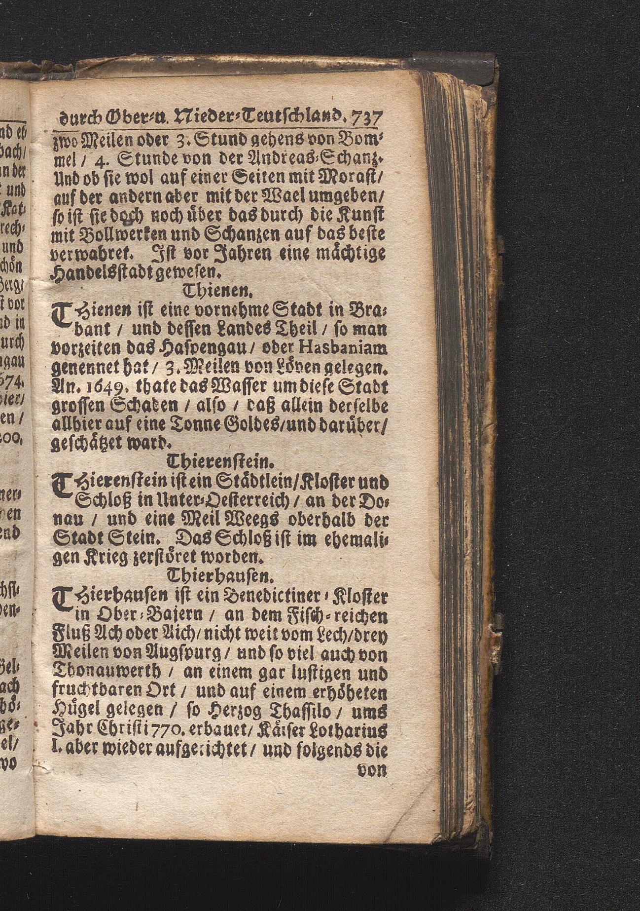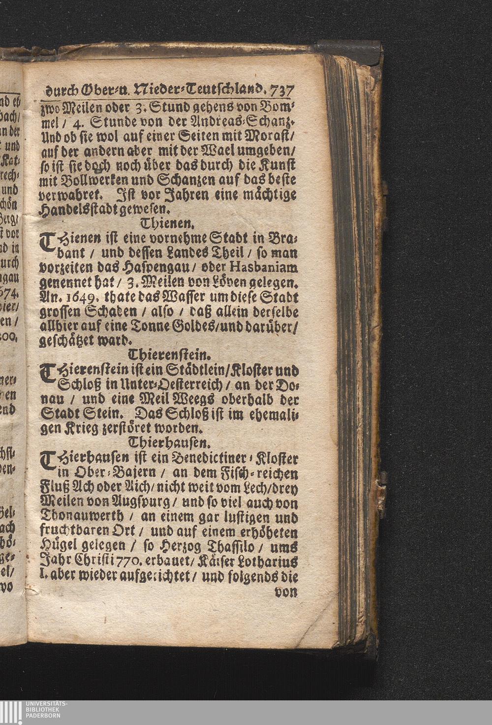 Der getreue Reiß-Gefert durch Ober- und Nieder-Teutschland : Das ist: Grundrichtige und ausführliche Abhandlung derer jenigen Residenzien/ Städte/ Schlösser/ Vestungen/ Städtlein und nahmhafften Markflecken/ welche so wol in Ober- als Nieder-Teutschland/ einem Reisenden sich hin und wieder vorstellig machen und zwar solcher Gestalt/ daß darinn derer Ursprung/ Aufnahm/ Fortification/ Raritäten/ herrliche Gebäue/ und Glück- und Unglücks-Fälle bis auf gegenwärtige Zeit fortgesetzt enthalten. Dabey auch noch über das ein absonderlicher kurz-gefasster Weegweiser angehänget zu finden/ worinnen klärlich zu sehen, wie viel Meilen ein Ort von dem andern entlegen. Alles aus denen bewährtesten Scribenten hervorgesuchet/ zum Nutz-Ergötzen mitgetheilet ...