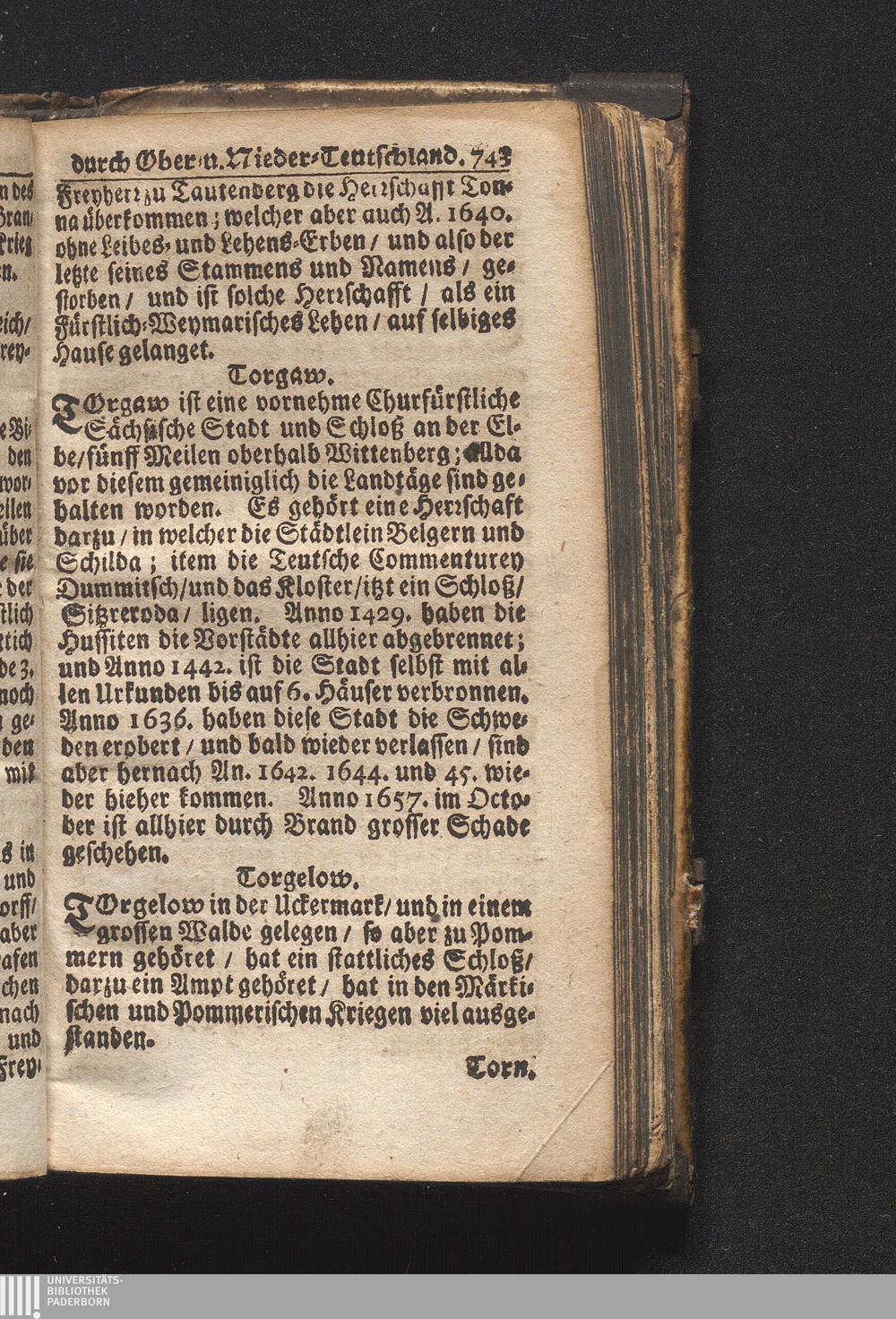 Der getreue Reiß-Gefert durch Ober- und Nieder-Teutschland : Das ist: Grundrichtige und ausführliche Abhandlung derer jenigen Residenzien/ Städte/ Schlösser/ Vestungen/ Städtlein und nahmhafften Markflecken/ welche so wol in Ober- als Nieder-Teutschland/ einem Reisenden sich hin und wieder vorstellig machen und zwar solcher Gestalt/ daß darinn derer Ursprung/ Aufnahm/ Fortification/ Raritäten/ herrliche Gebäue/ und Glück- und Unglücks-Fälle bis auf gegenwärtige Zeit fortgesetzt enthalten. Dabey auch noch über das ein absonderlicher kurz-gefasster Weegweiser angehänget zu finden/ worinnen klärlich zu sehen, wie viel Meilen ein Ort von dem andern entlegen. Alles aus denen bewährtesten Scribenten hervorgesuchet/ zum Nutz-Ergötzen mitgetheilet ...