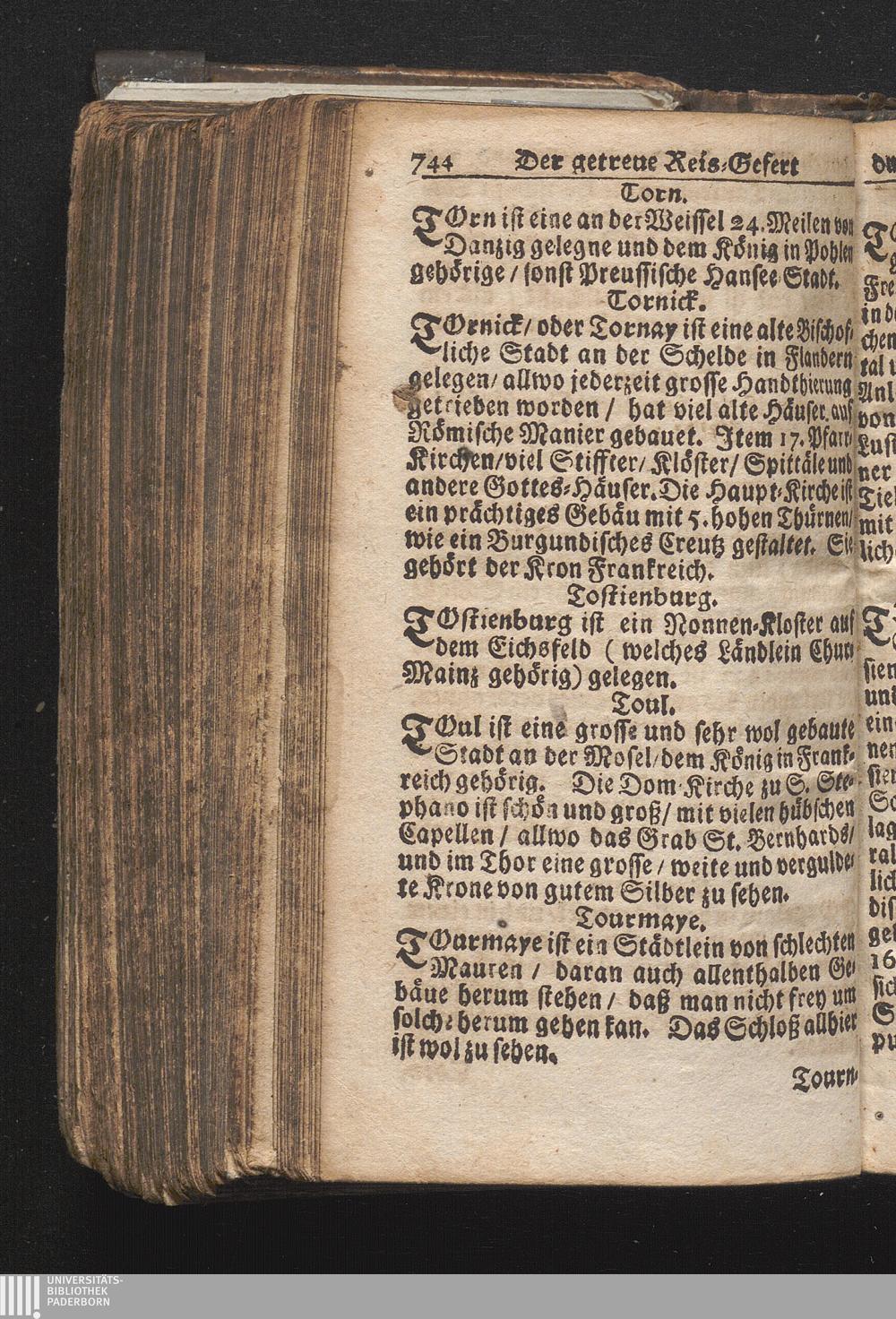 Der getreue Reiß-Gefert durch Ober- und Nieder-Teutschland : Das ist: Grundrichtige und ausführliche Abhandlung derer jenigen Residenzien/ Städte/ Schlösser/ Vestungen/ Städtlein und nahmhafften Markflecken/ welche so wol in Ober- als Nieder-Teutschland/ einem Reisenden sich hin und wieder vorstellig machen und zwar solcher Gestalt/ daß darinn derer Ursprung/ Aufnahm/ Fortification/ Raritäten/ herrliche Gebäue/ und Glück- und Unglücks-Fälle bis auf gegenwärtige Zeit fortgesetzt enthalten. Dabey auch noch über das ein absonderlicher kurz-gefasster Weegweiser angehänget zu finden/ worinnen klärlich zu sehen, wie viel Meilen ein Ort von dem andern entlegen. Alles aus denen bewährtesten Scribenten hervorgesuchet/ zum Nutz-Ergötzen mitgetheilet ...