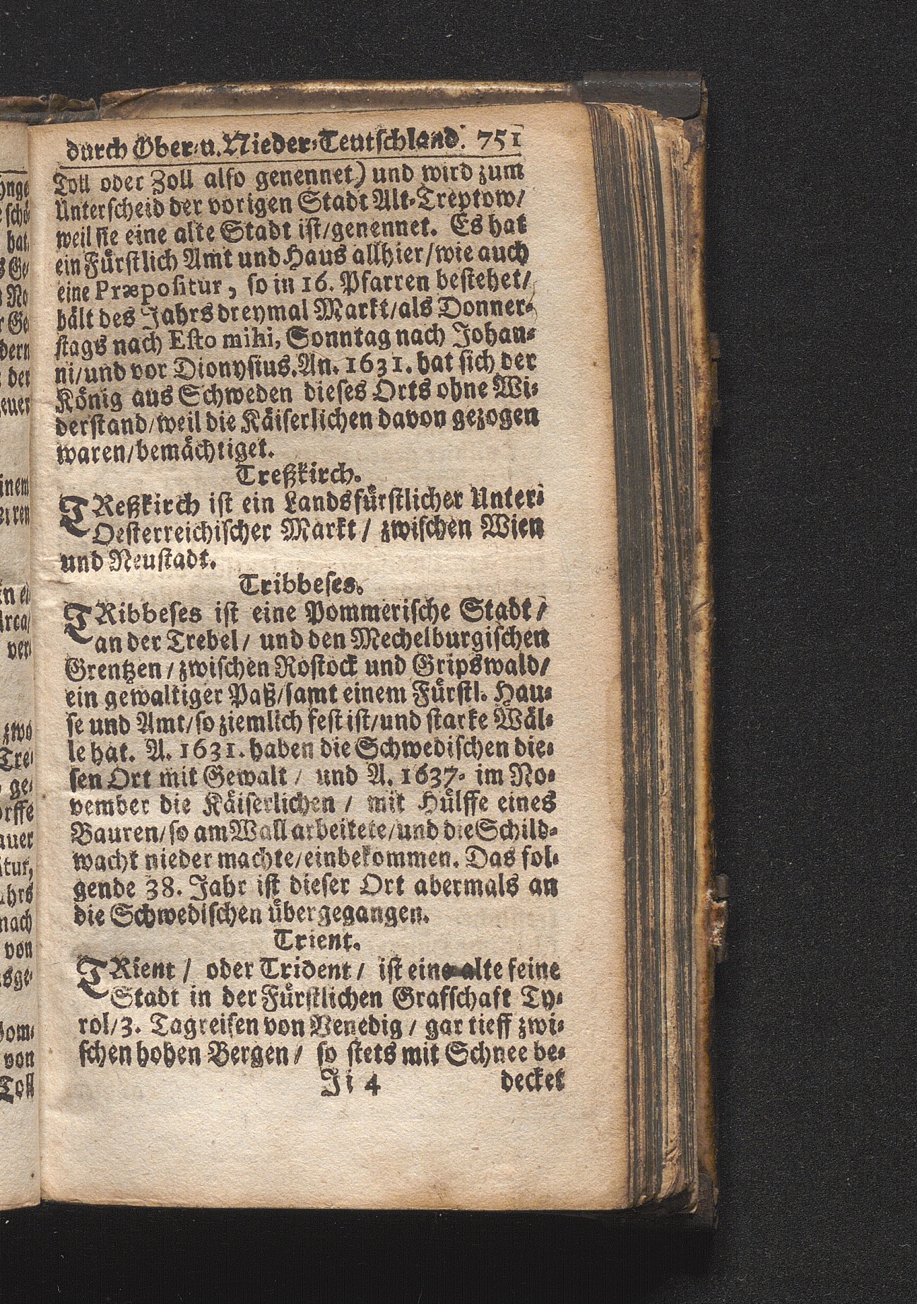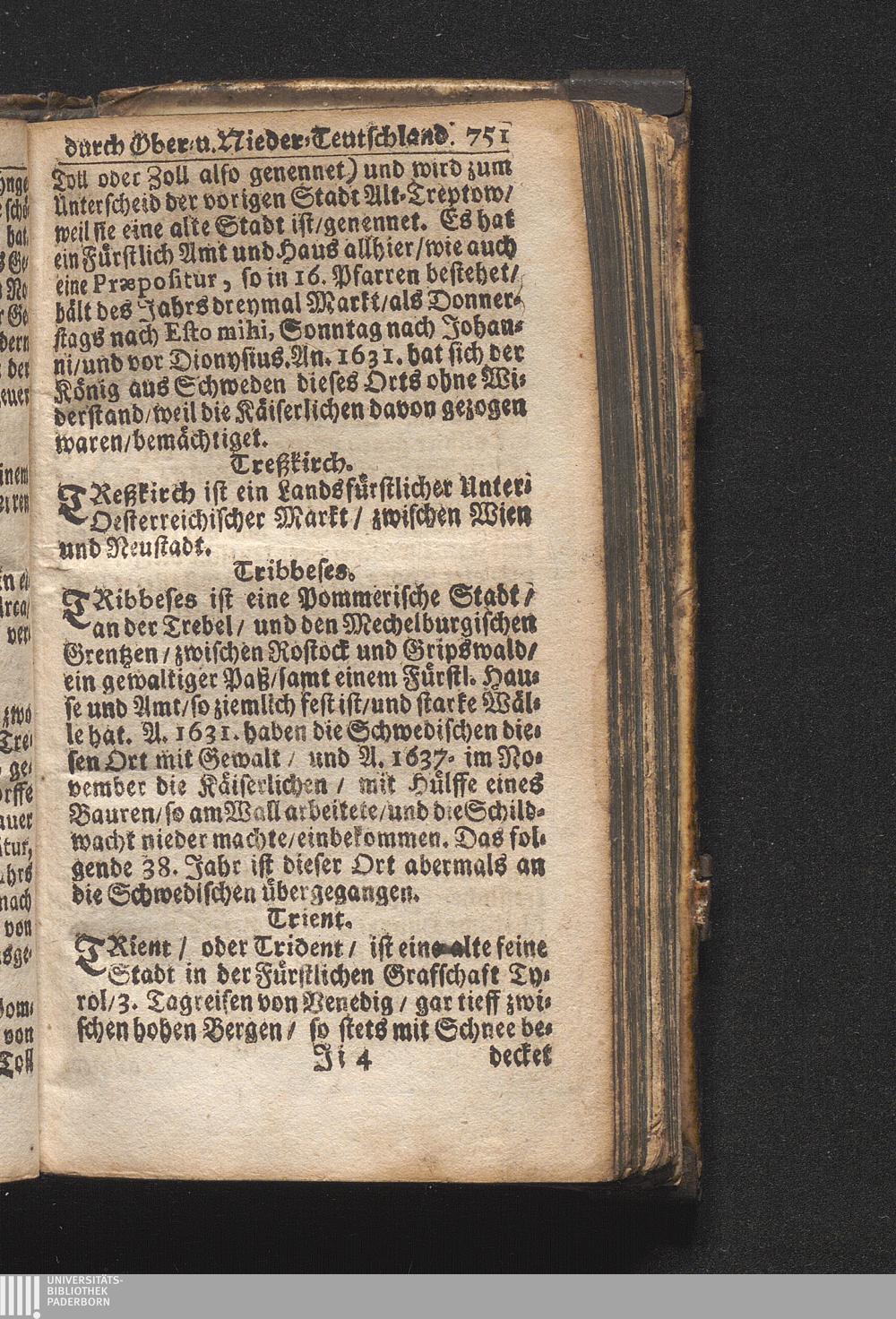 Der getreue Reiß-Gefert durch Ober- und Nieder-Teutschland : Das ist: Grundrichtige und ausführliche Abhandlung derer jenigen Residenzien/ Städte/ Schlösser/ Vestungen/ Städtlein und nahmhafften Markflecken/ welche so wol in Ober- als Nieder-Teutschland/ einem Reisenden sich hin und wieder vorstellig machen und zwar solcher Gestalt/ daß darinn derer Ursprung/ Aufnahm/ Fortification/ Raritäten/ herrliche Gebäue/ und Glück- und Unglücks-Fälle bis auf gegenwärtige Zeit fortgesetzt enthalten. Dabey auch noch über das ein absonderlicher kurz-gefasster Weegweiser angehänget zu finden/ worinnen klärlich zu sehen, wie viel Meilen ein Ort von dem andern entlegen. Alles aus denen bewährtesten Scribenten hervorgesuchet/ zum Nutz-Ergötzen mitgetheilet ...