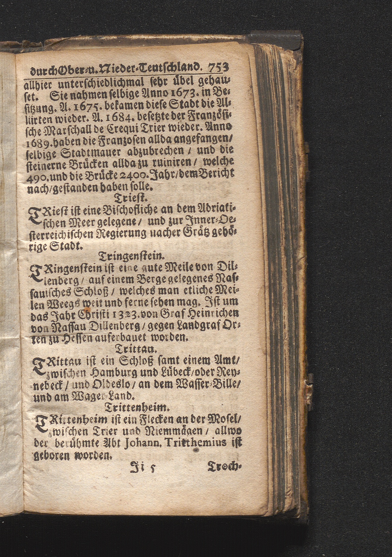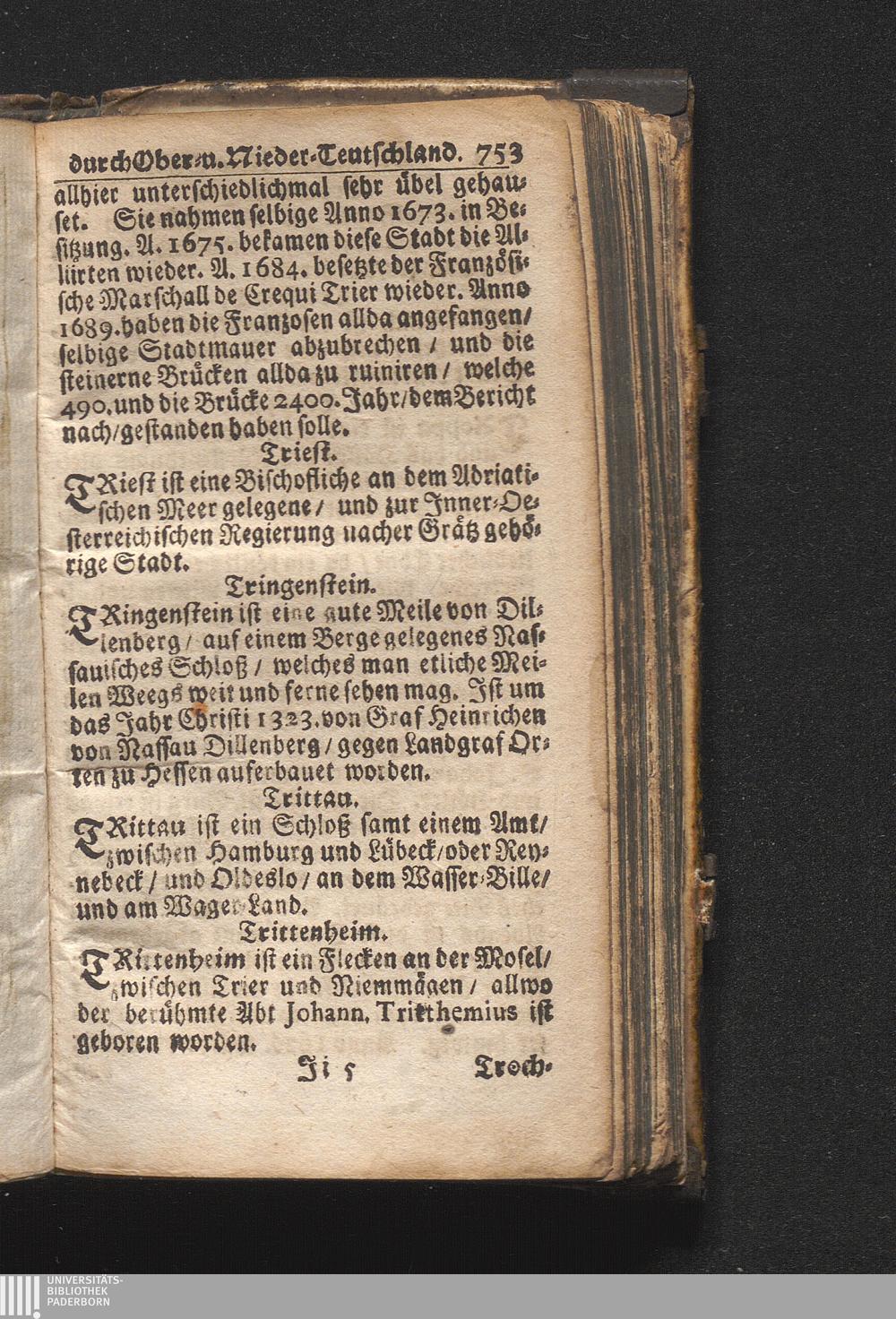 Der getreue Reiß-Gefert durch Ober- und Nieder-Teutschland : Das ist: Grundrichtige und ausführliche Abhandlung derer jenigen Residenzien/ Städte/ Schlösser/ Vestungen/ Städtlein und nahmhafften Markflecken/ welche so wol in Ober- als Nieder-Teutschland/ einem Reisenden sich hin und wieder vorstellig machen und zwar solcher Gestalt/ daß darinn derer Ursprung/ Aufnahm/ Fortification/ Raritäten/ herrliche Gebäue/ und Glück- und Unglücks-Fälle bis auf gegenwärtige Zeit fortgesetzt enthalten. Dabey auch noch über das ein absonderlicher kurz-gefasster Weegweiser angehänget zu finden/ worinnen klärlich zu sehen, wie viel Meilen ein Ort von dem andern entlegen. Alles aus denen bewährtesten Scribenten hervorgesuchet/ zum Nutz-Ergötzen mitgetheilet ...