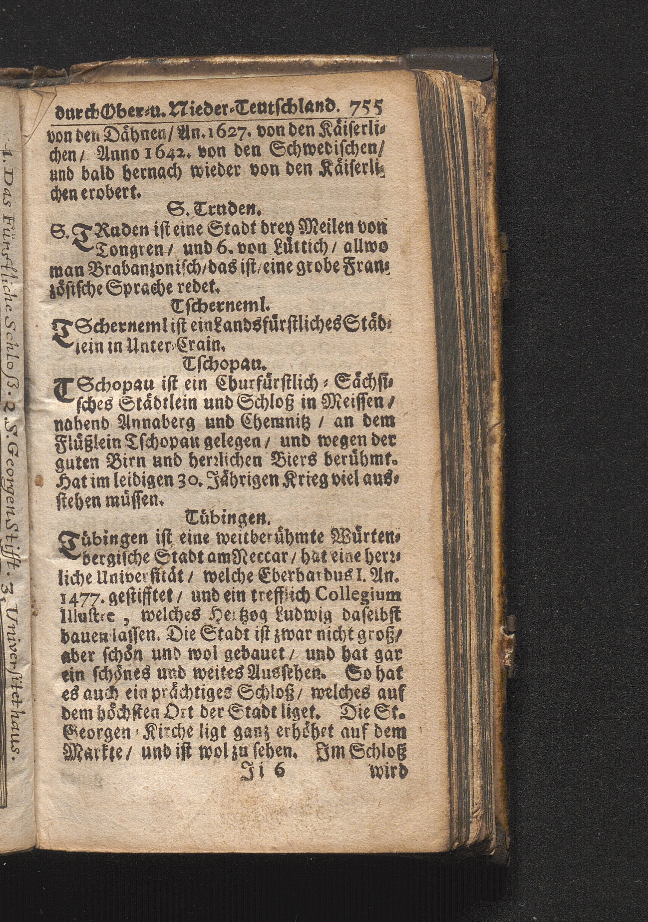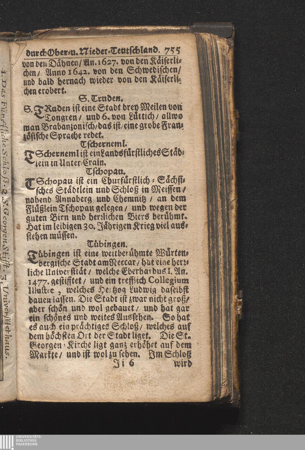 Der getreue Reiß-Gefert durch Ober- und Nieder-Teutschland : Das ist: Grundrichtige und ausführliche Abhandlung derer jenigen Residenzien/ Städte/ Schlösser/ Vestungen/ Städtlein und nahmhafften Markflecken/ welche so wol in Ober- als Nieder-Teutschland/ einem Reisenden sich hin und wieder vorstellig machen und zwar solcher Gestalt/ daß darinn derer Ursprung/ Aufnahm/ Fortification/ Raritäten/ herrliche Gebäue/ und Glück- und Unglücks-Fälle bis auf gegenwärtige Zeit fortgesetzt enthalten. Dabey auch noch über das ein absonderlicher kurz-gefasster Weegweiser angehänget zu finden/ worinnen klärlich zu sehen, wie viel Meilen ein Ort von dem andern entlegen. Alles aus denen bewährtesten Scribenten hervorgesuchet/ zum Nutz-Ergötzen mitgetheilet ...