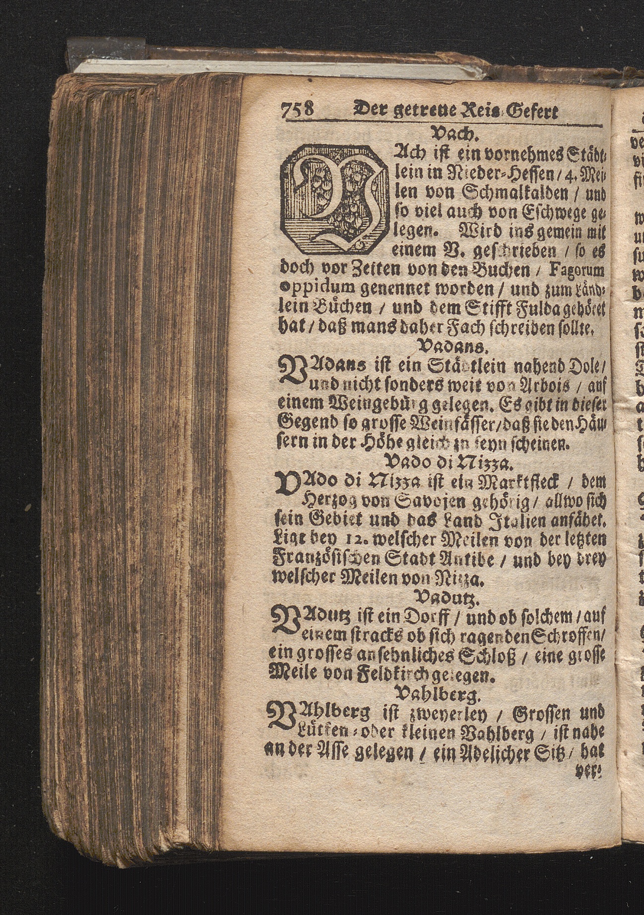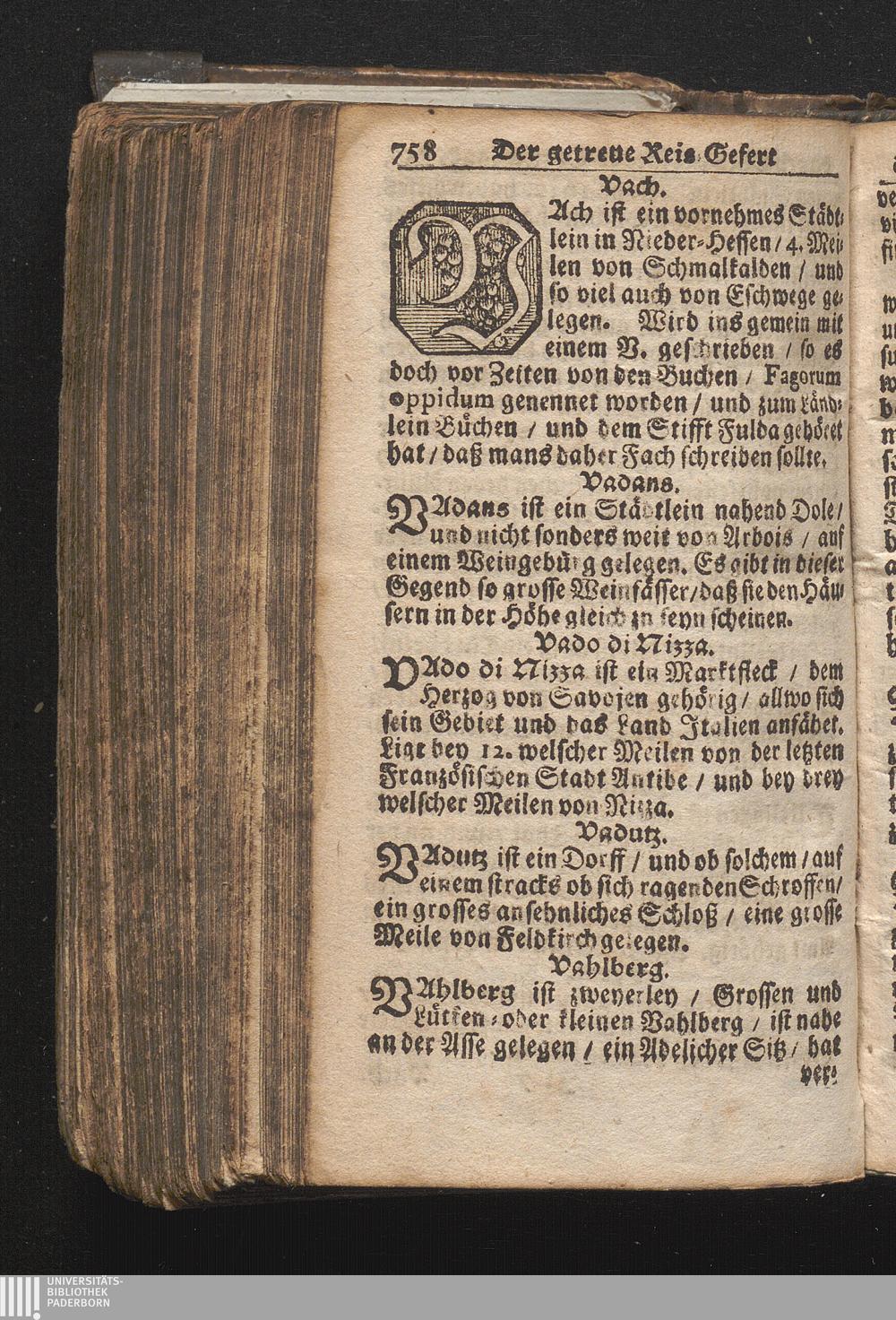 Der getreue Reiß-Gefert durch Ober- und Nieder-Teutschland : Das ist: Grundrichtige und ausführliche Abhandlung derer jenigen Residenzien/ Städte/ Schlösser/ Vestungen/ Städtlein und nahmhafften Markflecken/ welche so wol in Ober- als Nieder-Teutschland/ einem Reisenden sich hin und wieder vorstellig machen und zwar solcher Gestalt/ daß darinn derer Ursprung/ Aufnahm/ Fortification/ Raritäten/ herrliche Gebäue/ und Glück- und Unglücks-Fälle bis auf gegenwärtige Zeit fortgesetzt enthalten. Dabey auch noch über das ein absonderlicher kurz-gefasster Weegweiser angehänget zu finden/ worinnen klärlich zu sehen, wie viel Meilen ein Ort von dem andern entlegen. Alles aus denen bewährtesten Scribenten hervorgesuchet/ zum Nutz-Ergötzen mitgetheilet ...
