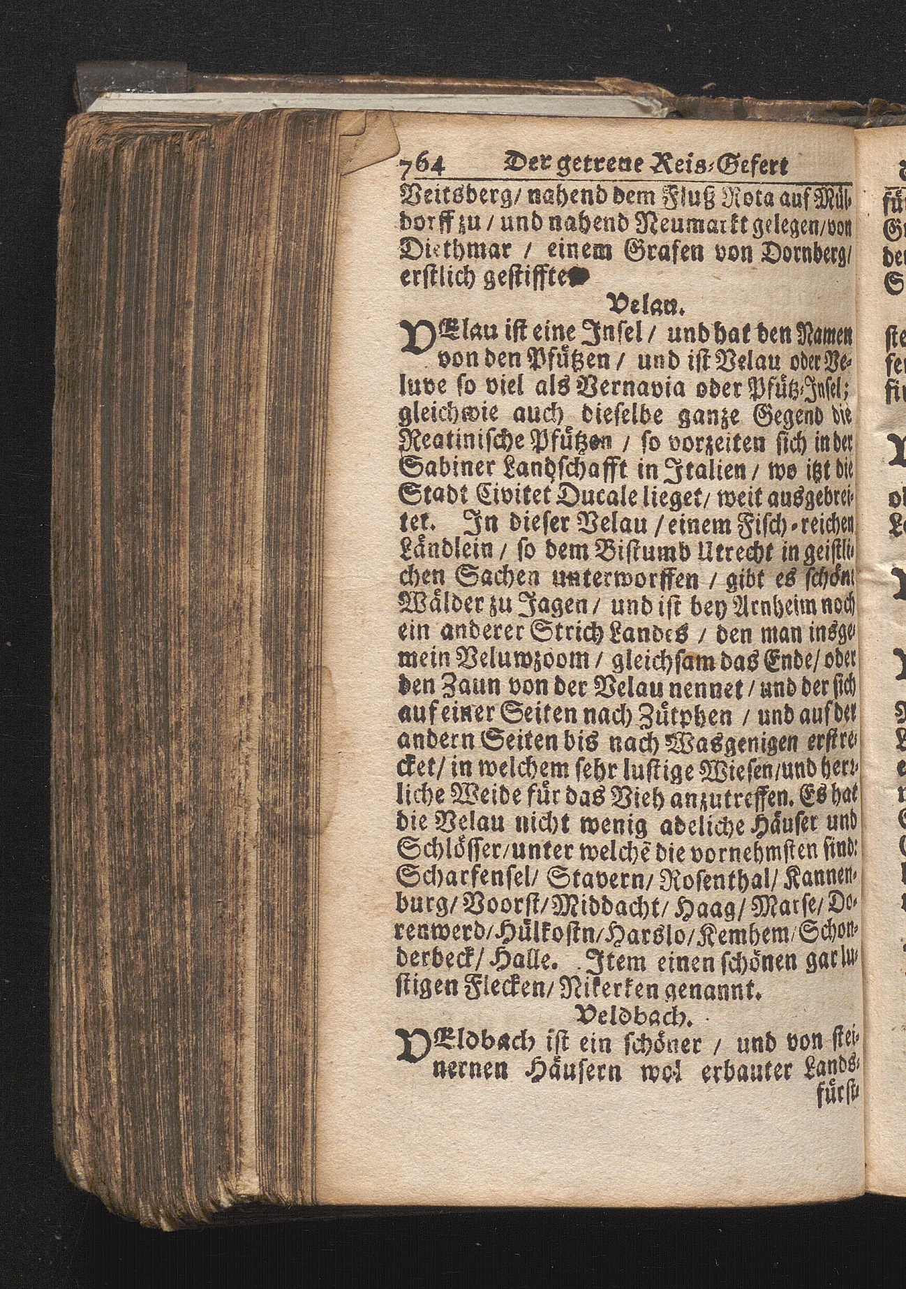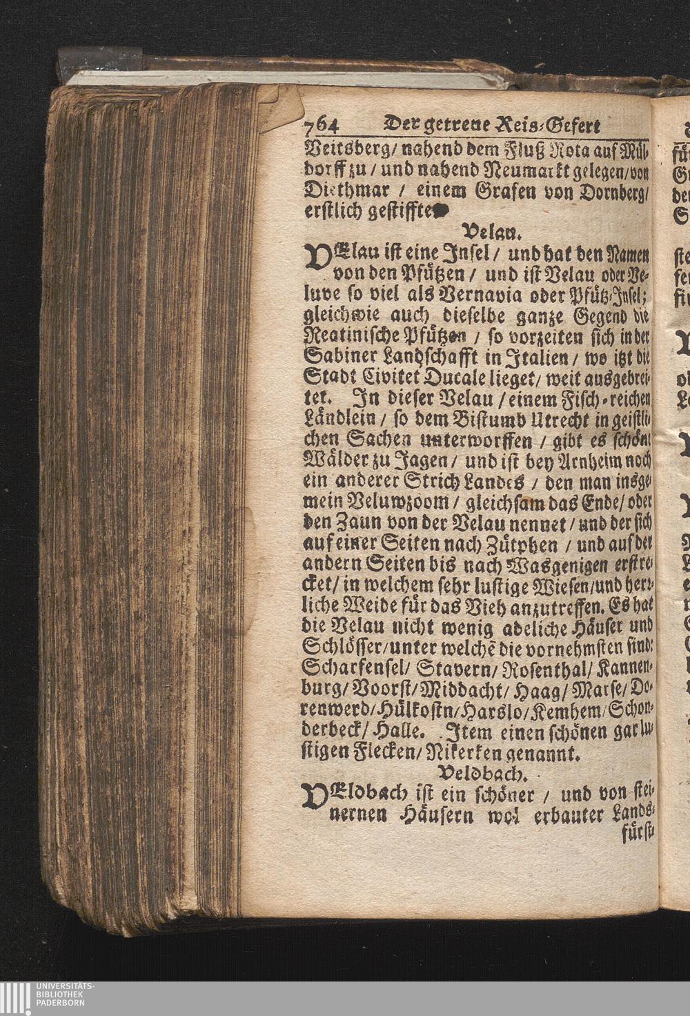 Der getreue Reiß-Gefert durch Ober- und Nieder-Teutschland : Das ist: Grundrichtige und ausführliche Abhandlung derer jenigen Residenzien/ Städte/ Schlösser/ Vestungen/ Städtlein und nahmhafften Markflecken/ welche so wol in Ober- als Nieder-Teutschland/ einem Reisenden sich hin und wieder vorstellig machen und zwar solcher Gestalt/ daß darinn derer Ursprung/ Aufnahm/ Fortification/ Raritäten/ herrliche Gebäue/ und Glück- und Unglücks-Fälle bis auf gegenwärtige Zeit fortgesetzt enthalten. Dabey auch noch über das ein absonderlicher kurz-gefasster Weegweiser angehänget zu finden/ worinnen klärlich zu sehen, wie viel Meilen ein Ort von dem andern entlegen. Alles aus denen bewährtesten Scribenten hervorgesuchet/ zum Nutz-Ergötzen mitgetheilet ...