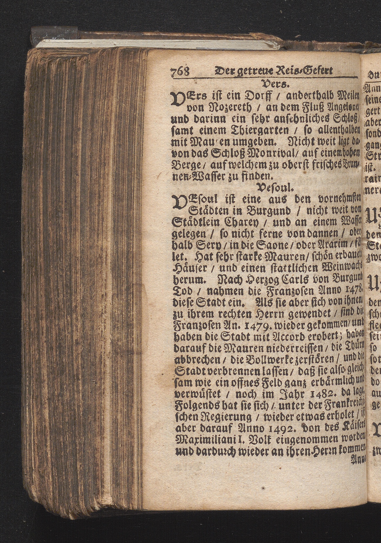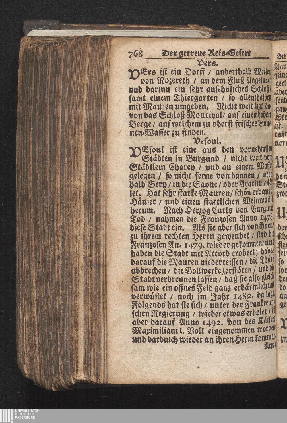 Der getreue Reiß-Gefert durch Ober- und Nieder-Teutschland : Das ist: Grundrichtige und ausführliche Abhandlung derer jenigen Residenzien/ Städte/ Schlösser/ Vestungen/ Städtlein und nahmhafften Markflecken/ welche so wol in Ober- als Nieder-Teutschland/ einem Reisenden sich hin und wieder vorstellig machen und zwar solcher Gestalt/ daß darinn derer Ursprung/ Aufnahm/ Fortification/ Raritäten/ herrliche Gebäue/ und Glück- und Unglücks-Fälle bis auf gegenwärtige Zeit fortgesetzt enthalten. Dabey auch noch über das ein absonderlicher kurz-gefasster Weegweiser angehänget zu finden/ worinnen klärlich zu sehen, wie viel Meilen ein Ort von dem andern entlegen. Alles aus denen bewährtesten Scribenten hervorgesuchet/ zum Nutz-Ergötzen mitgetheilet ...