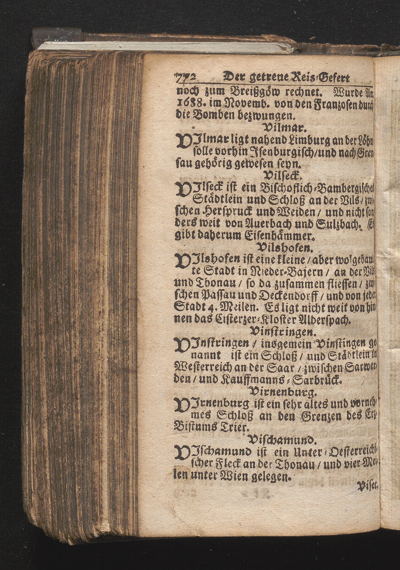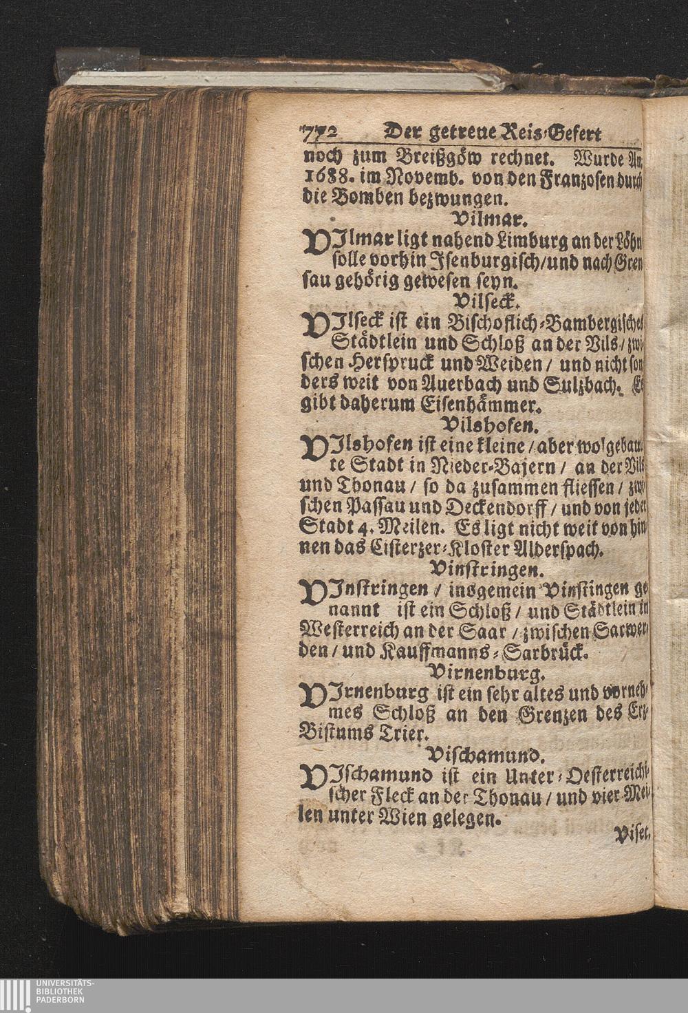 Der getreue Reiß-Gefert durch Ober- und Nieder-Teutschland : Das ist: Grundrichtige und ausführliche Abhandlung derer jenigen Residenzien/ Städte/ Schlösser/ Vestungen/ Städtlein und nahmhafften Markflecken/ welche so wol in Ober- als Nieder-Teutschland/ einem Reisenden sich hin und wieder vorstellig machen und zwar solcher Gestalt/ daß darinn derer Ursprung/ Aufnahm/ Fortification/ Raritäten/ herrliche Gebäue/ und Glück- und Unglücks-Fälle bis auf gegenwärtige Zeit fortgesetzt enthalten. Dabey auch noch über das ein absonderlicher kurz-gefasster Weegweiser angehänget zu finden/ worinnen klärlich zu sehen, wie viel Meilen ein Ort von dem andern entlegen. Alles aus denen bewährtesten Scribenten hervorgesuchet/ zum Nutz-Ergötzen mitgetheilet ...