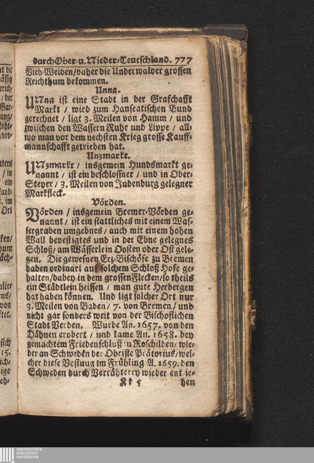 Der getreue Reiß-Gefert durch Ober- und Nieder-Teutschland : Das ist: Grundrichtige und ausführliche Abhandlung derer jenigen Residenzien/ Städte/ Schlösser/ Vestungen/ Städtlein und nahmhafften Markflecken/ welche so wol in Ober- als Nieder-Teutschland/ einem Reisenden sich hin und wieder vorstellig machen und zwar solcher Gestalt/ daß darinn derer Ursprung/ Aufnahm/ Fortification/ Raritäten/ herrliche Gebäue/ und Glück- und Unglücks-Fälle bis auf gegenwärtige Zeit fortgesetzt enthalten. Dabey auch noch über das ein absonderlicher kurz-gefasster Weegweiser angehänget zu finden/ worinnen klärlich zu sehen, wie viel Meilen ein Ort von dem andern entlegen. Alles aus denen bewährtesten Scribenten hervorgesuchet/ zum Nutz-Ergötzen mitgetheilet ...