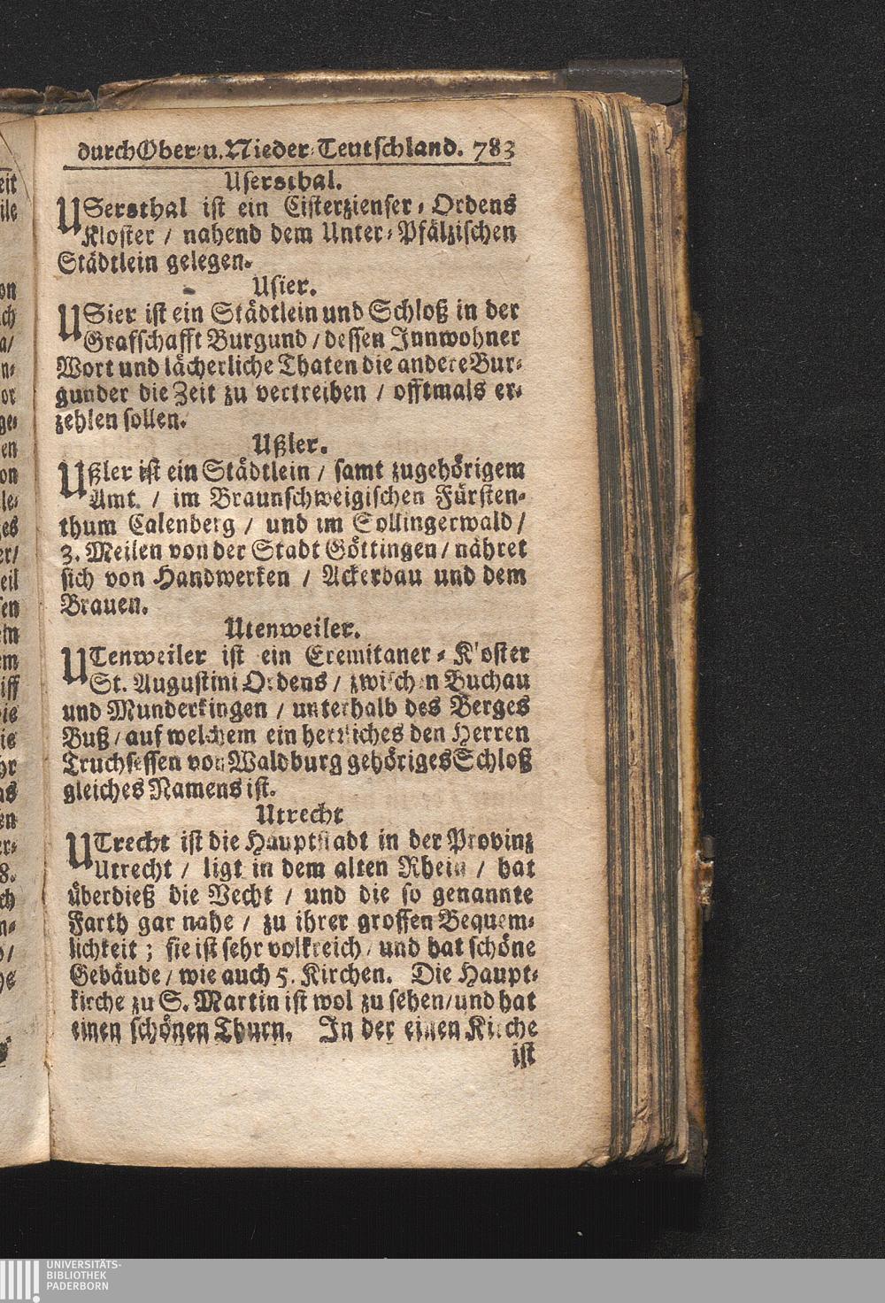 Der getreue Reiß-Gefert durch Ober- und Nieder-Teutschland : Das ist: Grundrichtige und ausführliche Abhandlung derer jenigen Residenzien/ Städte/ Schlösser/ Vestungen/ Städtlein und nahmhafften Markflecken/ welche so wol in Ober- als Nieder-Teutschland/ einem Reisenden sich hin und wieder vorstellig machen und zwar solcher Gestalt/ daß darinn derer Ursprung/ Aufnahm/ Fortification/ Raritäten/ herrliche Gebäue/ und Glück- und Unglücks-Fälle bis auf gegenwärtige Zeit fortgesetzt enthalten. Dabey auch noch über das ein absonderlicher kurz-gefasster Weegweiser angehänget zu finden/ worinnen klärlich zu sehen, wie viel Meilen ein Ort von dem andern entlegen. Alles aus denen bewährtesten Scribenten hervorgesuchet/ zum Nutz-Ergötzen mitgetheilet ...