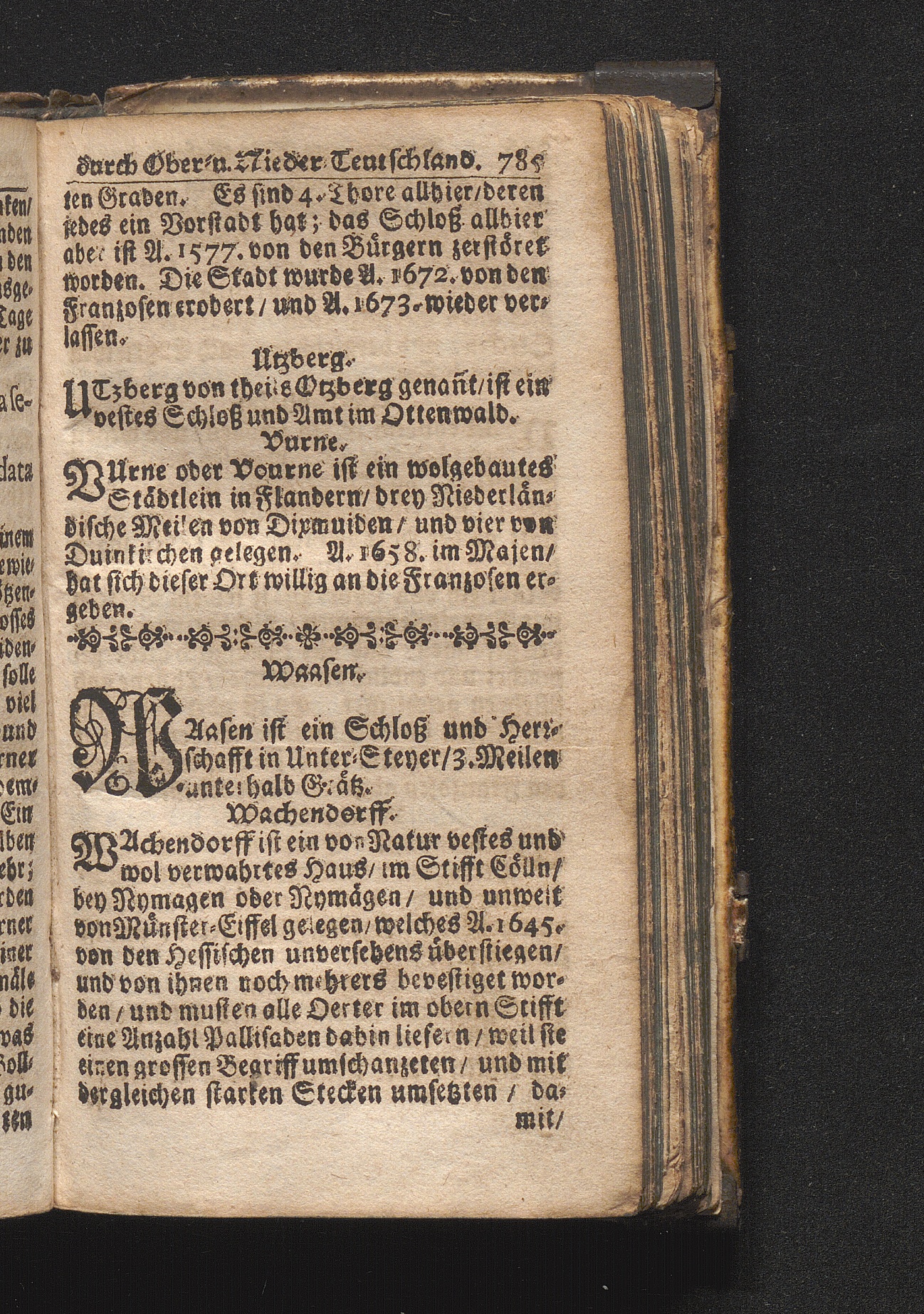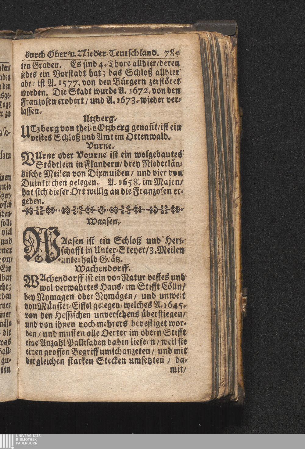 Der getreue Reiß-Gefert durch Ober- und Nieder-Teutschland : Das ist: Grundrichtige und ausführliche Abhandlung derer jenigen Residenzien/ Städte/ Schlösser/ Vestungen/ Städtlein und nahmhafften Markflecken/ welche so wol in Ober- als Nieder-Teutschland/ einem Reisenden sich hin und wieder vorstellig machen und zwar solcher Gestalt/ daß darinn derer Ursprung/ Aufnahm/ Fortification/ Raritäten/ herrliche Gebäue/ und Glück- und Unglücks-Fälle bis auf gegenwärtige Zeit fortgesetzt enthalten. Dabey auch noch über das ein absonderlicher kurz-gefasster Weegweiser angehänget zu finden/ worinnen klärlich zu sehen, wie viel Meilen ein Ort von dem andern entlegen. Alles aus denen bewährtesten Scribenten hervorgesuchet/ zum Nutz-Ergötzen mitgetheilet ...