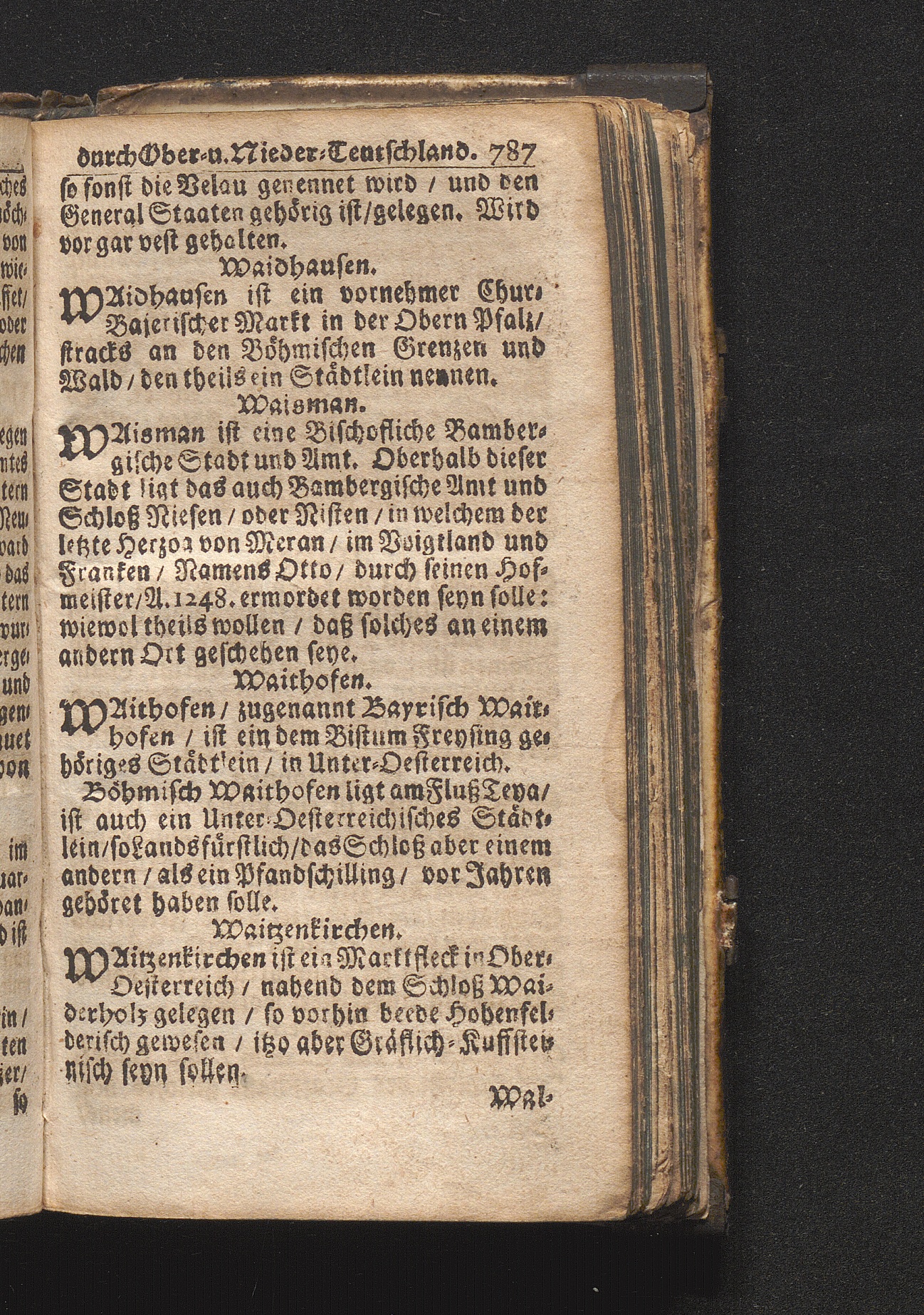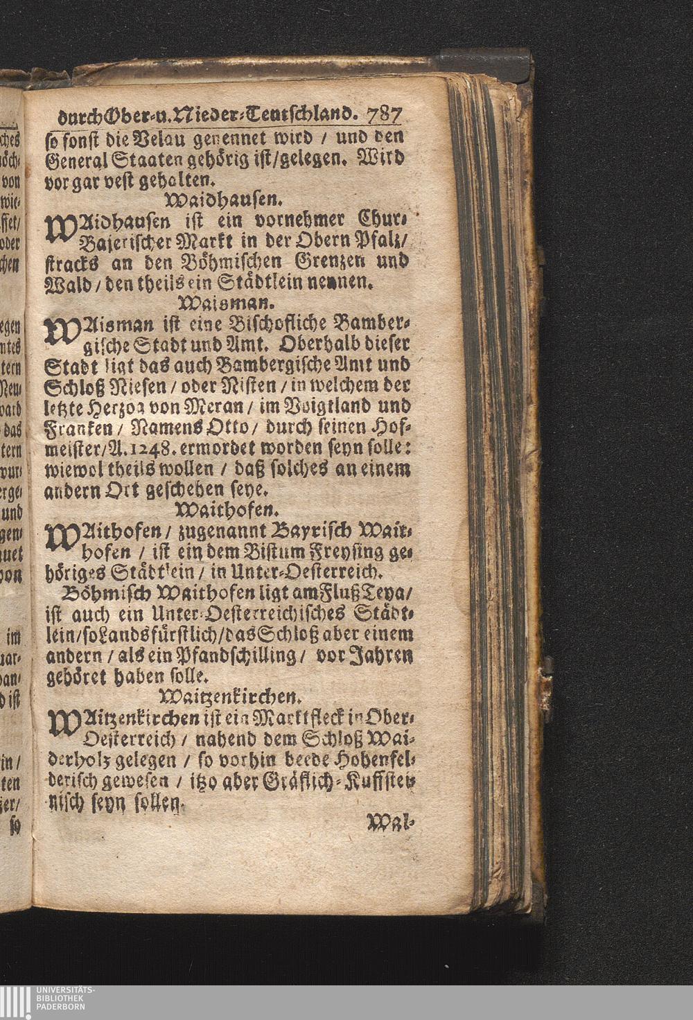 Der getreue Reiß-Gefert durch Ober- und Nieder-Teutschland : Das ist: Grundrichtige und ausführliche Abhandlung derer jenigen Residenzien/ Städte/ Schlösser/ Vestungen/ Städtlein und nahmhafften Markflecken/ welche so wol in Ober- als Nieder-Teutschland/ einem Reisenden sich hin und wieder vorstellig machen und zwar solcher Gestalt/ daß darinn derer Ursprung/ Aufnahm/ Fortification/ Raritäten/ herrliche Gebäue/ und Glück- und Unglücks-Fälle bis auf gegenwärtige Zeit fortgesetzt enthalten. Dabey auch noch über das ein absonderlicher kurz-gefasster Weegweiser angehänget zu finden/ worinnen klärlich zu sehen, wie viel Meilen ein Ort von dem andern entlegen. Alles aus denen bewährtesten Scribenten hervorgesuchet/ zum Nutz-Ergötzen mitgetheilet ...