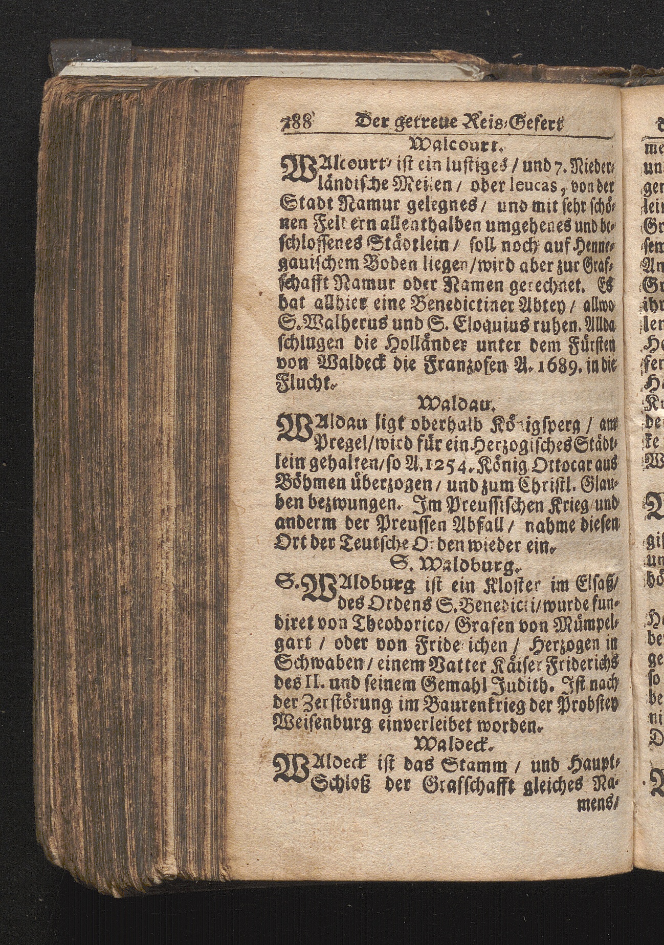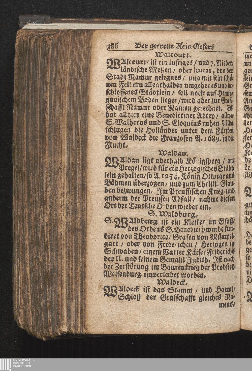 Der getreue Reiß-Gefert durch Ober- und Nieder-Teutschland : Das ist: Grundrichtige und ausführliche Abhandlung derer jenigen Residenzien/ Städte/ Schlösser/ Vestungen/ Städtlein und nahmhafften Markflecken/ welche so wol in Ober- als Nieder-Teutschland/ einem Reisenden sich hin und wieder vorstellig machen und zwar solcher Gestalt/ daß darinn derer Ursprung/ Aufnahm/ Fortification/ Raritäten/ herrliche Gebäue/ und Glück- und Unglücks-Fälle bis auf gegenwärtige Zeit fortgesetzt enthalten. Dabey auch noch über das ein absonderlicher kurz-gefasster Weegweiser angehänget zu finden/ worinnen klärlich zu sehen, wie viel Meilen ein Ort von dem andern entlegen. Alles aus denen bewährtesten Scribenten hervorgesuchet/ zum Nutz-Ergötzen mitgetheilet ...