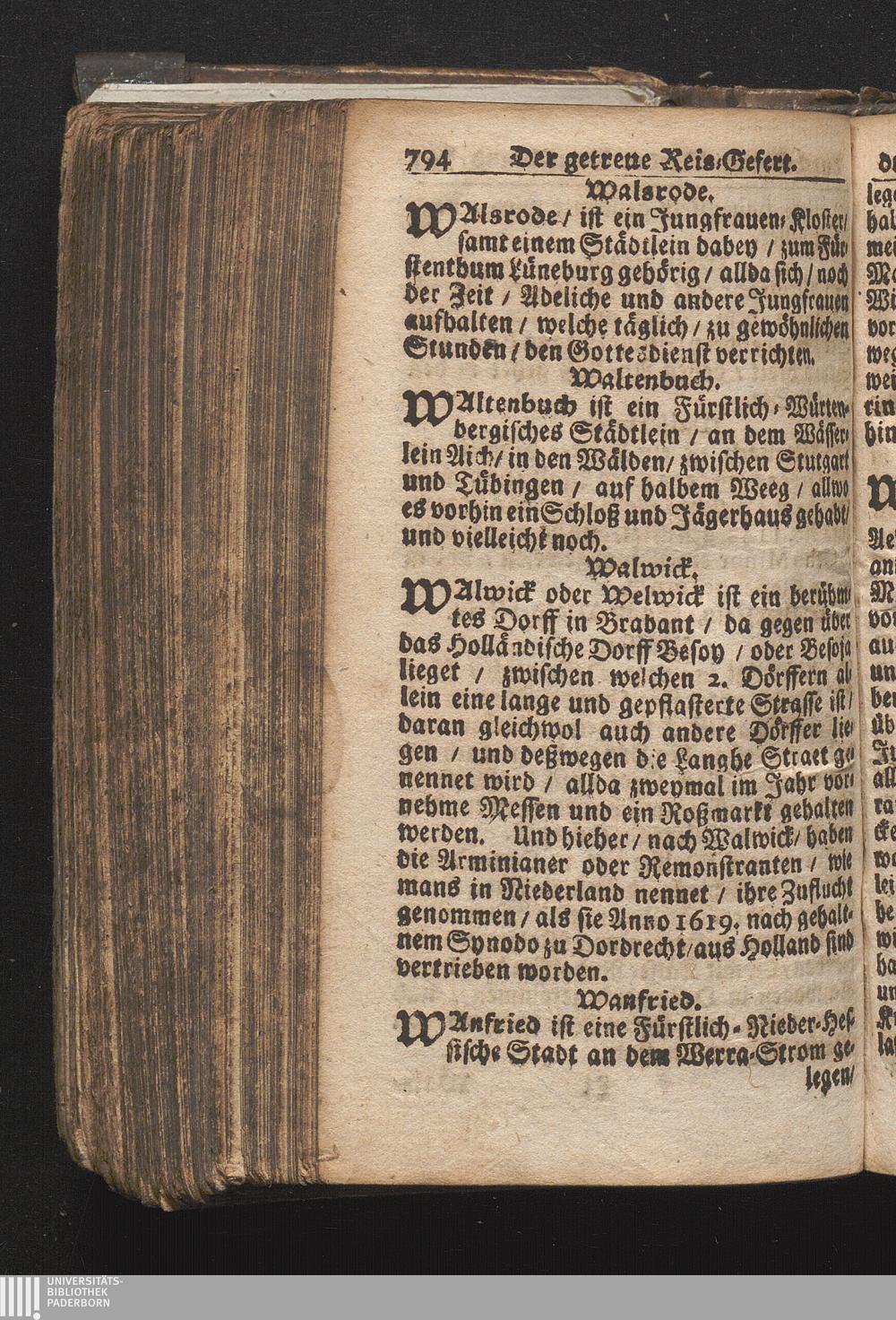 Der getreue Reiß-Gefert durch Ober- und Nieder-Teutschland : Das ist: Grundrichtige und ausführliche Abhandlung derer jenigen Residenzien/ Städte/ Schlösser/ Vestungen/ Städtlein und nahmhafften Markflecken/ welche so wol in Ober- als Nieder-Teutschland/ einem Reisenden sich hin und wieder vorstellig machen und zwar solcher Gestalt/ daß darinn derer Ursprung/ Aufnahm/ Fortification/ Raritäten/ herrliche Gebäue/ und Glück- und Unglücks-Fälle bis auf gegenwärtige Zeit fortgesetzt enthalten. Dabey auch noch über das ein absonderlicher kurz-gefasster Weegweiser angehänget zu finden/ worinnen klärlich zu sehen, wie viel Meilen ein Ort von dem andern entlegen. Alles aus denen bewährtesten Scribenten hervorgesuchet/ zum Nutz-Ergötzen mitgetheilet ...