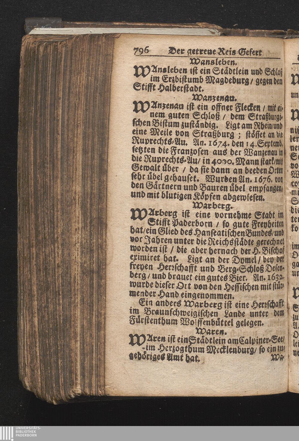 Der getreue Reiß-Gefert durch Ober- und Nieder-Teutschland : Das ist: Grundrichtige und ausführliche Abhandlung derer jenigen Residenzien/ Städte/ Schlösser/ Vestungen/ Städtlein und nahmhafften Markflecken/ welche so wol in Ober- als Nieder-Teutschland/ einem Reisenden sich hin und wieder vorstellig machen und zwar solcher Gestalt/ daß darinn derer Ursprung/ Aufnahm/ Fortification/ Raritäten/ herrliche Gebäue/ und Glück- und Unglücks-Fälle bis auf gegenwärtige Zeit fortgesetzt enthalten. Dabey auch noch über das ein absonderlicher kurz-gefasster Weegweiser angehänget zu finden/ worinnen klärlich zu sehen, wie viel Meilen ein Ort von dem andern entlegen. Alles aus denen bewährtesten Scribenten hervorgesuchet/ zum Nutz-Ergötzen mitgetheilet ...