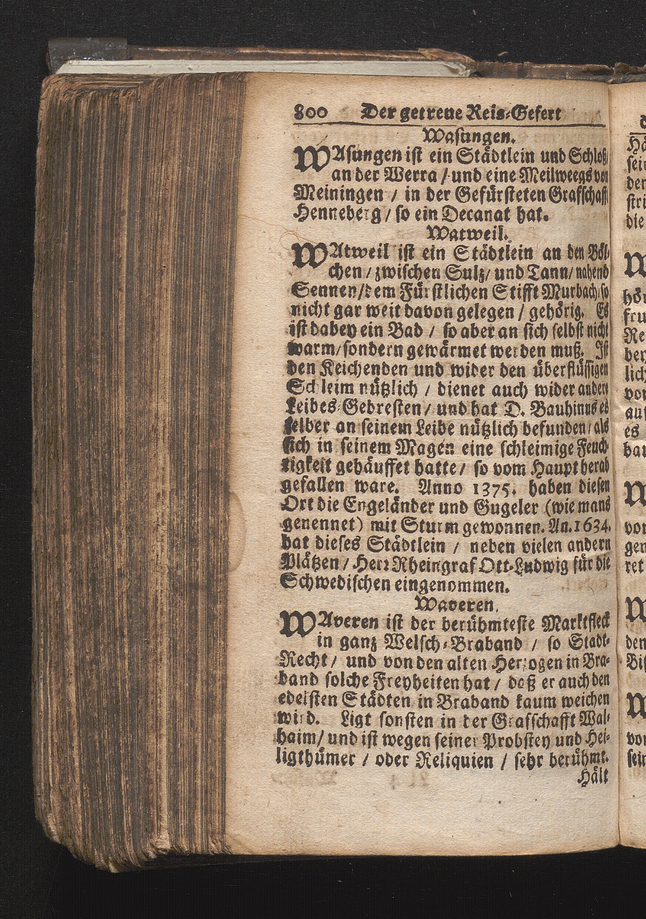 Der getreue Reiß-Gefert durch Ober- und Nieder-Teutschland : Das ist: Grundrichtige und ausführliche Abhandlung derer jenigen Residenzien/ Städte/ Schlösser/ Vestungen/ Städtlein und nahmhafften Markflecken/ welche so wol in Ober- als Nieder-Teutschland/ einem Reisenden sich hin und wieder vorstellig machen und zwar solcher Gestalt/ daß darinn derer Ursprung/ Aufnahm/ Fortification/ Raritäten/ herrliche Gebäue/ und Glück- und Unglücks-Fälle bis auf gegenwärtige Zeit fortgesetzt enthalten. Dabey auch noch über das ein absonderlicher kurz-gefasster Weegweiser angehänget zu finden/ worinnen klärlich zu sehen, wie viel Meilen ein Ort von dem andern entlegen. Alles aus denen bewährtesten Scribenten hervorgesuchet/ zum Nutz-Ergötzen mitgetheilet ...