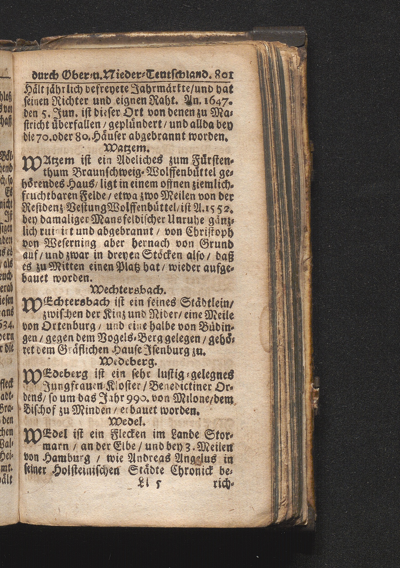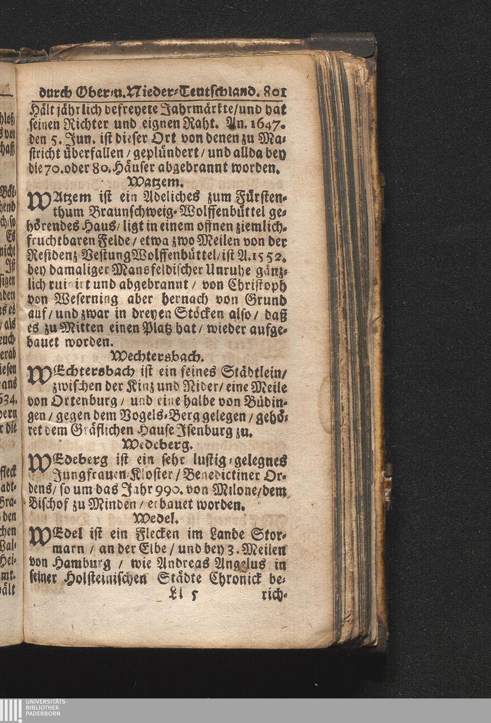Der getreue Reiß-Gefert durch Ober- und Nieder-Teutschland : Das ist: Grundrichtige und ausführliche Abhandlung derer jenigen Residenzien/ Städte/ Schlösser/ Vestungen/ Städtlein und nahmhafften Markflecken/ welche so wol in Ober- als Nieder-Teutschland/ einem Reisenden sich hin und wieder vorstellig machen und zwar solcher Gestalt/ daß darinn derer Ursprung/ Aufnahm/ Fortification/ Raritäten/ herrliche Gebäue/ und Glück- und Unglücks-Fälle bis auf gegenwärtige Zeit fortgesetzt enthalten. Dabey auch noch über das ein absonderlicher kurz-gefasster Weegweiser angehänget zu finden/ worinnen klärlich zu sehen, wie viel Meilen ein Ort von dem andern entlegen. Alles aus denen bewährtesten Scribenten hervorgesuchet/ zum Nutz-Ergötzen mitgetheilet ...