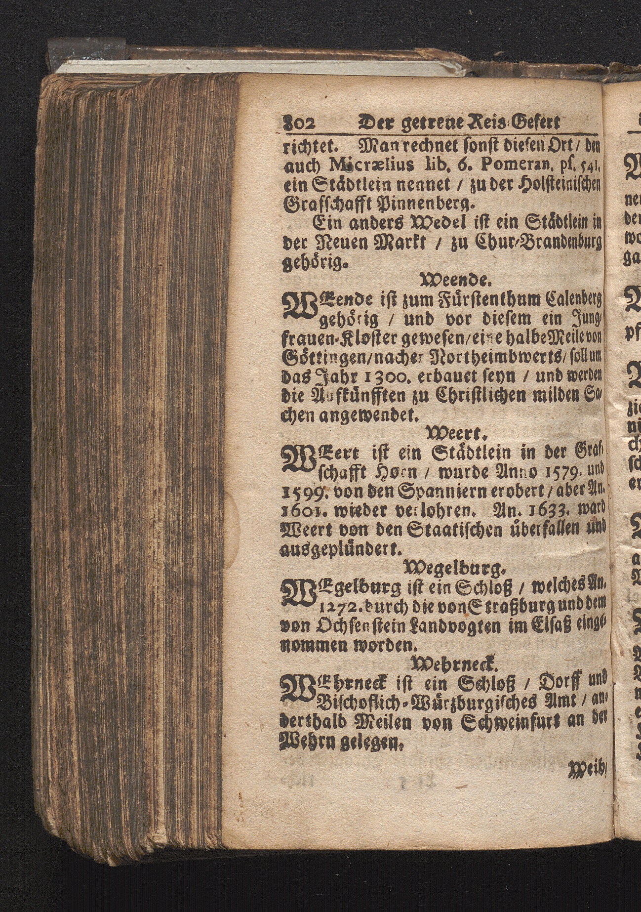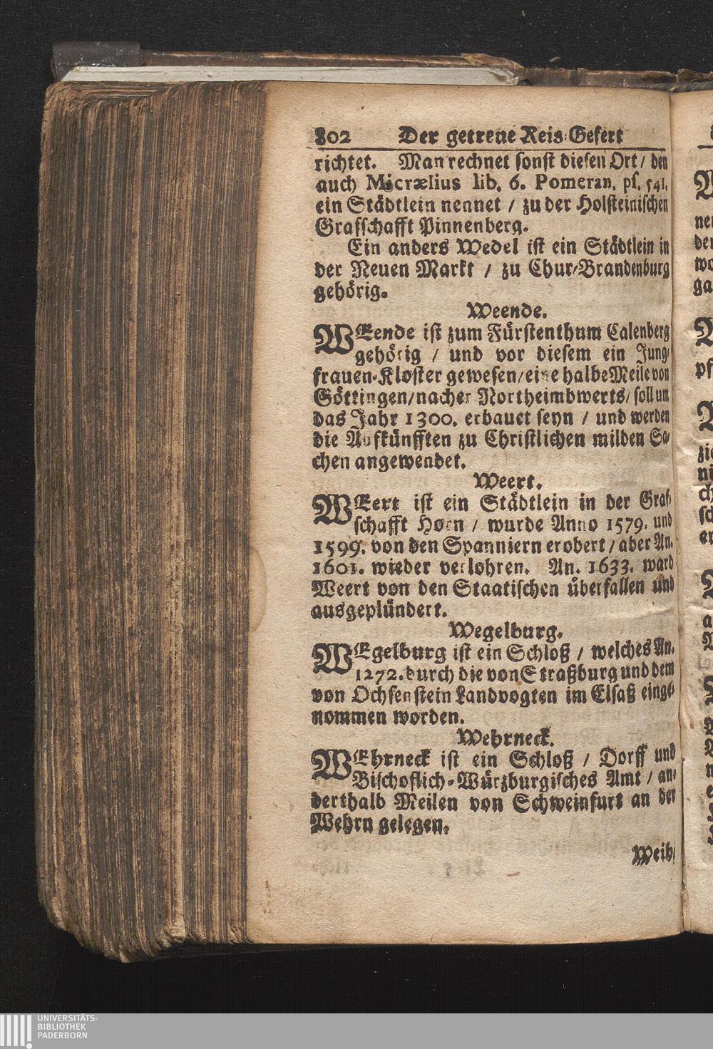 Der getreue Reiß-Gefert durch Ober- und Nieder-Teutschland : Das ist: Grundrichtige und ausführliche Abhandlung derer jenigen Residenzien/ Städte/ Schlösser/ Vestungen/ Städtlein und nahmhafften Markflecken/ welche so wol in Ober- als Nieder-Teutschland/ einem Reisenden sich hin und wieder vorstellig machen und zwar solcher Gestalt/ daß darinn derer Ursprung/ Aufnahm/ Fortification/ Raritäten/ herrliche Gebäue/ und Glück- und Unglücks-Fälle bis auf gegenwärtige Zeit fortgesetzt enthalten. Dabey auch noch über das ein absonderlicher kurz-gefasster Weegweiser angehänget zu finden/ worinnen klärlich zu sehen, wie viel Meilen ein Ort von dem andern entlegen. Alles aus denen bewährtesten Scribenten hervorgesuchet/ zum Nutz-Ergötzen mitgetheilet ...