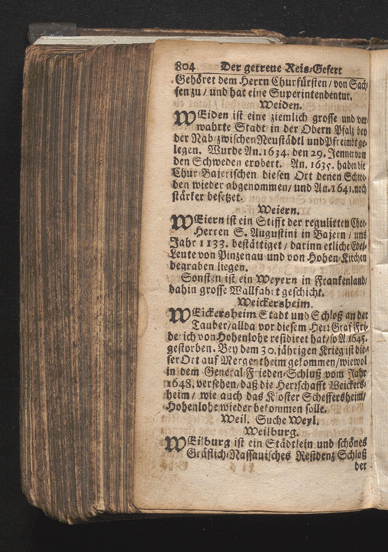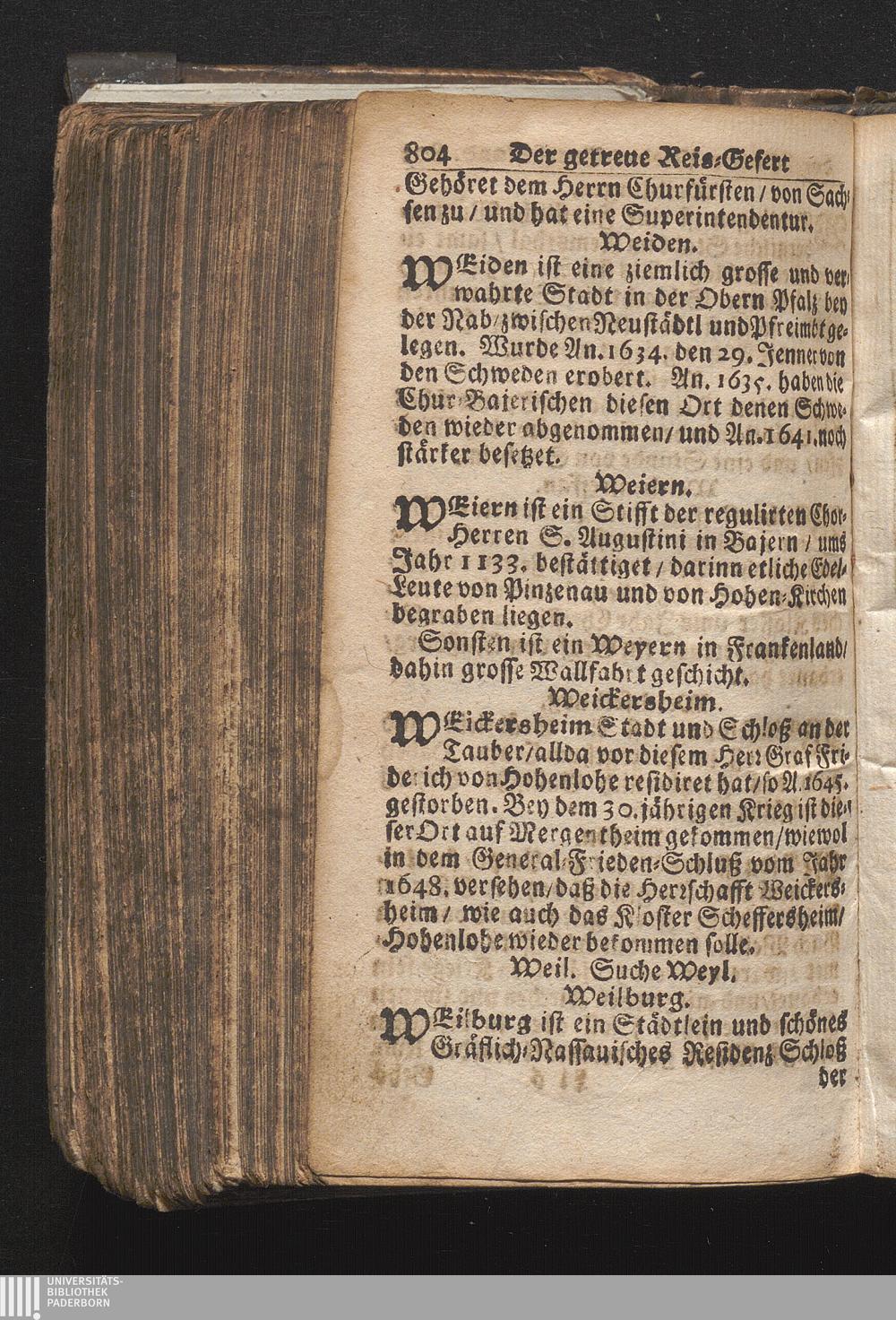Der getreue Reiß-Gefert durch Ober- und Nieder-Teutschland : Das ist: Grundrichtige und ausführliche Abhandlung derer jenigen Residenzien/ Städte/ Schlösser/ Vestungen/ Städtlein und nahmhafften Markflecken/ welche so wol in Ober- als Nieder-Teutschland/ einem Reisenden sich hin und wieder vorstellig machen und zwar solcher Gestalt/ daß darinn derer Ursprung/ Aufnahm/ Fortification/ Raritäten/ herrliche Gebäue/ und Glück- und Unglücks-Fälle bis auf gegenwärtige Zeit fortgesetzt enthalten. Dabey auch noch über das ein absonderlicher kurz-gefasster Weegweiser angehänget zu finden/ worinnen klärlich zu sehen, wie viel Meilen ein Ort von dem andern entlegen. Alles aus denen bewährtesten Scribenten hervorgesuchet/ zum Nutz-Ergötzen mitgetheilet ...