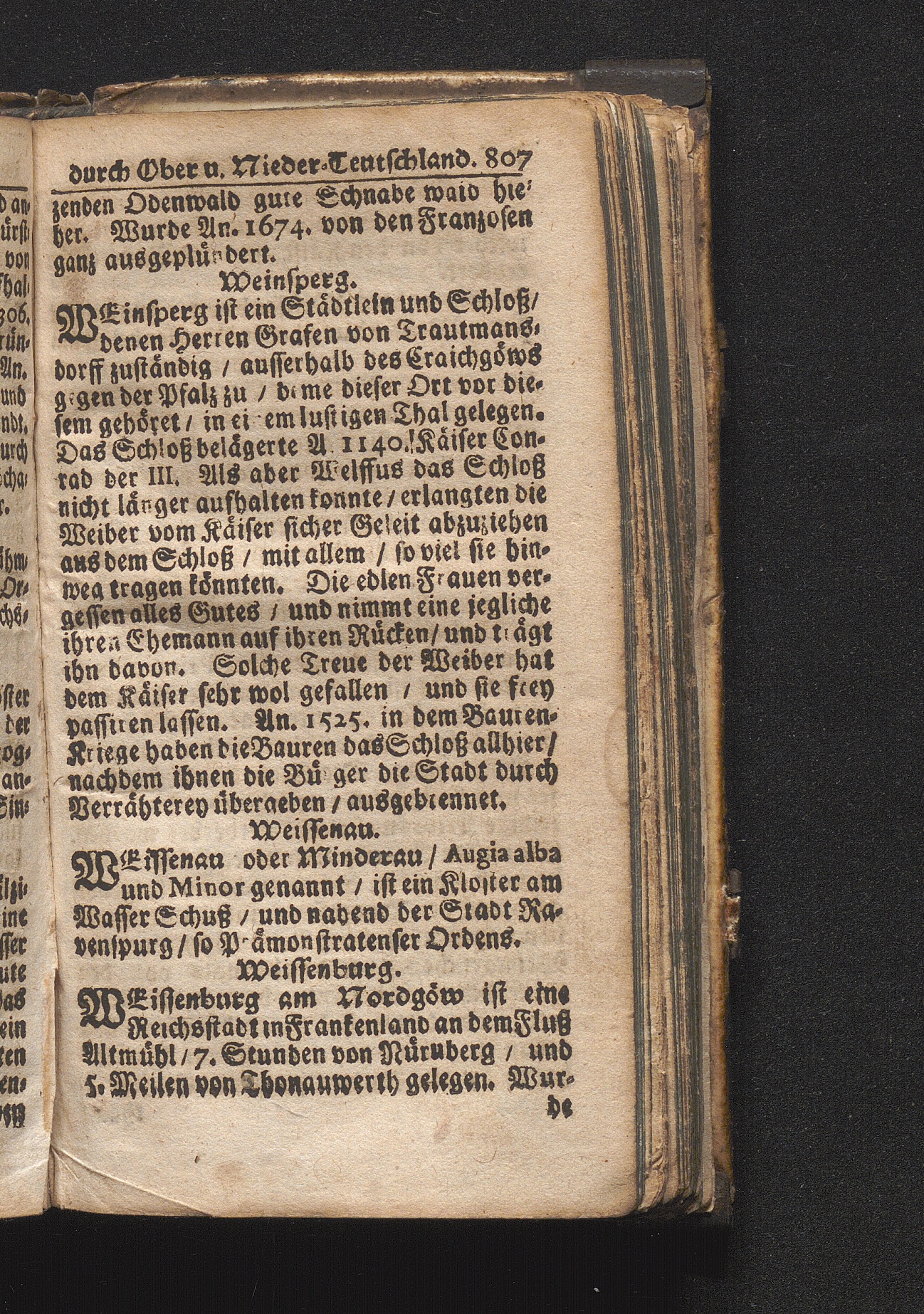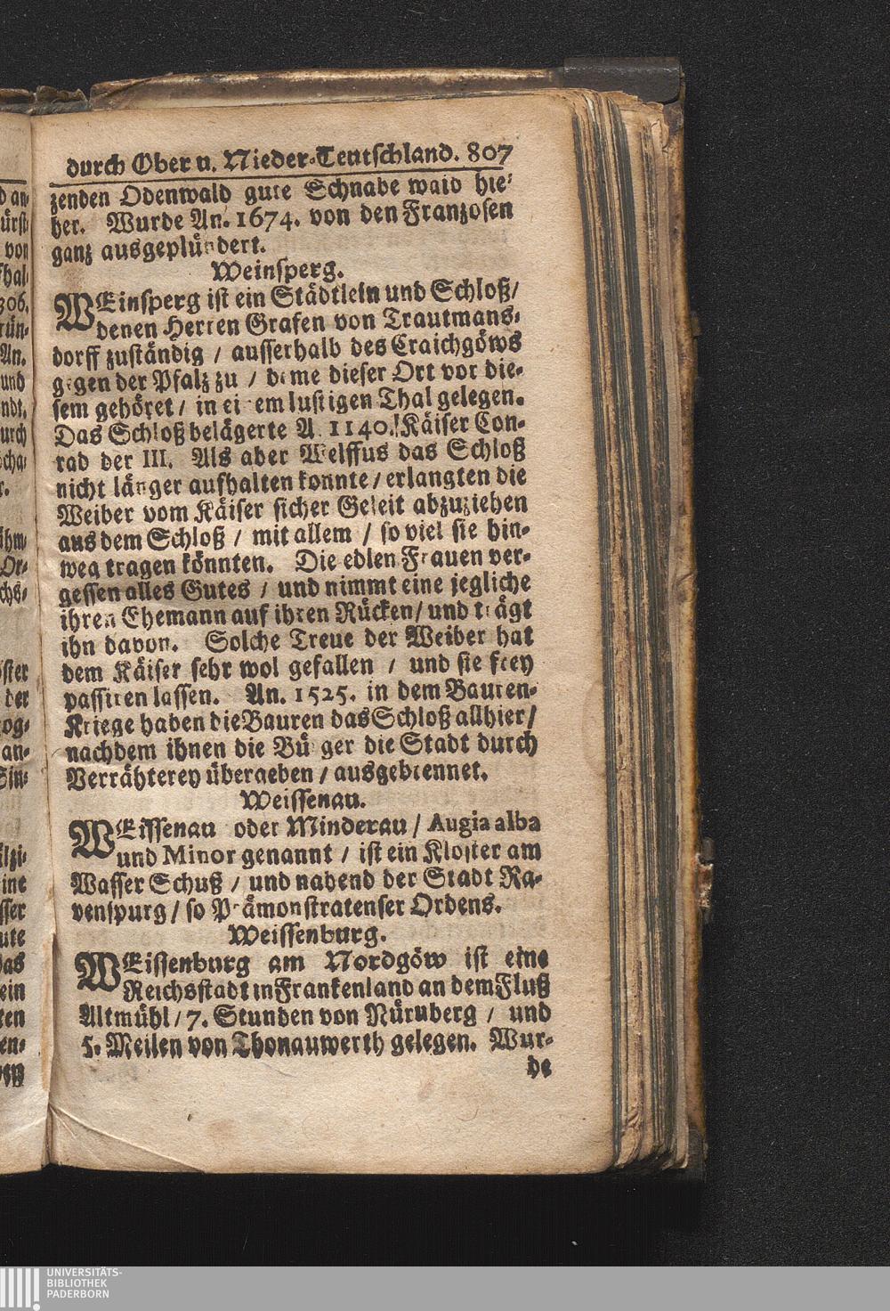 Der getreue Reiß-Gefert durch Ober- und Nieder-Teutschland : Das ist: Grundrichtige und ausführliche Abhandlung derer jenigen Residenzien/ Städte/ Schlösser/ Vestungen/ Städtlein und nahmhafften Markflecken/ welche so wol in Ober- als Nieder-Teutschland/ einem Reisenden sich hin und wieder vorstellig machen und zwar solcher Gestalt/ daß darinn derer Ursprung/ Aufnahm/ Fortification/ Raritäten/ herrliche Gebäue/ und Glück- und Unglücks-Fälle bis auf gegenwärtige Zeit fortgesetzt enthalten. Dabey auch noch über das ein absonderlicher kurz-gefasster Weegweiser angehänget zu finden/ worinnen klärlich zu sehen, wie viel Meilen ein Ort von dem andern entlegen. Alles aus denen bewährtesten Scribenten hervorgesuchet/ zum Nutz-Ergötzen mitgetheilet ...
