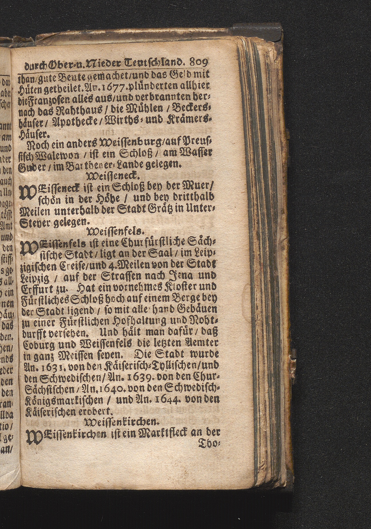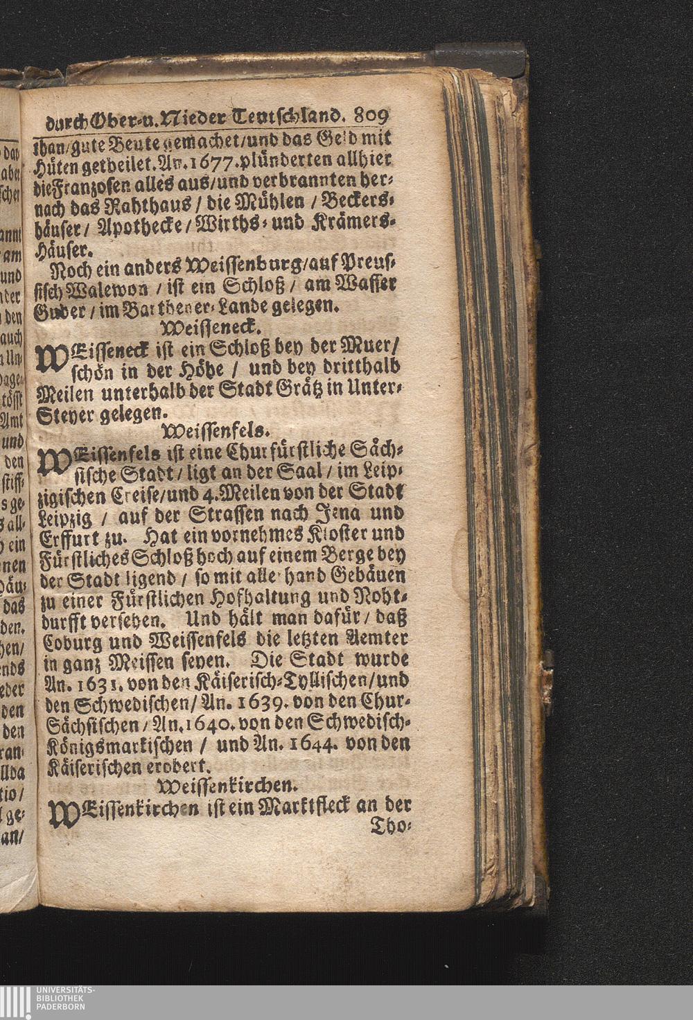 Der getreue Reiß-Gefert durch Ober- und Nieder-Teutschland : Das ist: Grundrichtige und ausführliche Abhandlung derer jenigen Residenzien/ Städte/ Schlösser/ Vestungen/ Städtlein und nahmhafften Markflecken/ welche so wol in Ober- als Nieder-Teutschland/ einem Reisenden sich hin und wieder vorstellig machen und zwar solcher Gestalt/ daß darinn derer Ursprung/ Aufnahm/ Fortification/ Raritäten/ herrliche Gebäue/ und Glück- und Unglücks-Fälle bis auf gegenwärtige Zeit fortgesetzt enthalten. Dabey auch noch über das ein absonderlicher kurz-gefasster Weegweiser angehänget zu finden/ worinnen klärlich zu sehen, wie viel Meilen ein Ort von dem andern entlegen. Alles aus denen bewährtesten Scribenten hervorgesuchet/ zum Nutz-Ergötzen mitgetheilet ...