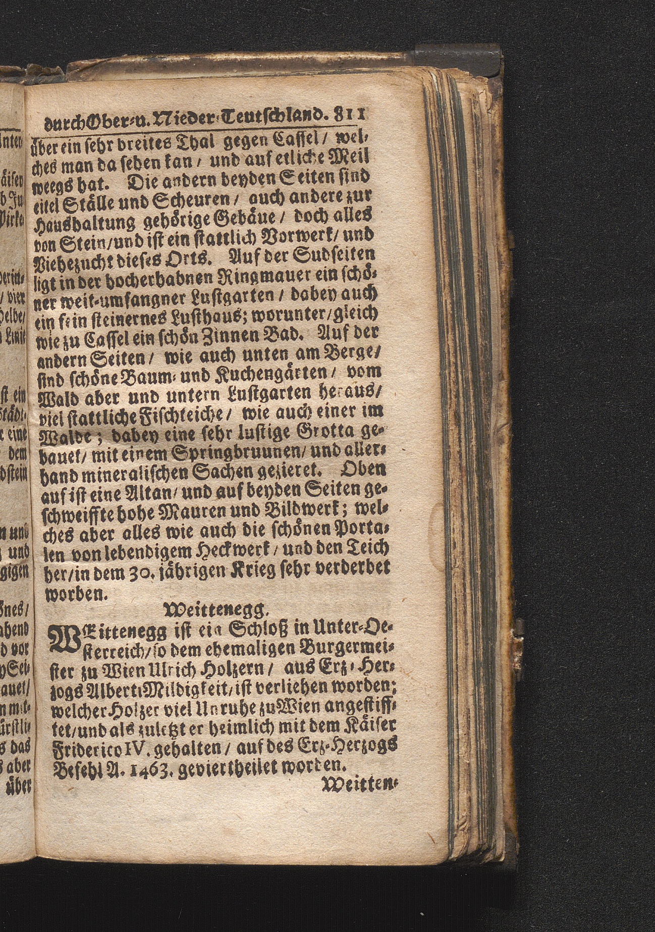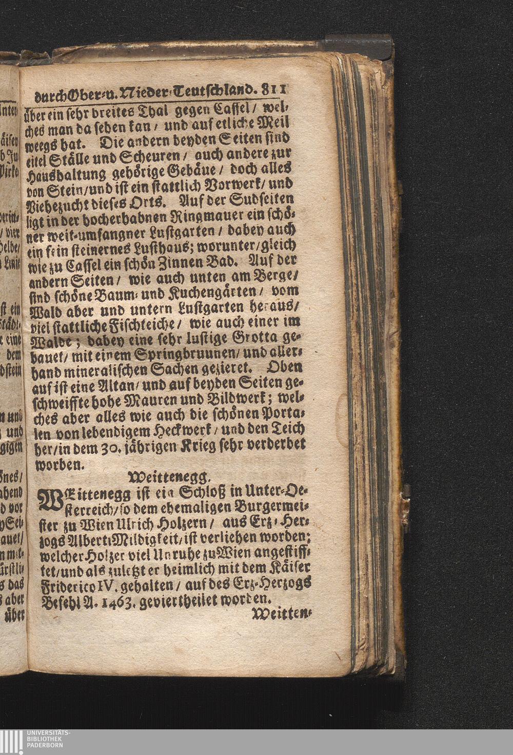 Der getreue Reiß-Gefert durch Ober- und Nieder-Teutschland : Das ist: Grundrichtige und ausführliche Abhandlung derer jenigen Residenzien/ Städte/ Schlösser/ Vestungen/ Städtlein und nahmhafften Markflecken/ welche so wol in Ober- als Nieder-Teutschland/ einem Reisenden sich hin und wieder vorstellig machen und zwar solcher Gestalt/ daß darinn derer Ursprung/ Aufnahm/ Fortification/ Raritäten/ herrliche Gebäue/ und Glück- und Unglücks-Fälle bis auf gegenwärtige Zeit fortgesetzt enthalten. Dabey auch noch über das ein absonderlicher kurz-gefasster Weegweiser angehänget zu finden/ worinnen klärlich zu sehen, wie viel Meilen ein Ort von dem andern entlegen. Alles aus denen bewährtesten Scribenten hervorgesuchet/ zum Nutz-Ergötzen mitgetheilet ...