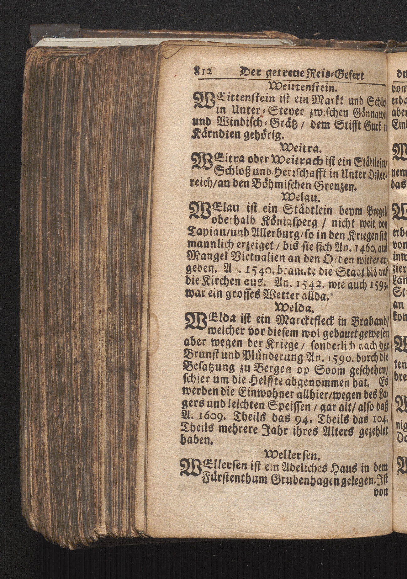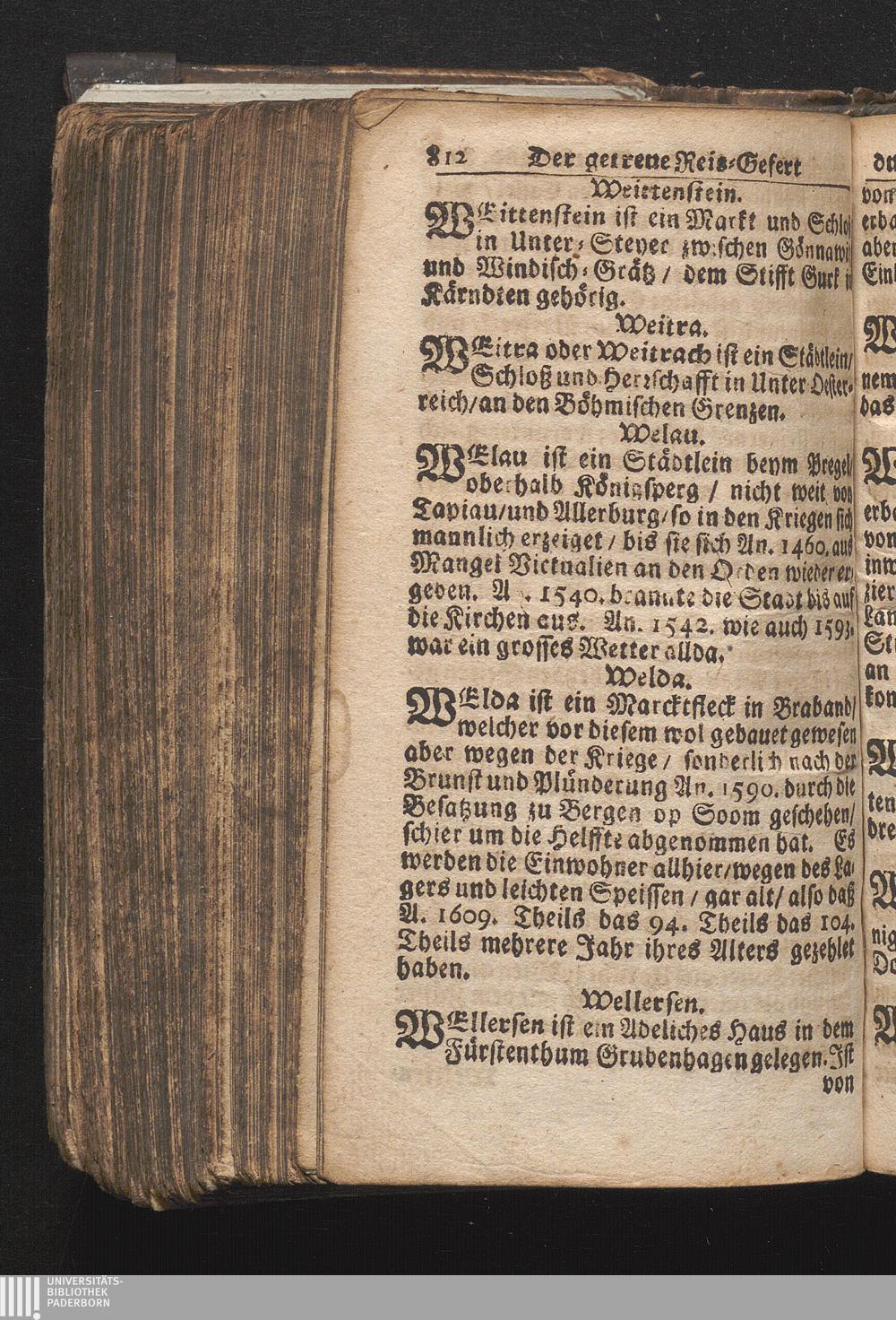 Der getreue Reiß-Gefert durch Ober- und Nieder-Teutschland : Das ist: Grundrichtige und ausführliche Abhandlung derer jenigen Residenzien/ Städte/ Schlösser/ Vestungen/ Städtlein und nahmhafften Markflecken/ welche so wol in Ober- als Nieder-Teutschland/ einem Reisenden sich hin und wieder vorstellig machen und zwar solcher Gestalt/ daß darinn derer Ursprung/ Aufnahm/ Fortification/ Raritäten/ herrliche Gebäue/ und Glück- und Unglücks-Fälle bis auf gegenwärtige Zeit fortgesetzt enthalten. Dabey auch noch über das ein absonderlicher kurz-gefasster Weegweiser angehänget zu finden/ worinnen klärlich zu sehen, wie viel Meilen ein Ort von dem andern entlegen. Alles aus denen bewährtesten Scribenten hervorgesuchet/ zum Nutz-Ergötzen mitgetheilet ...