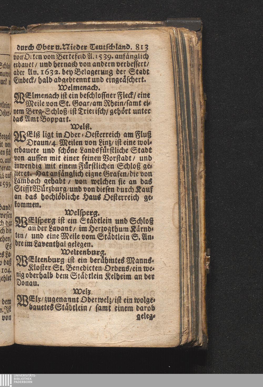 Der getreue Reiß-Gefert durch Ober- und Nieder-Teutschland : Das ist: Grundrichtige und ausführliche Abhandlung derer jenigen Residenzien/ Städte/ Schlösser/ Vestungen/ Städtlein und nahmhafften Markflecken/ welche so wol in Ober- als Nieder-Teutschland/ einem Reisenden sich hin und wieder vorstellig machen und zwar solcher Gestalt/ daß darinn derer Ursprung/ Aufnahm/ Fortification/ Raritäten/ herrliche Gebäue/ und Glück- und Unglücks-Fälle bis auf gegenwärtige Zeit fortgesetzt enthalten. Dabey auch noch über das ein absonderlicher kurz-gefasster Weegweiser angehänget zu finden/ worinnen klärlich zu sehen, wie viel Meilen ein Ort von dem andern entlegen. Alles aus denen bewährtesten Scribenten hervorgesuchet/ zum Nutz-Ergötzen mitgetheilet ...