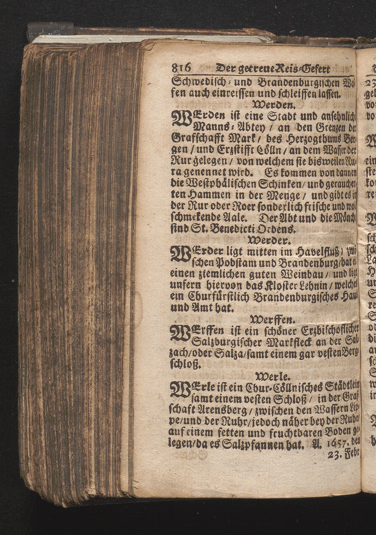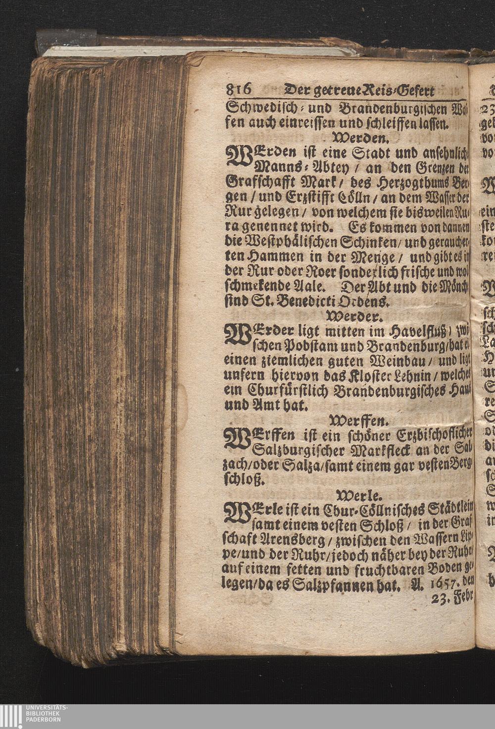 Der getreue Reiß-Gefert durch Ober- und Nieder-Teutschland : Das ist: Grundrichtige und ausführliche Abhandlung derer jenigen Residenzien/ Städte/ Schlösser/ Vestungen/ Städtlein und nahmhafften Markflecken/ welche so wol in Ober- als Nieder-Teutschland/ einem Reisenden sich hin und wieder vorstellig machen und zwar solcher Gestalt/ daß darinn derer Ursprung/ Aufnahm/ Fortification/ Raritäten/ herrliche Gebäue/ und Glück- und Unglücks-Fälle bis auf gegenwärtige Zeit fortgesetzt enthalten. Dabey auch noch über das ein absonderlicher kurz-gefasster Weegweiser angehänget zu finden/ worinnen klärlich zu sehen, wie viel Meilen ein Ort von dem andern entlegen. Alles aus denen bewährtesten Scribenten hervorgesuchet/ zum Nutz-Ergötzen mitgetheilet ...