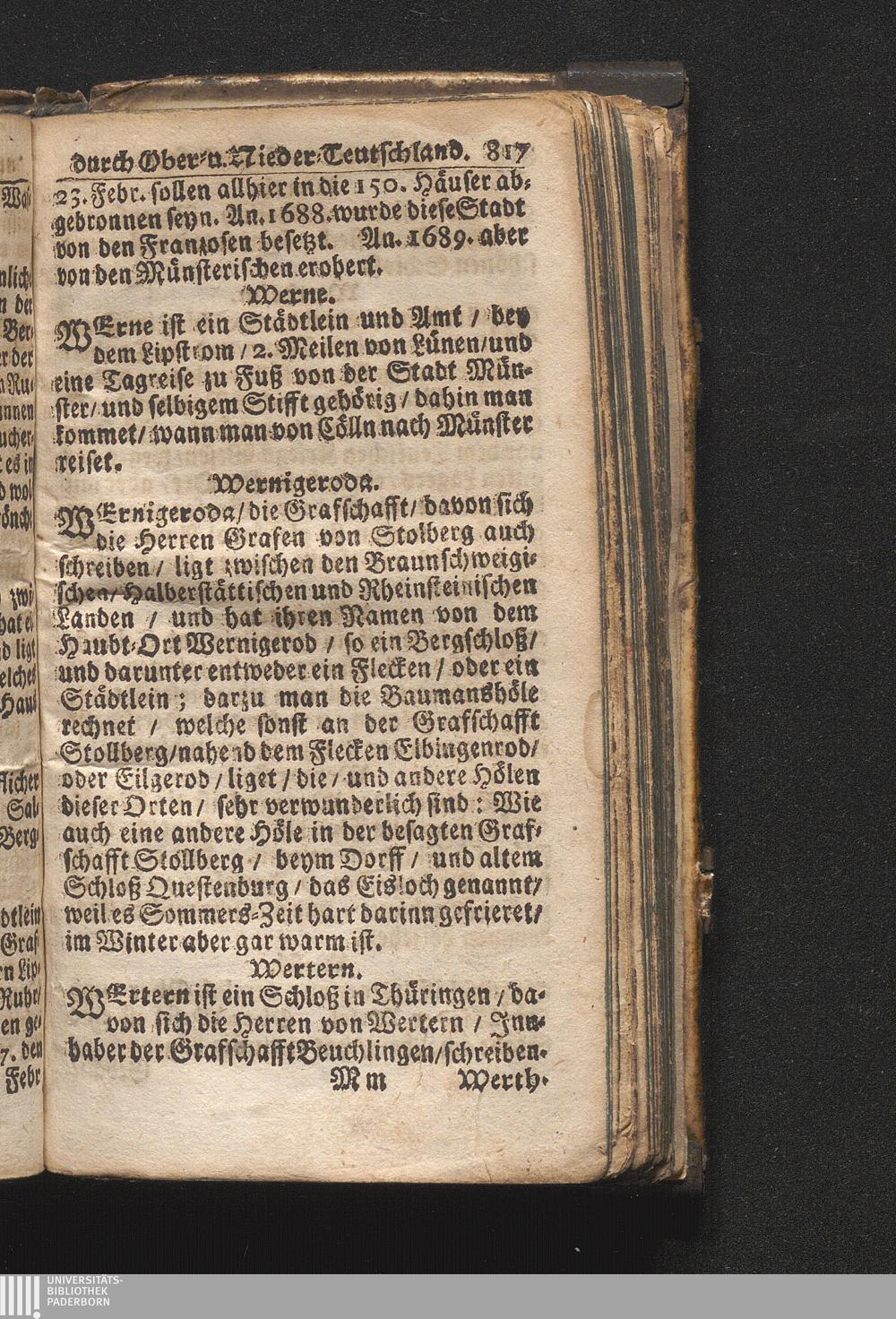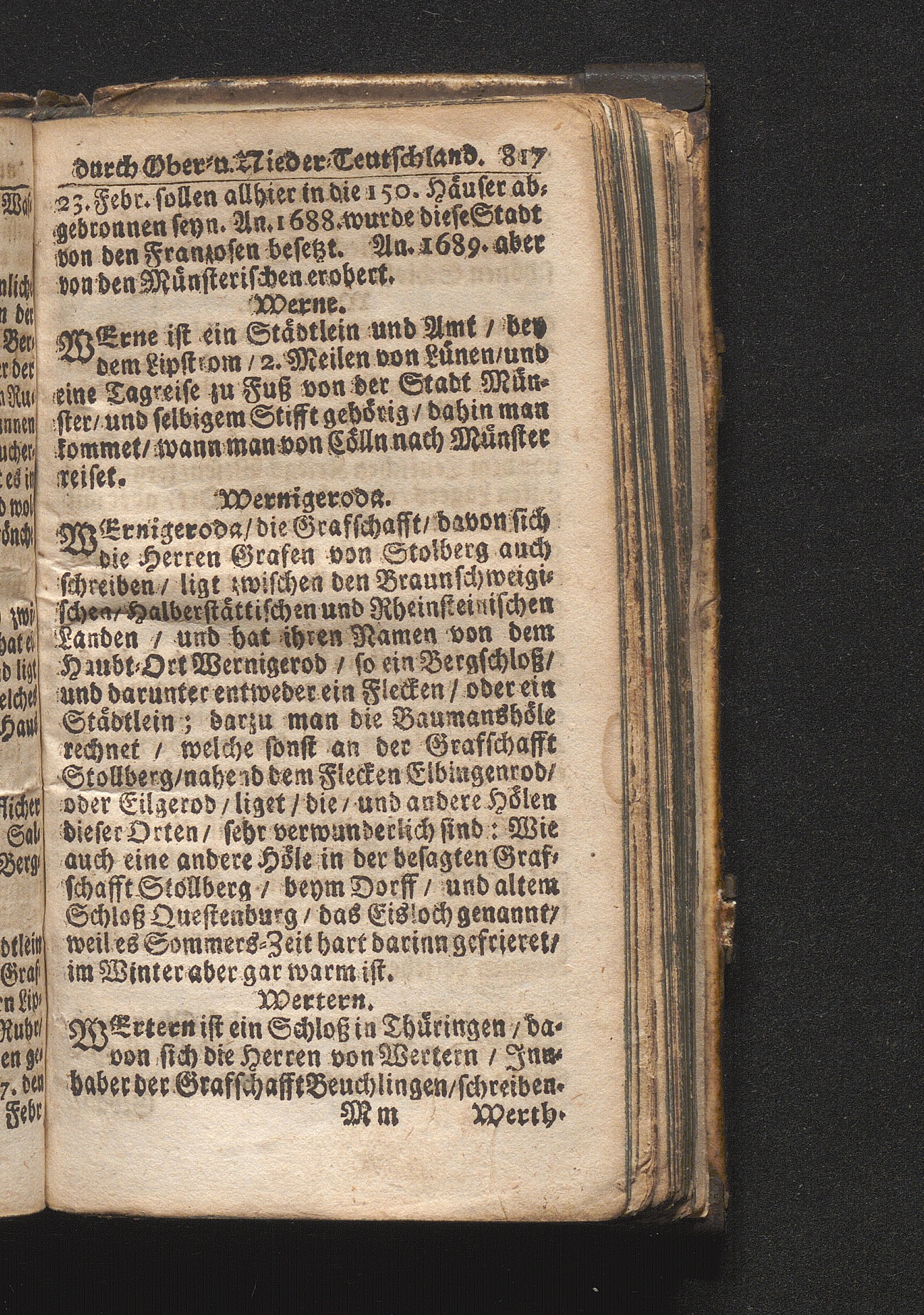 Der getreue Reiß-Gefert durch Ober- und Nieder-Teutschland : Das ist: Grundrichtige und ausführliche Abhandlung derer jenigen Residenzien/ Städte/ Schlösser/ Vestungen/ Städtlein und nahmhafften Markflecken/ welche so wol in Ober- als Nieder-Teutschland/ einem Reisenden sich hin und wieder vorstellig machen und zwar solcher Gestalt/ daß darinn derer Ursprung/ Aufnahm/ Fortification/ Raritäten/ herrliche Gebäue/ und Glück- und Unglücks-Fälle bis auf gegenwärtige Zeit fortgesetzt enthalten. Dabey auch noch über das ein absonderlicher kurz-gefasster Weegweiser angehänget zu finden/ worinnen klärlich zu sehen, wie viel Meilen ein Ort von dem andern entlegen. Alles aus denen bewährtesten Scribenten hervorgesuchet/ zum Nutz-Ergötzen mitgetheilet ...