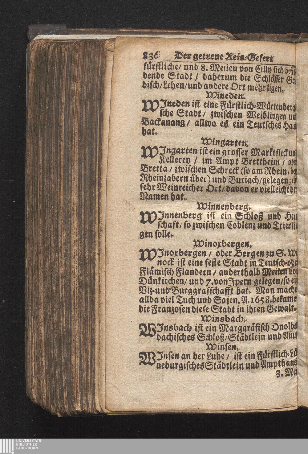 Der getreue Reiß-Gefert durch Ober- und Nieder-Teutschland : Das ist: Grundrichtige und ausführliche Abhandlung derer jenigen Residenzien/ Städte/ Schlösser/ Vestungen/ Städtlein und nahmhafften Markflecken/ welche so wol in Ober- als Nieder-Teutschland/ einem Reisenden sich hin und wieder vorstellig machen und zwar solcher Gestalt/ daß darinn derer Ursprung/ Aufnahm/ Fortification/ Raritäten/ herrliche Gebäue/ und Glück- und Unglücks-Fälle bis auf gegenwärtige Zeit fortgesetzt enthalten. Dabey auch noch über das ein absonderlicher kurz-gefasster Weegweiser angehänget zu finden/ worinnen klärlich zu sehen, wie viel Meilen ein Ort von dem andern entlegen. Alles aus denen bewährtesten Scribenten hervorgesuchet/ zum Nutz-Ergötzen mitgetheilet ...
